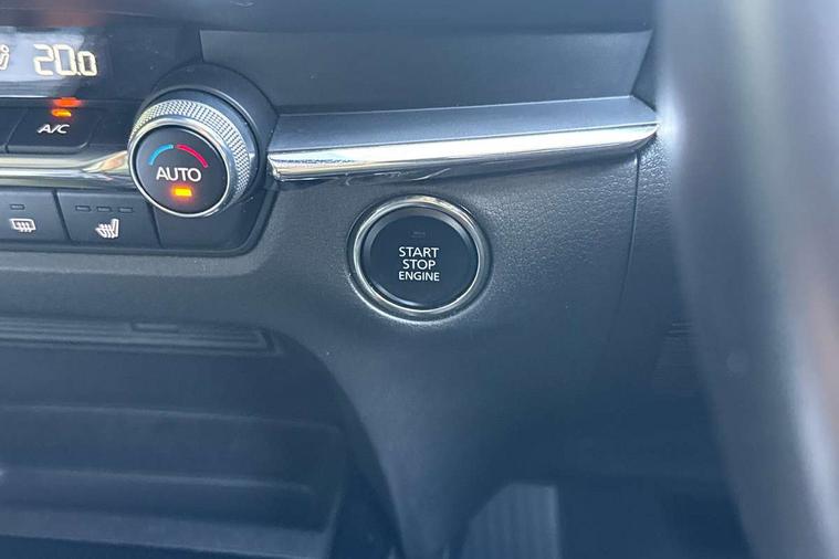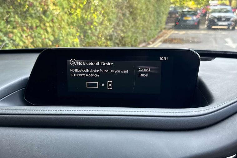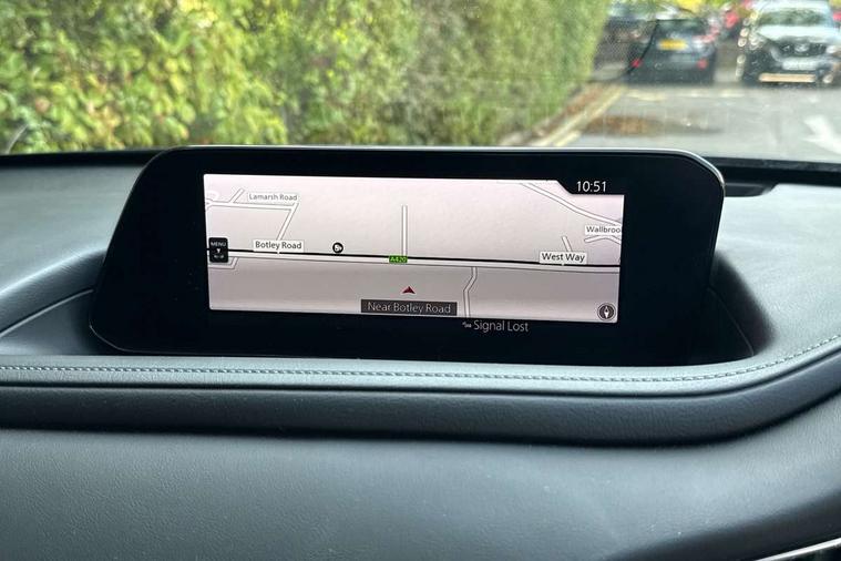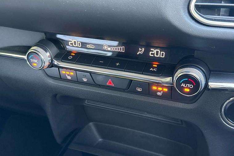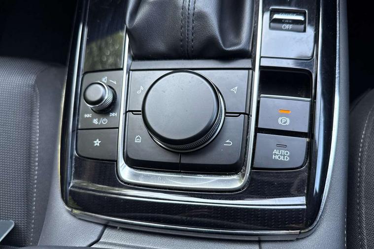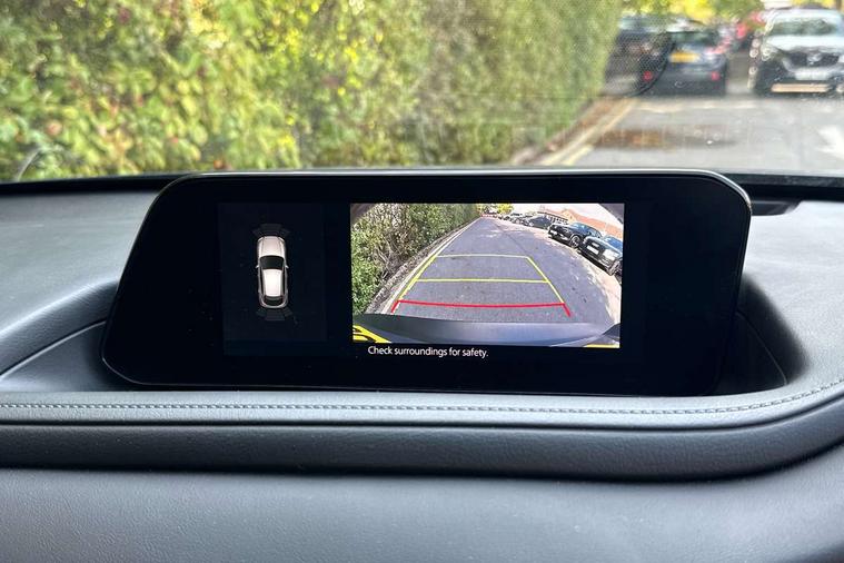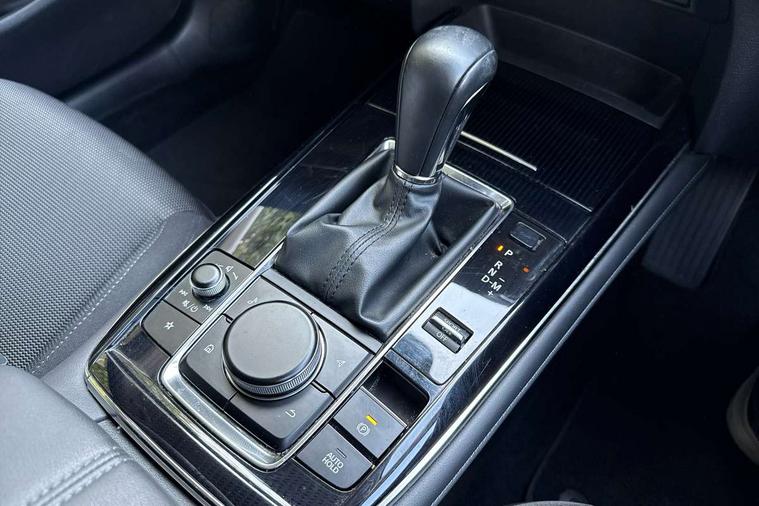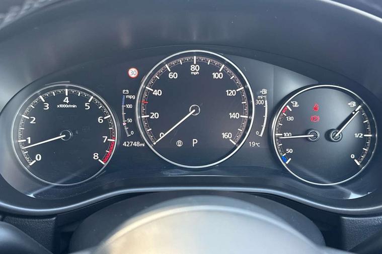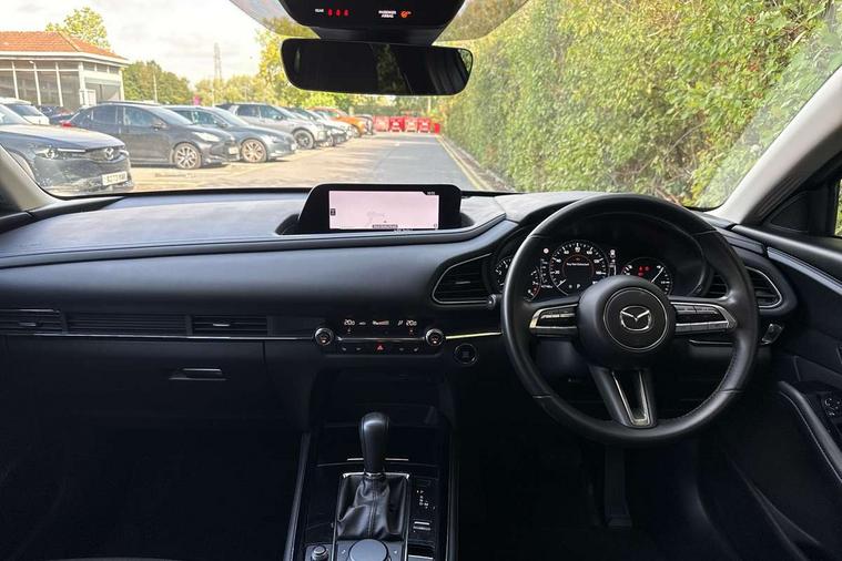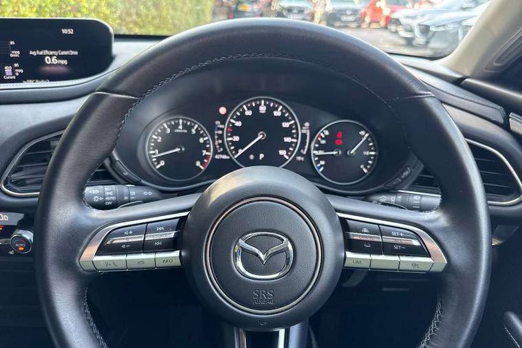 7" TFT Colour driver instrument panel display, 8.8" Colour centre touch screen display with Mazda Connect infotainment, Adaptive cruise control (Mazda radar cruise control) features stop and go, Apple car play/Android Auto, Blind spot monitoring with rear cross traffic alert, Drive mode selector, Driver attention alert system, E-call with GPS, Emergency stop signalling system, Engine start/stop button, Front and rear parking sensors, Integrated bluetooth, Integrated Mazda navigation system, Intelligent speed assist, Lane keep assist system (LAS) with Lane departure warning system (LDWS), PAS, Power lift gate, Reversing camera, Service indicator, Trip computer, Window projected colour active driving display (head up display) with traffic sign recognition, Cylinder Deactivation, i-stop, 2 USB charging ports, AM / FM / DAB radio with 8 speakers, Multimedia Commander including separate volume dial, Steering wheel mounted audio/bluetooth controls, Adaptive LED Headlights, Auto dimming driver's door mirror, B-pillar and C-pillar garnishes in piano black finish, Body coloured, electrically adjustable, heated auto power folding door mirrors with integrated indicators, Coming/leaving home lighting function, Dual chrome exhaust, Dusk sensing headlights, Electric front/rear windows with one touch auto up/down, Frameless auto dimming interior rear view mirror, Front grille in piano black finish, Front kodo turn signal, High beam assist, Piano black rear roof spoiler, Privacy glass (rear side windows and rear screen), Rain sensing front wipers with adjustable speed and intermittent wipe, Rear fog lights, Rear wiper, Signature front LED daytime running lights, Signature LED rear combination lights with LED rear turn lights, 60/40 split fold down rear seats, Chrome centre bezel steering wheel, Chrome horn pad ring, Cloth door panel inserts, Cloth upholstery with interior accents, Dashboard, door cards and front centre armrest in navy blue cloth, Driver and front passenger visors with covered vanity mirror and driver ticket holder, Driver seat manual slide, recline and height adjust, Driver, Front passenger and two rear grab handles with coathooks, Dual zone climate control air conditioning with rear air vents, Electrical power outlet, Folding rear centre armrest with two cup holders, Front and rear (x3) head restraints, Front and rear door pockets, Front and rear LED lighting, Front armrest, Front centre storage with two cupholders, Front passengers seat manual slide, recline and height adjustment, Glove box handle with chrome surround, Glovebox illumination, Heated front seats with 3 stage setting, ISOFIX child seat anchorage points attached on outer rear seats, Leather wrapped gear shift knob, Leather wrapped steering wheel with telescopic and tilt adjustment, Luggage compartment light, Paddle shift controls, Rear passenger seat map pockets, Roof mounted sunglasses holder, 3 point ELR front seat belts x2 with pretensioners, 3 point ELR rear seat belts, Anti-lock braking system (ABS), Driver/Front Passenger airbags, Drivers knee airbag, DSC - Dynamic Stability Control, Electronic parking brake with auto disengage function and auto hold function, Front and rear curtain airbags, Front passenger airbag cut-off switch, Front side airbags, Front smart city brake support, G-Vectoring control plus, Hill launch assist, Mild Hybrid system with regenerative braking, Seatbelt reminder for driver/front passenger and rear seats, Traction control system (TCS), Tyre pressure monitoring system (TPMS), Remote central locking with deadlocking and automatic door lock when driving, Smart keyless entry, Thatcham accredited alarm and immobiliser, 18" Silver metallic alloy wheels, Emergency tyre repair kit,