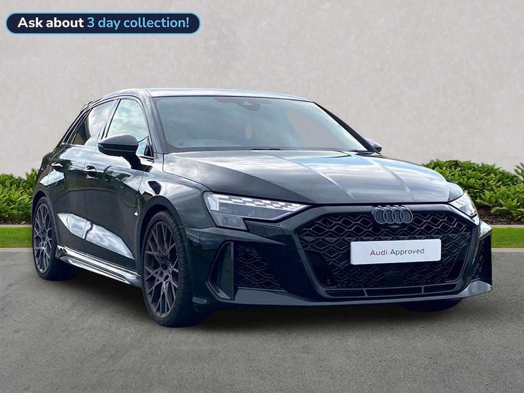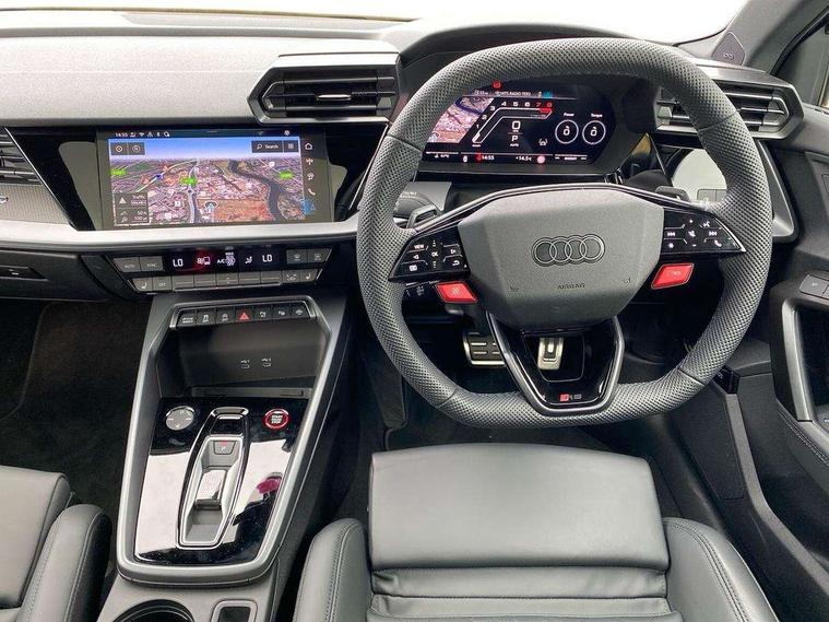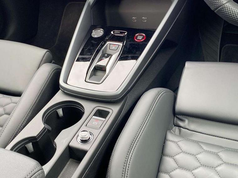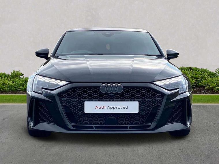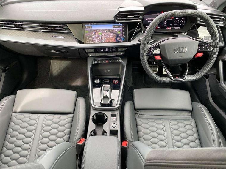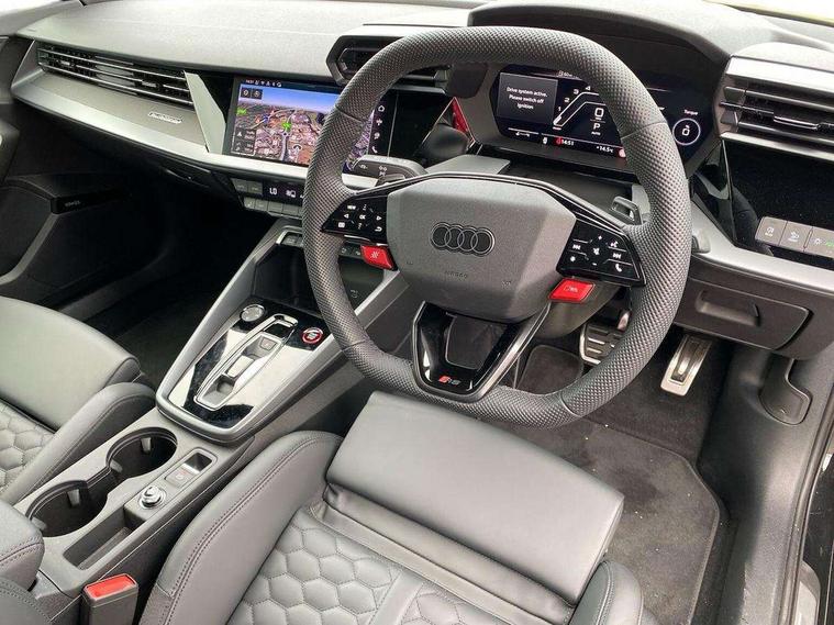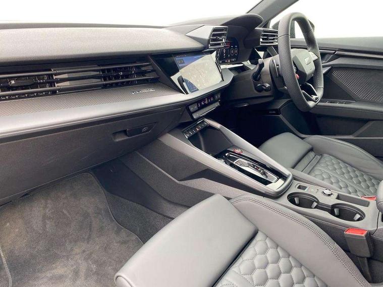 Adjustable speed limiter, Audi drive select comfort, auto, dynamic and efficiency, Audi smartphone interface with app store includes wireless Apple carplay, Android auto and Amazon alexa integration, Audi virtual cockpit plus with RS specific design and 12.3" display with additional graphic display options, Automatic start/stop system with recuperation, Bluetooth interface, Camera based traffic sign recognition, Collision avoidance assistant, Distraction and Fatigue warning, e-Call (emergency call), Lane departure warning system, MMI Navigation Plus with high resolution 10.1" colour touch screen display, Park Assist with parking system Plus, Progressive steering, RS specific driving modes - RS Individual, RS Performance and RS Torque rear, Voice control system with natural language interaction, Quattro permanent four wheel drive, Audi Phonebox light with wireless charging, DAB Digital radio, USB ports with charging function in the rear, All weather light, Audi beam LED projection of RS logo on ground as you exit, Audi darkened matrix LED headlights with dynamic light sequencing and dynamic indicator, Auto dimming frameless rear view mirror, Automatic dynamic range control, Carbon door mirror housings, Carbon fibre engine cover, Dipped beam, main beam, position light and turning light, Dynamic RS specific light sequencing of the coming home and leaving home function, Electrically adjustable/heated/folding/auto dimming door mirrors with integrated LED indications + kerb view function for passenger side, Exterior model badging, Front electric windows, Headlight cleaning system, Heat insulating glass windscreen, Intersection light, LED 3rd brake light, LED brake lights, LED daytime running x3, LED rear lights with dynamic light sequencing and dynamic indicator, LED rear number plate lights, LED reverse light, LED tail lights, Light and rain sensors, Manoeuvring light, Motorway light, Privacy glass - dark tinted rear window, rear door and side windows, Rear electric windows, Rear side wing doors, Rear wiper, Roof edge spoiler in carbon, RS dual branch exhaust system with two chrome plated oval tailpipe trims, Static Cornering lights, Visually upgraded RS specific daytime running light choice of 4 digital signature in chequered flag design within the headlight, 12V socket and storage compartment in front centre console, 3 seat bench in 2nd row, 3 Spoke flat top and bottomed black leather multi function steering and gear shift paddles, 3-zone deluxe automatic air conditioning, 40/20/40 split folding rear seat bench, Black cloth headlining, Front and rear headrests, Front centre armrest, Front door sill trims with RS 3 logo, Front sports seats RS embossed logo, Front/rear floor mats, Heated front seats, Height and reach adjustable steering wheel, Manual boot compartment lid, Manually adjustable front seats, Rear centre armrest with cupholder, Seat side bolsters, Single front passenger seat, Stainless steel pedals and front footrest in black, Vanadium look - Interior door handles, Door trim, power latching, Air vents, window controls, mirror adjust, rear door lock, Selector lever in centre console, Black Styling plus package - RS3, Extended ambient lighting package Pro with Multi-coloured contour lighting of instrument panel - RS3, RS exterior features pack in carbon and gloss black - RS3, RS sport suspension pack - RS3, Storage package - RS3 Sportback, Technology package without speed limiter - RS3, 3x3 point rear seat belts, Driver and front passenger airbag with passenger airbag deactivation, Electronic Stabilisation Control (ESC) including ABS, ASR and EDL, First aid kit with warning triangle and 2 safety vests, Hill hold assist, Pre-sense front with pedestrian and cyclist detection, RS steel brakes, Seatbelt monitoring, Tyre pressure loss indicator, Anti theft alarm, Anti-theft wheel bolts, Electronically operated child locks, Remote central locking with safelock, Inlays in carbon atlas structure, 19" 10 cross spoke silk matt grey alloy wheels, Tyre repair kit,