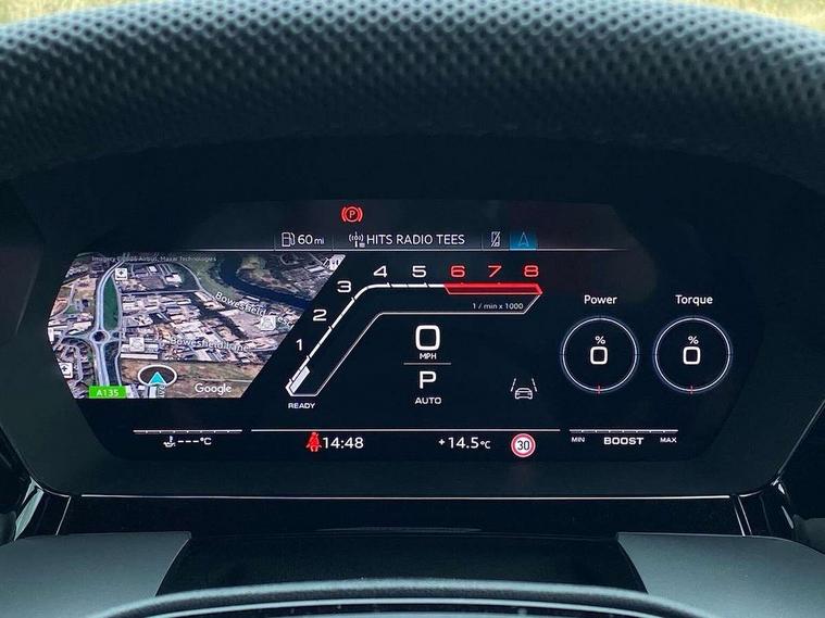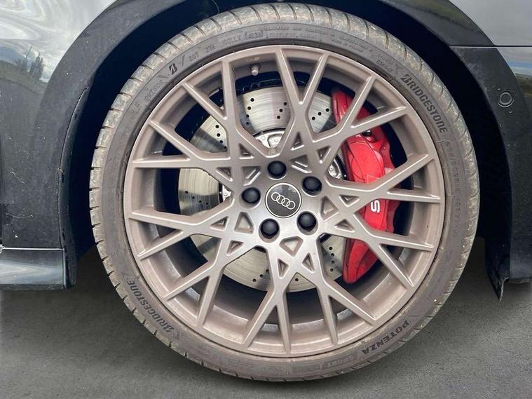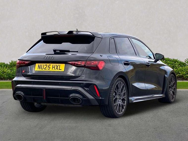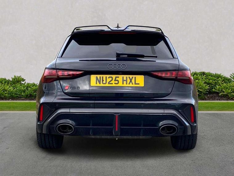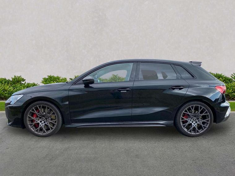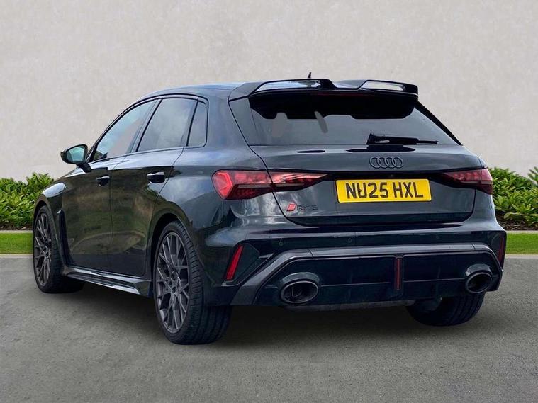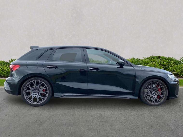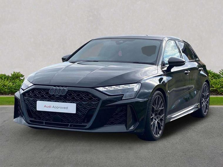 Adjustable speed limiter, Audi drive select comfort, auto, dynamic and efficiency, Audi smartphone interface with app store includes wireless Apple carplay, Android auto and Amazon alexa integration, Audi virtual cockpit plus with RS specific design and 12.3" display with additional graphic display options, Automatic start/stop system with recuperation, Bluetooth interface, Camera based traffic sign recognition, Collision avoidance assistant, Distraction and Fatigue warning, e-Call (emergency call), Lane departure warning system, MMI Navigation Plus with high resolution 10.1" colour touch screen display, Park Assist with parking system Plus, Progressive steering, RS specific driving modes - RS Individual, RS Performance and RS Torque rear, Voice control system with natural language interaction, Quattro permanent four wheel drive, Audi Phonebox light with wireless charging, DAB Digital radio, USB ports with charging function in the rear, All weather light, Audi beam LED projection of RS logo on ground as you exit, Audi darkened matrix LED headlights with dynamic light sequencing and dynamic indicator, Auto dimming frameless rear view mirror, Automatic dynamic range control, Carbon door mirror housings, Carbon fibre engine cover, Dipped beam, main beam, position light and turning light, Dynamic RS specific light sequencing of the coming home and leaving home function, Electrically adjustable/heated/folding/auto dimming door mirrors with integrated LED indications + kerb view function for passenger side, Exterior model badging, Front electric windows, Headlight cleaning system, Heat insulating glass windscreen, Intersection light, LED 3rd brake light, LED brake lights, LED daytime running x3, LED rear lights with dynamic light sequencing and dynamic indicator, LED rear number plate lights, LED reverse light, LED tail lights, Light and rain sensors, Manoeuvring light, Motorway light, Privacy glass - dark tinted rear window, rear door and side windows, Rear electric windows, Rear side wing doors, Rear wiper, Roof edge spoiler in carbon, RS dual branch exhaust system with two chrome plated oval tailpipe trims, Static Cornering lights, Visually upgraded RS specific daytime running light choice of 4 digital signature in chequered flag design within the headlight, 12V socket and storage compartment in front centre console, 3 seat bench in 2nd row, 3 Spoke flat top and bottomed black leather multi function steering and gear shift paddles, 3-zone deluxe automatic air conditioning, 40/20/40 split folding rear seat bench, Black cloth headlining, Front and rear headrests, Front centre armrest, Front door sill trims with RS 3 logo, Front sports seats RS embossed logo, Front/rear floor mats, Heated front seats, Height and reach adjustable steering wheel, Manual boot compartment lid, Manually adjustable front seats, Rear centre armrest with cupholder, Seat side bolsters, Single front passenger seat, Stainless steel pedals and front footrest in black, Vanadium look - Interior door handles, Door trim, power latching, Air vents, window controls, mirror adjust, rear door lock, Selector lever in centre console, Black Styling plus package - RS3, Extended ambient lighting package Pro with Multi-coloured contour lighting of instrument panel - RS3, RS exterior features pack in carbon and gloss black - RS3, RS sport suspension pack - RS3, Storage package - RS3 Sportback, Technology package without speed limiter - RS3, 3x3 point rear seat belts, Driver and front passenger airbag with passenger airbag deactivation, Electronic Stabilisation Control (ESC) including ABS, ASR and EDL, First aid kit with warning triangle and 2 safety vests, Hill hold assist, Pre-sense front with pedestrian and cyclist detection, RS steel brakes, Seatbelt monitoring, Tyre pressure loss indicator, Anti theft alarm, Anti-theft wheel bolts, Electronically operated child locks, Remote central locking with safelock, Inlays in carbon atlas structure, 19" 10 cross spoke silk matt grey alloy wheels, Tyre repair kit,