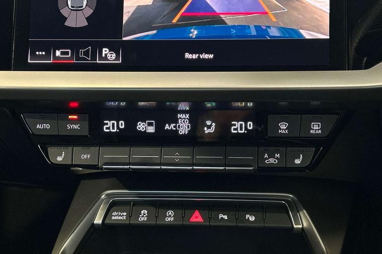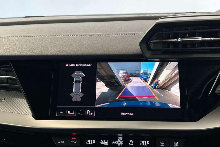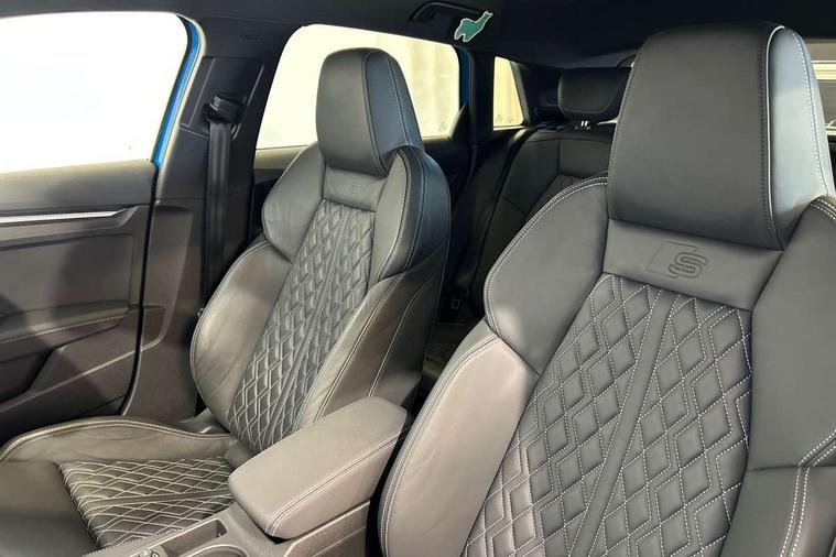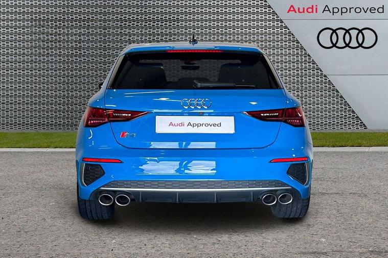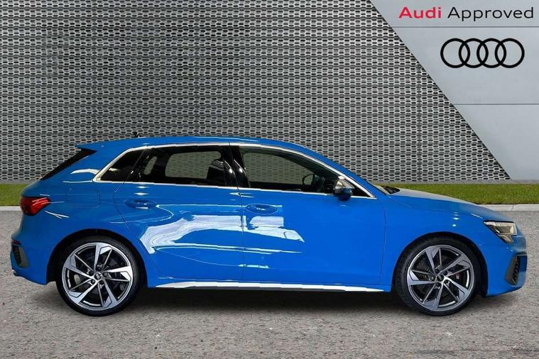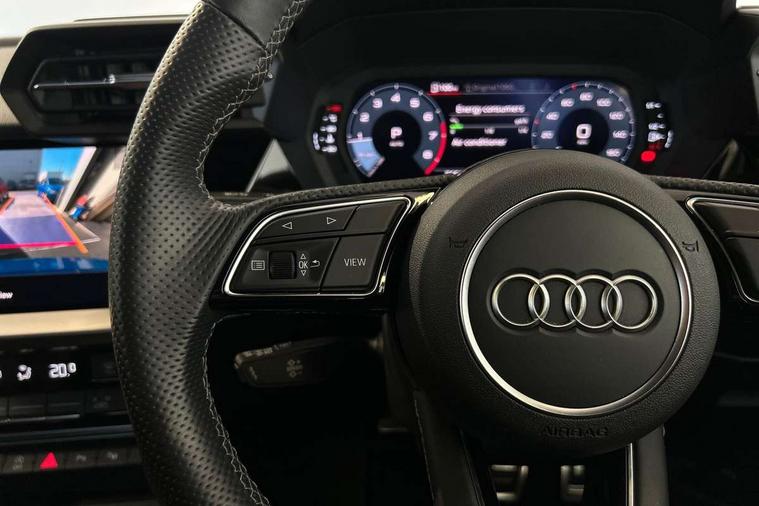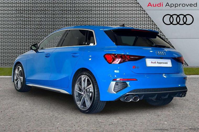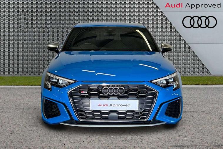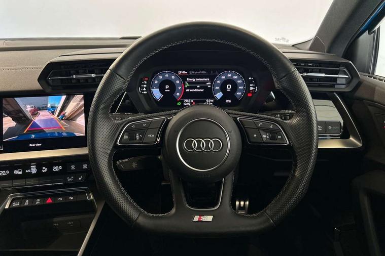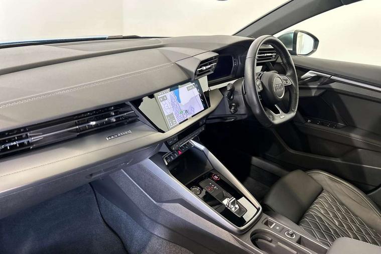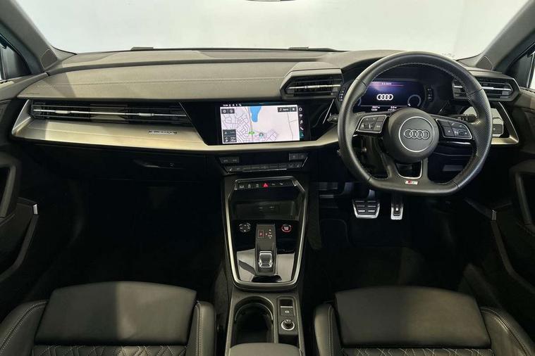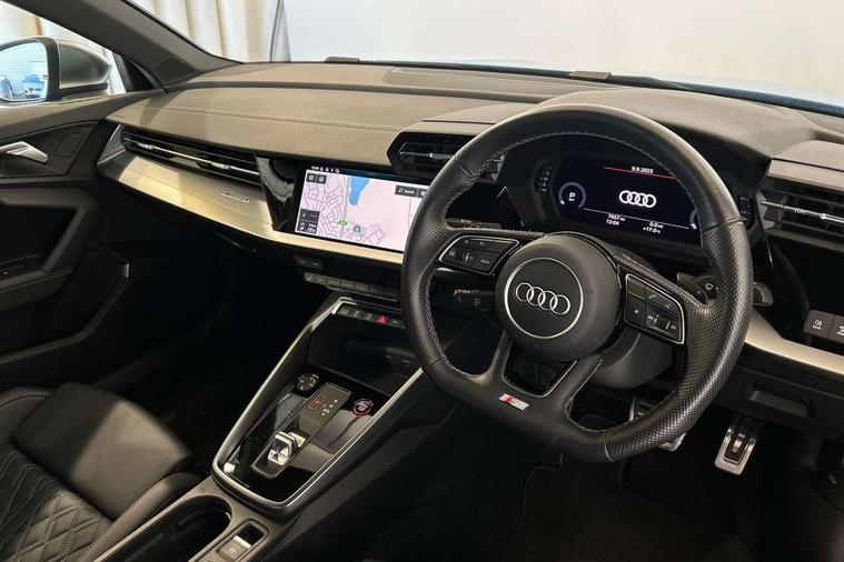 Audi connect emergency call and service, Audi drive select (Auto, Comfort, Dynamic, Efficiency and Individual), Audi smartphone interface, Audi Virtual Cockpit - 10.25" digital and colour instrument cluster, Automatic start/stop system with recuperation, Bluetooth interface, Collision avoidance assistant, Lane departure warning system, MMI Navigation Plus with high resolution 10.1" colour touch screen display, Progressive steering, Service indicator, Trip computer, Voice control system with natural language interaction, Quattro permanent all wheel drive, S sports suspension, 2xUSB-C connection with data and charging functions, 6 passive loudspeakers, DAB Digital radio, Acoustic glass windscreen, Aluminium window trim, Audi Beam uses LEDs to project the Audi S3 logo, Auto dimming frameless rear view mirror, Dual branch oval twin tailpipes in chrome plated finish, Exterior mirror with aluminium look housing, Front electric windows, Illuminated aluminium inserts front door sills with S logo, LED daytime running lights, Light and rain sensors, Privacy glass - dark tinted rear window, rear door and side windows, Rear electric windows, Rear side air outlets in grained matt black, Rear wiper, 12V socket and storage compartment in front centre console, 3 spoke flat bottomed multifunction plus sports contour leather wrapped steering wheel with shift paddles, 40/20/40 split folding rear seat bench with cupholder, Black cloth headlining, Dual zone electronic climate control, Front and rear centre armrest in leather, Front and rear headrests, Front/rear floor mats, Heated front seats, Height and reach adjustable steering wheel, Interior lighting - glove compartment light and right hand side, Luggage compartment floor covering, Seat side bolsters, Stainless steel pedals and front footrest, Aluminium interior elements pack - A3 Sportback, Design body styling - A3 Sportback, Storage pack - A3 Sportback, 3x3 point rear seat belts, Driver and front passenger airbag with passenger airbag deactivation, Electronic Stabilisation Control (ESC) including ABS, ASR and EDL, First aid kit with warning triangle and 2 safety vests, Front side airbags with head airbags and interaction airbag, Hill hold assist, Pre-sense front with pedestrian and cyclist detection, Seatbelt monitoring, Tyre pressure loss indicator, Anti theft alarm, Anti-theft wheel bolts, Electronically operated child lock, Immobiliser, Remote control central locking, Accent surfaces in the dashboard and centre console in platinum grey silk effect paint finish, Dark spectrum aluminium inlays,