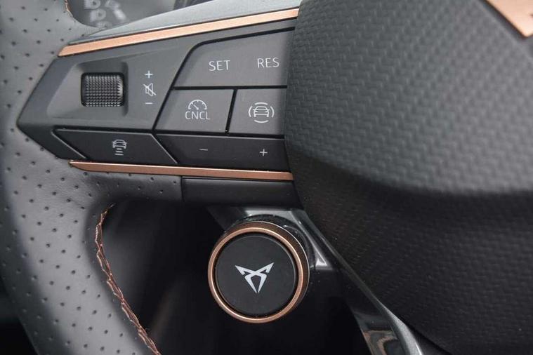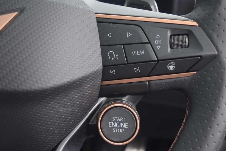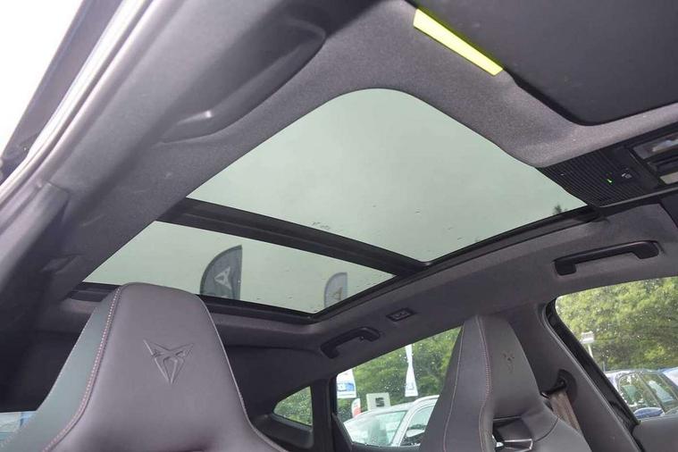10.25" digital cockpit and configurable dashboard, Adaptive cruise control with follow-to-stop and speed limiter, Advanced driver alert system, Advanced lane assist with semi-automatic vehicle control in a medical emergency and traffic jam assist, Dynamic chassis control with driving profile selection (Comfort, Sport, CUPRA, Individual), Dynamic road sign display, Emergency steering support with turn assist, Forward collision warning with automatic braking, Full link phone integration, Intelligent park assist, RPM, trip computer, outside temp gauge, instrument light brightness, low fuel warning light, lights on reminder, gearshift indicator, Service interval indicator, Side and exit assist, Speed sensitive power steering, Start/stop system with regenerative braking, Top view camera, Virtual pedal and electric tailgate, Voice control system, Wired Android Auto, Wireless apple carplay, Wireless phone charger, Adaptive chassis control with continuous operation, CUPRA sport suspension, Electronic locking differential and dynamic traction support, 2 front and 2 rear USB type C sockets, Media system with navigation, 12.9" touchscreen display, voice control, DAB, steering wheel mounted controls, Auto dimming rear view mirror, Body colour door handles, Body coloured bumpers, Dark grey wing mirror, Daytime running light with automatic headlight control and coming home feature, Door panel ambient lighting, Dynamic headlight range control, Electric front/rear windows, Electrically adjustable heated and folding door mirrors with memory function, Gloss black roof rails and window surrounds, High beam assist, LED 3rd brake light, LED front fog lamps with cornering function, LED Taillights with dynamic indicator, Matrix LED headlights with multifunction camera, Rain sensing wipers, Rear diffuser with twin exhaust pipe on each side, Rear fog lights, Rear side wing doors, Rear wash/wipe, Tinted rear windows, Welcome lights (within exterior mirror housing), 12V socket, 2 front and 2 rear reading lights, 3 seat bench in 2nd row, 60/40 split rear bench seat with armrest and mechanical seat release, Black headlining, Black interior roof lining, Cupra sports pedals, Dust/pollen filter, Electrically adjustable front seats with lumbar support and memory function, Front and rear head restraints, Front centre armrest, Heated front seats, Heated supersports multifunction leather steering wheel with satellite buttons and gear shift paddles, Height/reach adjust steering wheel, Illuminated aluminium doorsteps, Illuminated interior front door sills, Illuminated sunvisor with mirror, Isofix, Leather dashboard, door insert and side trim panel, LED smart wraparound lighting, PVC/Leather upholstery, Satellite steering wheel, Single front passenger seat, Storage pockets on rear of front seats, Three zone climate control with control panel in rear, Variable luggage/load compartment floor, 3 point seatbelts on all rear seats, ABS, Brake control system - ESC and brake booster, Child proof door locks, Driver and front passenger airbags with front passenger airbag de-activation, Electronic parking brake, Front and rear disc brakes, Front side curtain airbags, Hill hold control, Pre-crash front and rear seat belt tensioner, window closure and hazard lights, Public e-call, Seat belt reminder for front and rear seats, Tyre pressure monitoring system, Anti theft alarm system, KESSY Advanced - Keyless start, keyless entry with SAFELOCK, Locking wheel bolts, Copper and aluminium interior detailing, 19" Artic machined sport black and silver alloy wheels, Breakdown and tool kit,