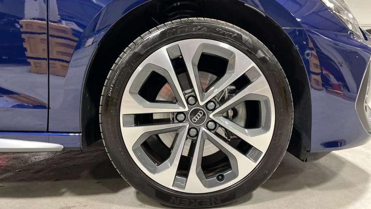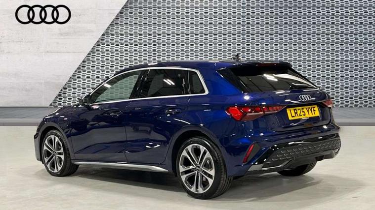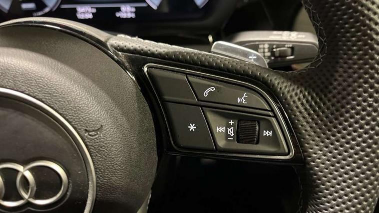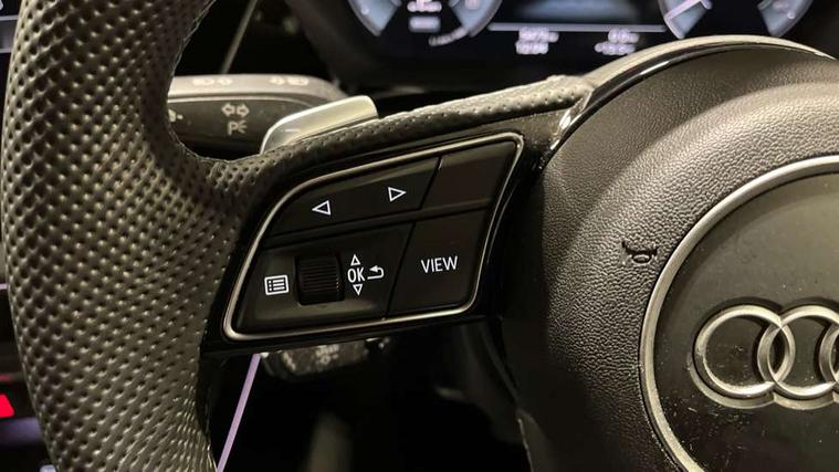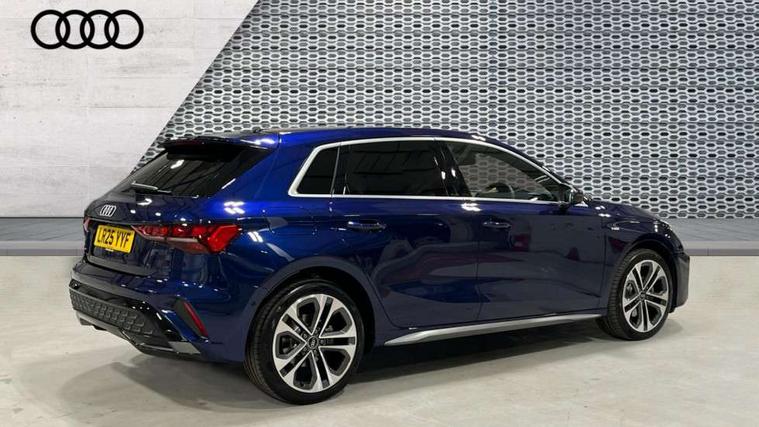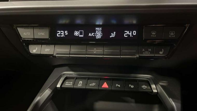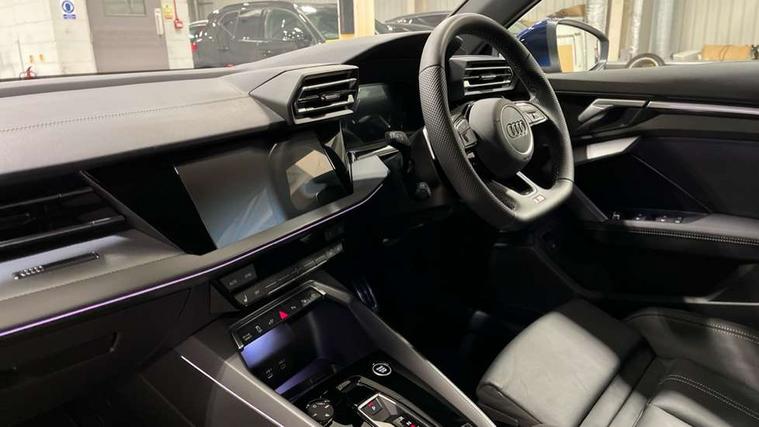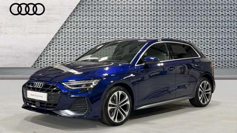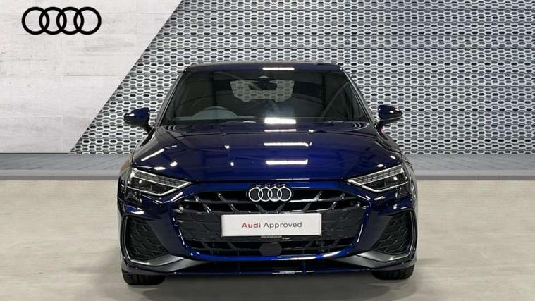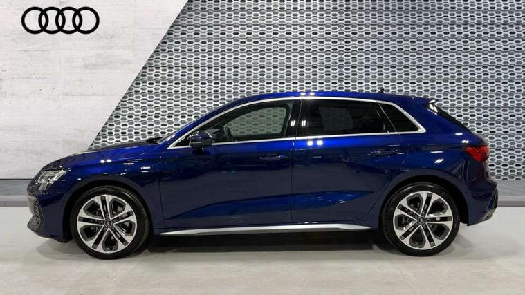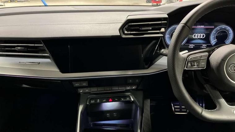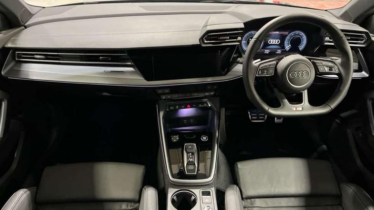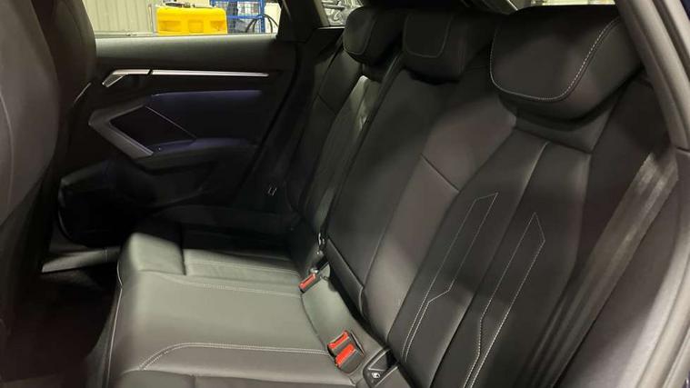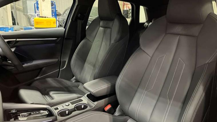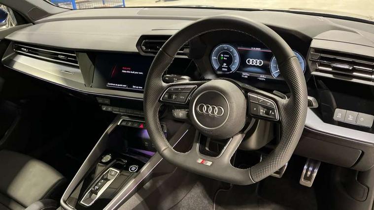 Adjustable speed limiter, Audi drive select, Audi smartphone interface with app store includes wireless Apple carplay, Android auto and Amazon alexa integration, Audi virtual cockpit plus - 12.3" full HD resolution dynamic digital instrument cluster, Automatic start/stop system with recuperation, Bluetooth interface, Camera based traffic sign recognition, Collision avoidance assistant, Cruise control, Distraction and Fatigue warning, e-Call (emergency call), Electromechanical power speed sensitive steering, Lane departure warning system, MMI Navigation Plus with high resolution 10.1" colour touch screen display, Park Assist with parking system Plus, Service indicator, Trip computer, Voice control system with natural language interaction, 3 pin 10 amp domestic charging cable, CCS socket for DC charging, Charging cable for public charging, mode 3 (type 2), up to 22 kW (AC), Compact charging system, Industrial connector CEE 32 A, 230 V, length 1.6 m, Standard suspension, Type 2 socket for AC charging, Audi Phonebox light with wireless charging, Audi sound system - 10 loudspeakers including centre loudspeaker and subwoofer, DAB Digital radio, USB ports with charging function in the rear, Acoustic glass windscreen, Aluminium window trim, Auto dimming frameless rear view mirror, Body colour exterior mirrors, Chrome exhaust tailpipes, Electrically adjustable/heated/folding/auto dimming door mirrors with integrated LED indications + kerb view function for passenger side, Exterior model badging, Front and rear side air inlets in grained matt black with dark liquid chrome frame, Front electric windows, Front radiator grill in high gloss dark chrome, Heat insulating glass windscreen, Illuminated door sills with aluminium inserts at the front with S logo, LED 3rd brake light, LED daytime running lights, LED headlights with LED rear lights and dynamic rear indicators, Light and rain sensors, Privacy glass - dark tinted rear window, rear door and side windows, Rear diffuser and grill in grained matt black with inlay in dark liquid chrome, Rear electric windows, Rear side wing doors, Rear wiper, S line bumpers, S roof spoiler, Side S line emblems on front wings, Side sill trim in dark liquid chrome, 12V socket and storage compartment in front centre console, 3 seat bench in 2nd row, 3 spoke flat bottomed leather multifunction sport steering wheel with gear shift paddles, 3-zone deluxe automatic air conditioning, 4 way electrically adjustable lumbar support for driver and front passenger, 40/20/40 split folding rear seat bench, Black cloth headlining, Convenience auxiliary air conditioning, Front and rear centre armrest in artificial leather, Front and rear centre armrest in artificial leather with contrasting stitching on armrests and instrument panel, Front and rear headrests, Front/rear floor mats, Heated front seats, Height and reach adjustable steering wheel, Manual boot compartment lid, Manually adjustable front seats, Rear cup holders, S badging on the steering wheel, Seat side bolsters, Single front passenger seat, Stainless steel pedals and front footrest in black, Twin leather upholstery with front sports seats S embossed logo, Aluminium interior elements pack - A3 Sportback, Multi-coloured LED interior lighting package - A3, 3x3 point rear seat belts, Acoustic vehicle alerting system, Driver and front passenger airbag with passenger airbag deactivation, Electronic Stabilisation Control (ESC) including ABS, ASR and EDL, First aid kit with warning triangle and 2 safety vests, Front side airbags with head airbags and interaction airbag, Hill hold assist, Pre-sense front with pedestrian and cyclist detection, Seatbelt monitoring, Tyre pressure loss indicator, Anti theft alarm, Anti-theft wheel bolts, Electronically operated child locks, Immobiliser, Remote central locking with safelock, Dash & door Inlay in dark aluminium Spectrum, Tyre repair kit,