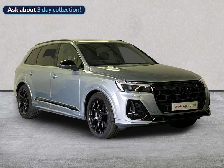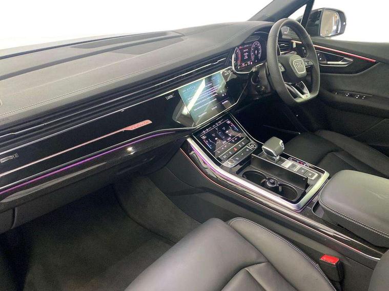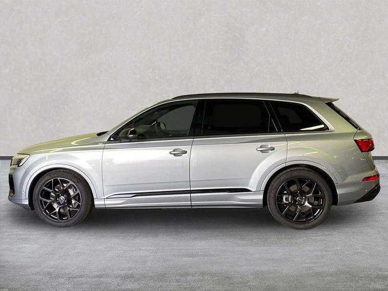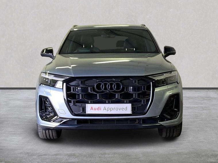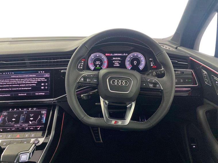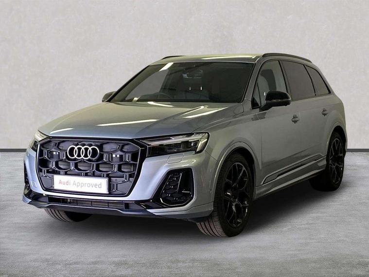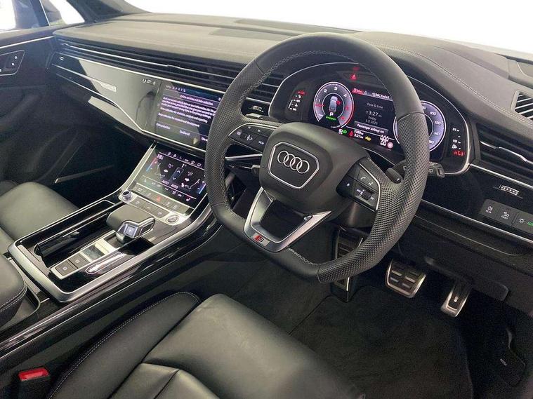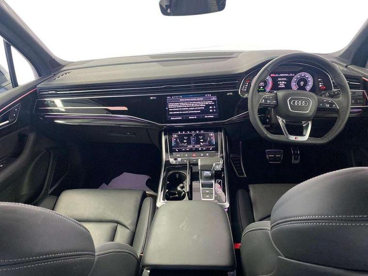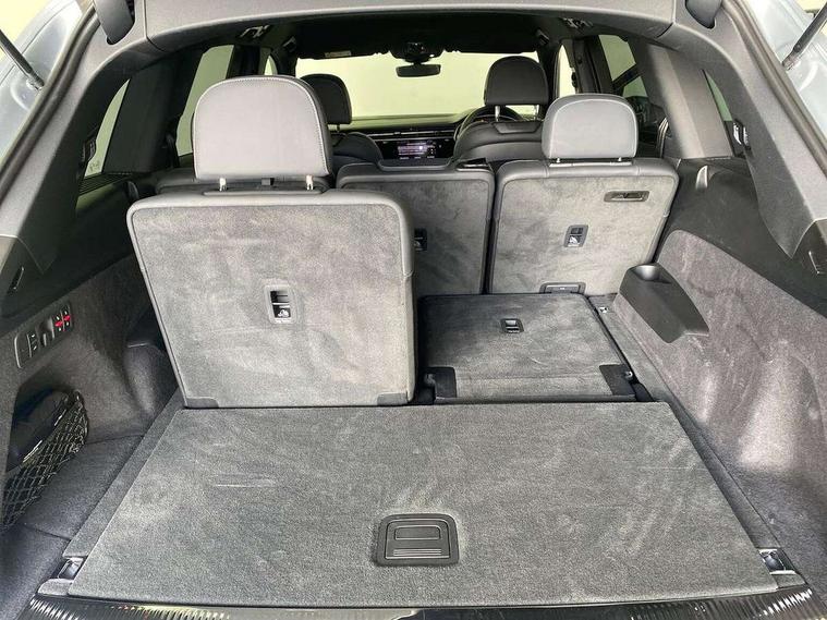 Audi connect safety and service (e-call), Audi connect with Amazon Alexa Integration, Audi drive select (Auto, Comfort, Dynamic, Efficiency, Individual, Off-road and All road), Audi phone box light with wireless charging, Audi virtual cockpit - 12.3" high-resolution LCD display with fully customisable instrument cluster, Bluetooth interface, Camera based traffic sign recognition, Electromechanical power steering, MMI navigation plus with MMI touch screens includes 10.1" and 8.6" screens with haptic feedback, Natural voice recognition, Operating buttons in Matte black, Parking system plus with 360 degree display (front, rear and side sensors) - acoustic and visual park assist system, Power operated tailgate, Rear view camera, Smartphone interface includes wireless Apple carplay/Android Auto, Start/stop system, 48V Mild hybrid technology, Adaptive air sports suspension, Quattro all wheel drive with self locking centre differential, Audi music interface - front 2 USB-C ports with charger and data functions, Audi sound system with 6 channel amplifier, 180 watt amplifying capacity and 10 loudspeakers including subwoofer, DAB digital radio module, Audi Beam uses LEDs to project S emblem with red rhombus onto the ground when opening the side doors (front/rear), Auto dimming frameless rear view mirror, Black exhausts, Black roof rails, Electrically adj heated/folding + automatically dimming exterior mirrors with memory + automatic kerb side function for passenger side exterior mirror, Heat insulating glass in windshield, Integrated LED indications in door mirrors, LED 3rd brake light, LED daytime running lights, LED rear tail lights, Loading edge protection in stainless steel, Matrix LED headlights with dynamic front and rear indicators, Privacy glass - dark tinted rear and rear side windows from B-pillar backwards, Rear side wing doors, Rear wiper, 2 seat bench in 3rd row, 2 zone automatic climate control, 3 seat bench in 2nd row, 7 seat layout with ISOFIX points for the front passenger seat and rear passenger seat, Black cloth headlining, Comfort front centre armrest, Electric adjustable front seat with 4 way lumbar support, driver memory functionality, Folding rear seats, Front head restraints, Front/rear floor mats, Heated front seats, Illuminated door sill trims with S logo, ISOFIX child seat mounting for front passenger seat and 2 outer rear seats with top tether child seat mounting for all 3 rear seats, LED interior ambient lighting, Luggage compartment cover, Luggage compartment sill protection in stainless steel, Rear head restraints, Single front passenger seat, Stainless steel pedals, Sunvisors with illuminated vanity mirrors, Black styling pack plus - Q7, 3 point seatbelts on all rear seats, Audi pre sense front, Child locks on rear doors, Convenience key with safelock and gesture tailgate, Driver and front passenger, front side and curtain airbags, Electromechanical parking brake, Electronic Stabilisation Control (ESC) including ABS, ASR and EDL, Extended pedestrian protection measures, Hill hold assist, Seatbelt reminder, Tyre pressure loss indicator, Warning triangle and first aid kit, Anti theft alarm with tow away protection, Anti-theft wheel bolts and wheel loosening detection, Keyless Go, Remote central locking, Polished oak trim with grey finish inlay, Tool kit, Tyre repair kit,