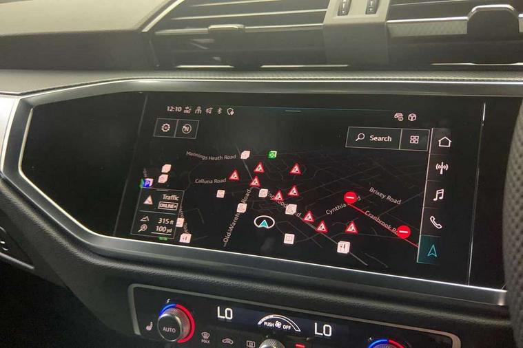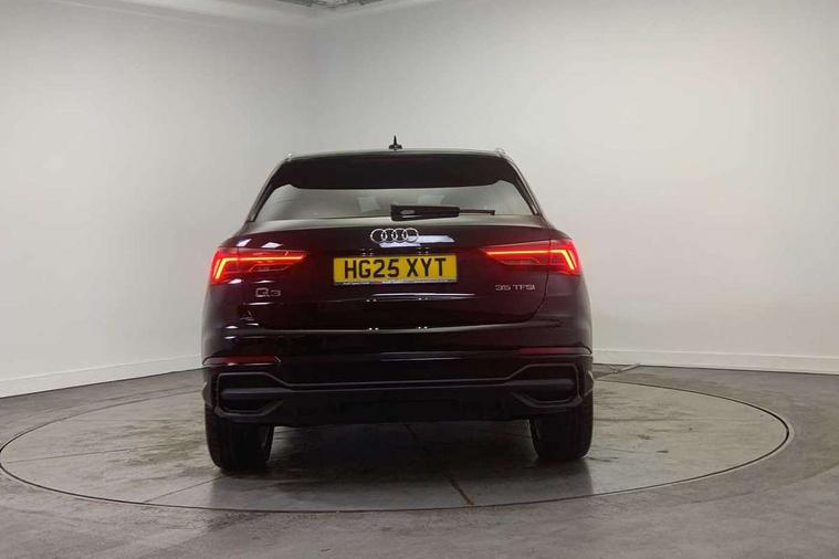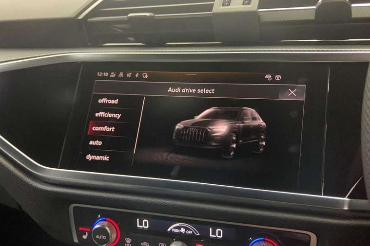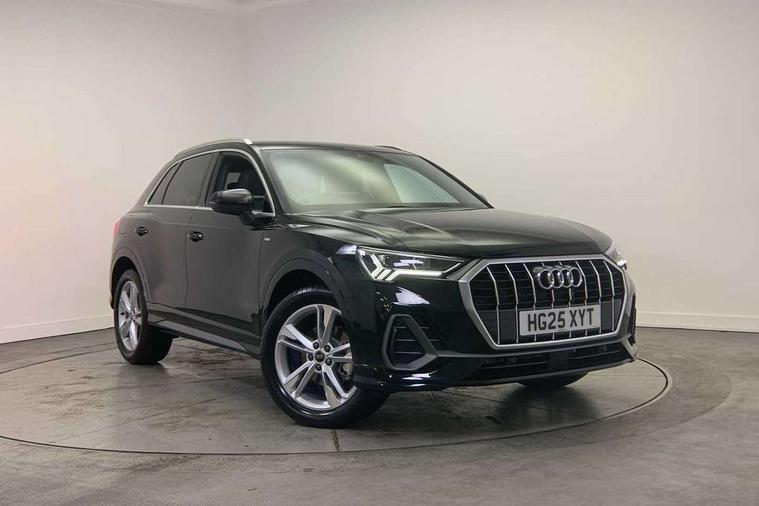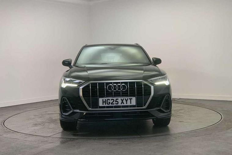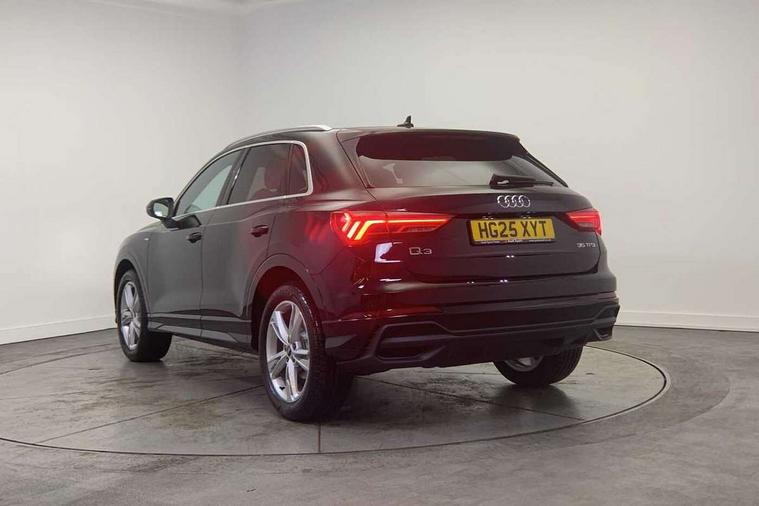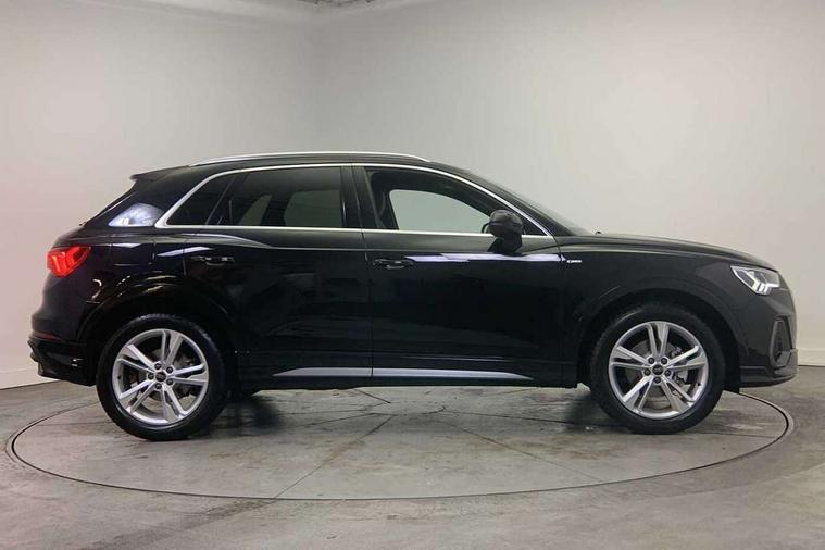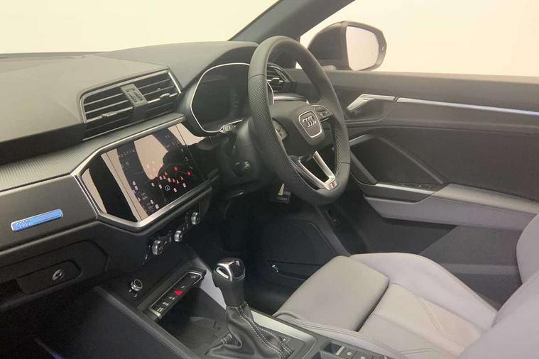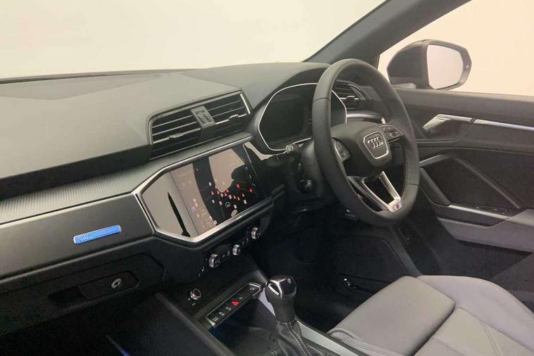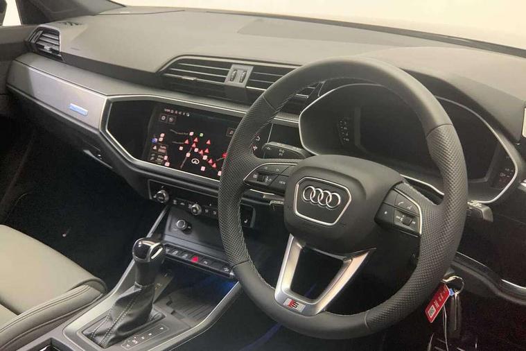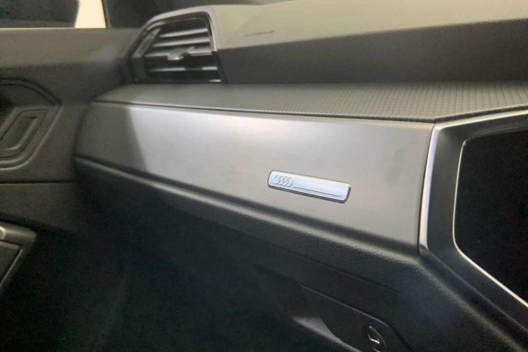 Amazon alexa Integration, Audi connect safety and service, Audi drive select, Audi lane departure warning, Audi smartphone interface includes wireless Apple carplay/Android Auto, Audi Virtual Cockpit - 10.25" display, Bluetooth interface, Camera based traffic sign recognition, Distraction and Fatigue warning, Legal emergency call, MMI Navigation Plus with high resolution 10.1 inch touchscreen colour display, Power operated tailgate, Progressive steering, Service interval indicator, Start stop system with recuperation, Voice control system with natural language interaction, Sports suspension, 2 USB-C ports with charge and data functions, 6 passive loudspeakers, DAB digital radio module, Acoustic windscreen, Aluminium roof rails, Aluminium window trim, Anthracite black radiator grille, Auto dimming door mirrors, Auto dimming frameless rear view mirror, Body colour front spoiler blade, Electrically folding, adjustable and heated door mirrors with integrated LED side indicators and kerb view function for passenger side, Front and rear electric windows, Front fog lights, Front side air inlets in matt platinum grey, Grille vertical bars in aluminium silver/Matt, High gloss black finish B and C pillars, LED Dynamic rear indicators, LED headlights with LED daytime running lights, LED rear lights, LED third brake light, Privacy glass dark tinted rear and rear-side windows (from B-pillar backwards), Rain and light sensors, Rear diffuser grille in grained matt black, Rear diffuser strip in matt anthracite black, Rear side wing doors, Rear wiper, S line badges on front wings, S Line front and rear bumpers and side skirts, Side skirt insert in matt Platinium grey, Variable front intermittent wipers, 12V socket in rear centre console, 3 seat bench in 2nd row, 3 spoke leather multifunction steering wheel features S badging and grips in perforated leather with contrast stitching, 40:20:40 folding with manual adjustment for 60:40 forwards/backwards position and backrest angle, Adjustable rear seat bench/backrest with centre armrest and cupholder, Black carpet mats, Black cloth headlining, Dual zone electronic climate control, Electric lumbar support, Front and rear black floor mats with contrast stitching in rock grey, Front and rear headrests, Front centre armrest, Height and reach adjustable steering wheel, Horizontal trim strip in matt platinum grey, Illuminated door sill trims with S logo, ISOFIX child seat mounting for front passenger with airbag deactivation and outer rear seat including top tether attachment point for outer rear seats, Luggage compartment sill protection in stainless steel, Manual front seats with height adjustment, Perforated leather gearknob, Single front passenger seat, Stainless steel pedals, Twin leather upholstery with front sport seats + S embossing, Non smoking pack - Q3, 3x3 point rear seatbelts, 6 airbags - Driver, front passenger, curtain and side windows, Audi pre-sense front with pedestrain and cyclist recognition, Electrically operated child locks on rear doors, Electromechanical parking brake, Electronic stabilisation control including ABS, ASR and EDL, Front seatbelt reminder, Hill descent control, Hill hold assist, Pre sense basic, Seatbelt monitoring, Tyre pressure warning, Warning triangle and first aid kit, Anti theft wheel bolts, Immobiliser, Remote central locking, Thatcham approved category 1 anti theft alarm, Aluminium look interior elements, Dark matt brushed aluminium inlay, Detail dashboard around MMI touch colour display in glass look, black with surround in aluminium look, Leatherette door armrest,