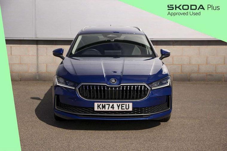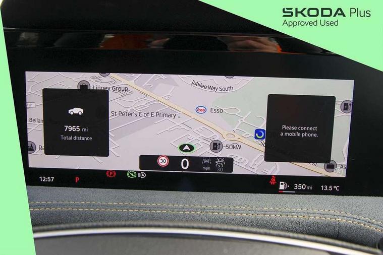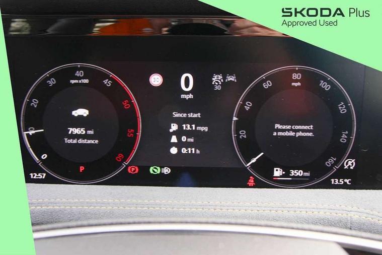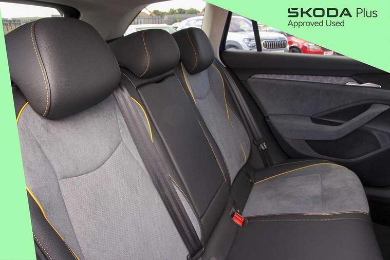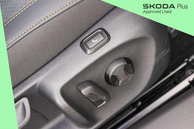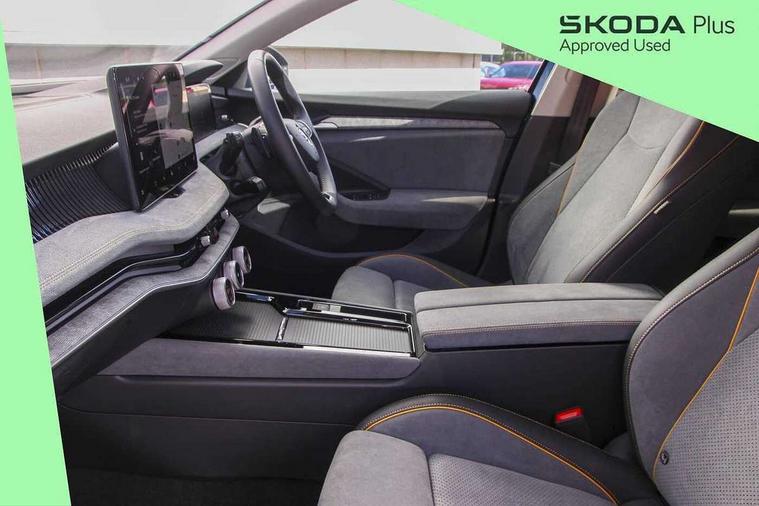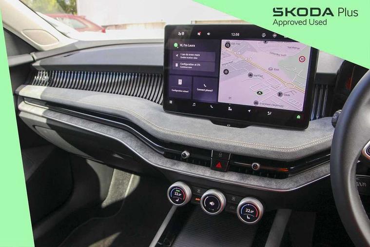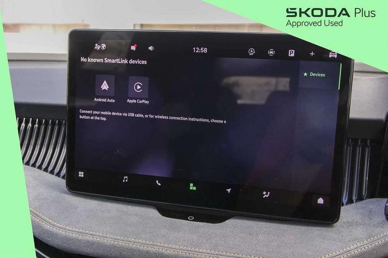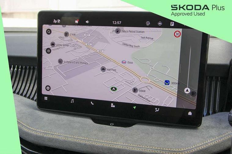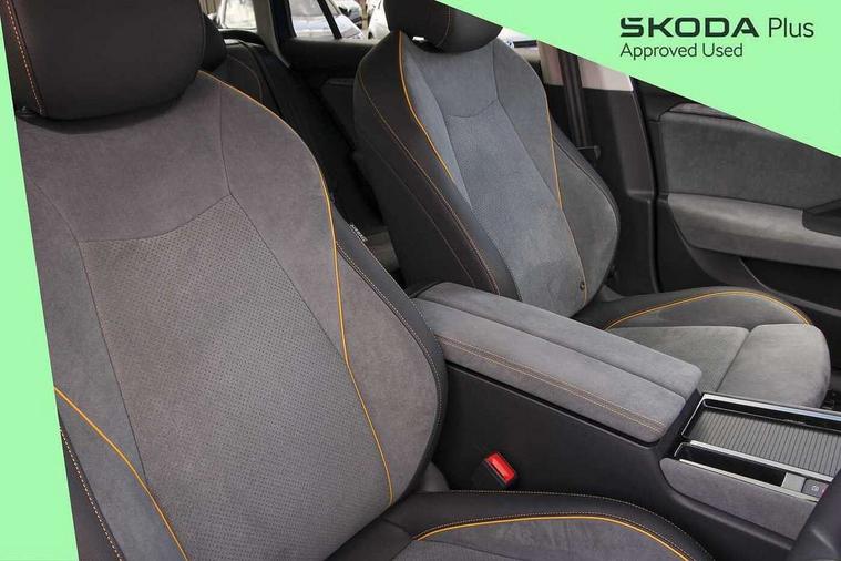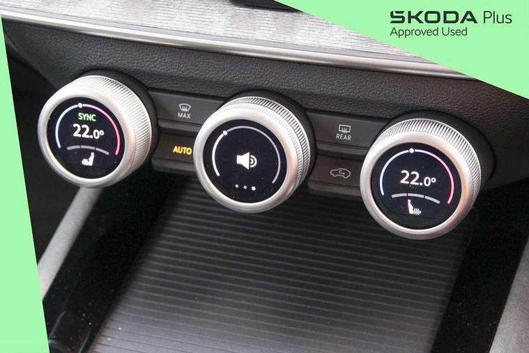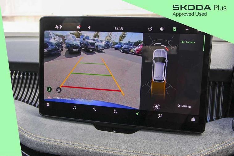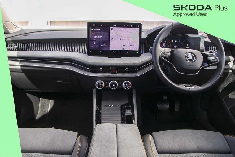 13" touchscreen display with satellite navigation, 4x USB-C ports (2x in front centre console and 2x in rear) (45W), Adaptive cruise control with speed assist, lane assist plus and traffic tram assist, Blind spot detection with door exit warning, Bluetooth system, CareConnect and Emergency Call, ChatGPT functionality, Driver fatigue sensor, Front assist with extended predictive pedestrian protection, Front cross traffic assist, PAS, Quick start all heating software functionality, Rear view camera with washer, Stop/start engine system, Traffic sign recognition, Turn assist with evasive assistance, Virtual Cockpit - 10.25" digital display, Voice control system, Wireless charging for one smartphone (15W) with cooling function, Wireless smartlink apple carplay, SmartLink+ android auto, 8 Speakers, DAB Digital radio, Display cleaner, FM radio connection, Web radio connection, Acoustic side windows and interior noise suppression, Backdrop lighting, Body colour door handles, Body coloured door mirrors, Chrome roof rails, Chrome window surround, Electrically adjustable, heated, folding and driver side auto-dimming door mirrors with integrated indicators and logo projection, Frameless auto-dimming rear view mirror with USB-C, Front windscreen with heat-insulating glass, Ice scraper in fuel tank cap, LED 3rd brake light, Light assist with High beam control, Light assistant (coming/leaving home/tunnel light), Privacy glass, Rear fog light (x1), Rear roof spoiler, Rear side wing doors, Rear windscreen wiper, Tow bar preparation, Unique dark chrome design logo on alloy wheels, Unique dark chrome grille surround with dark chrome rib elements, Windscreen wipers with rain sensor, 12V socket 1x centre console 1x boot, 12V socket and 2x cargo elements in boot, 2 spoke multifunction steering wheel with DSG paddles, 3 seat bench in 2nd row, 4x foldable bag hooks in boot, 60:40 Split folding rear seats, Bottle holders in the front doors 1.5 litre bottle and rear 1.5 litre bottle, Cup holder in front with easy open mat, Front and rear footwell illumination, Front armrest with storage box, Front comfort seats, Heated front seats, Height adjustable driver and front passenger seats with 2-way electric tilt, 4-way pneumatic lumbar support, and extendable thigh support, Height adjustable front and rear head restraints, Height adjustable front passenger seat, Illuminated glovebox, Interior lights with control switches, Isofix child seat fittings in outer rear and front passenger seats, LED front and rear reading lights, Massage function for front seats, Single front passenger seat, Skoda lettering on steering wheel, Storage pockets on back of front seats, Sun visors with illuminated vanity mirrors, Ticket holder on A Pillar, Tri zone climate control, Umbrella in driver's door, 3 rear seatbelts, 8 Airbags - Front driver and passenger, front side driver and passenger, centre, curtain front and rear, drivers knee, Crew protect assist, Driver and passenger seatbelts with warning light, Electronic parking brake, ESC including ABS, EBV, MSR, ASR, EDS, HBA, DSR, RBS, CBC, multi-collision brake (MKB) and Auto hold, Hill hold assist, Power operated child lock in rear doors, Alarm with interior monitoring tilt sensor and back up horn, Backrest remote release from trunk, Electronic engine immobiliser, Keyless start/stop, Remote central locking with SAFE system, Third key, Decorative front door sills,