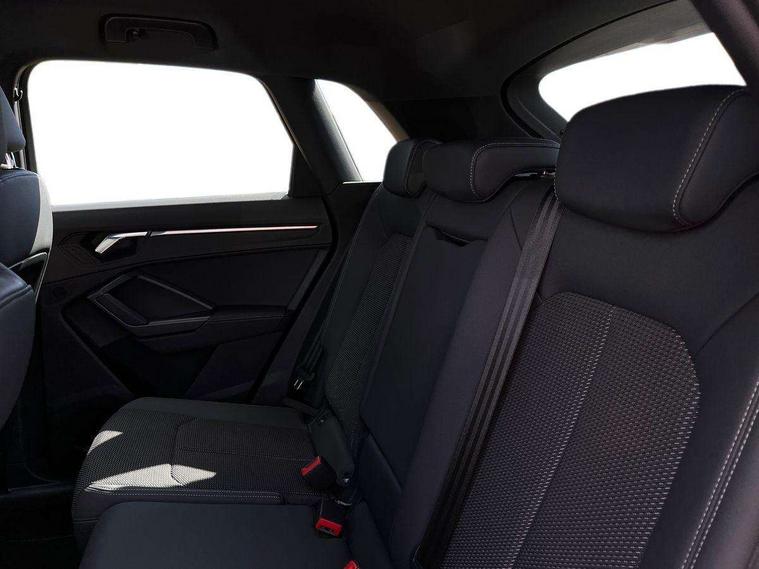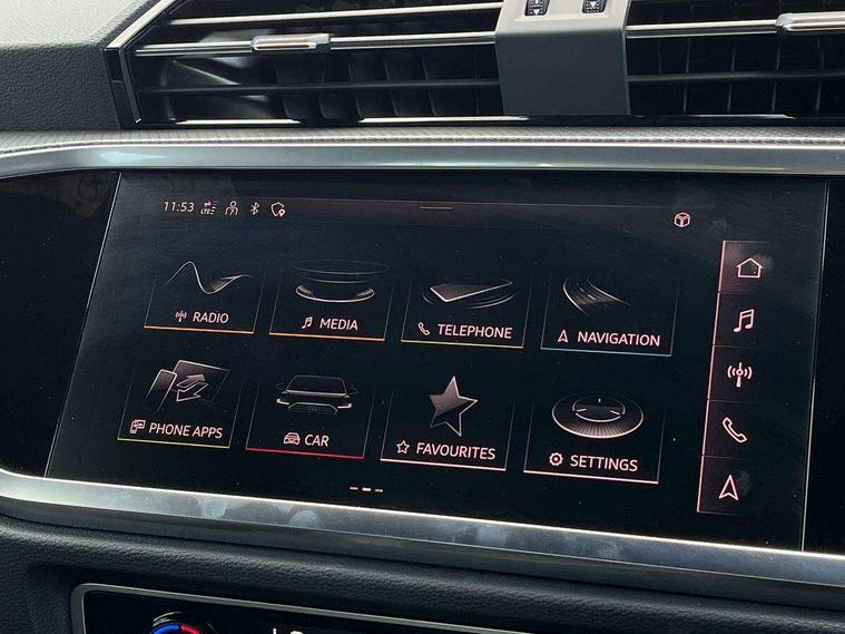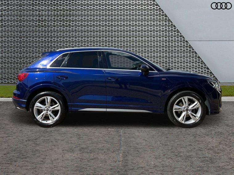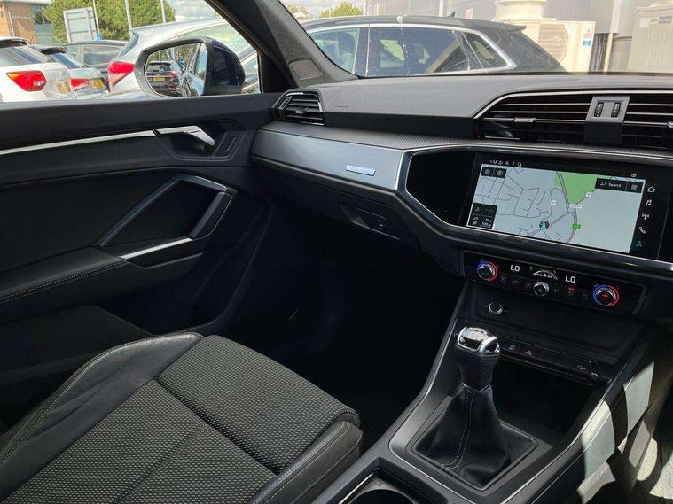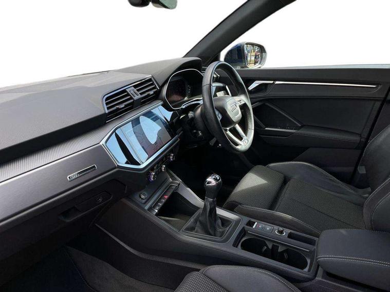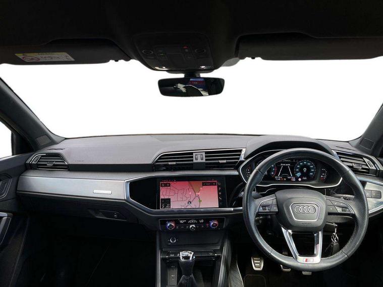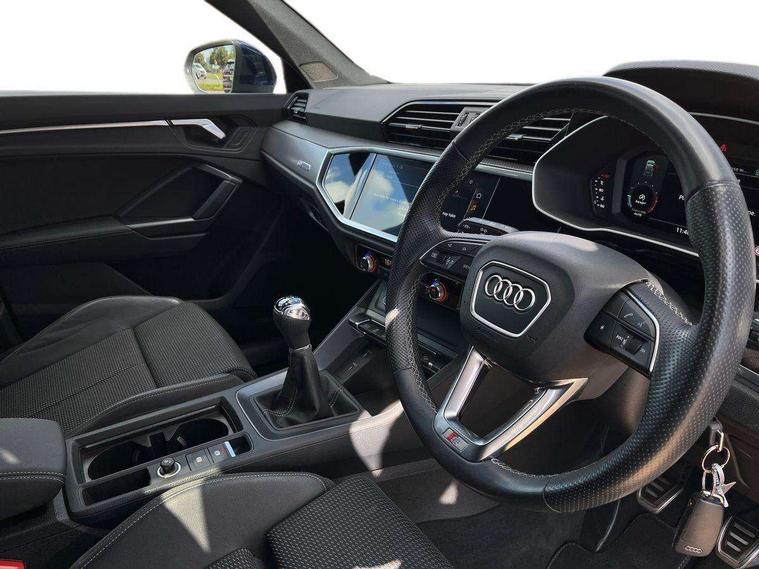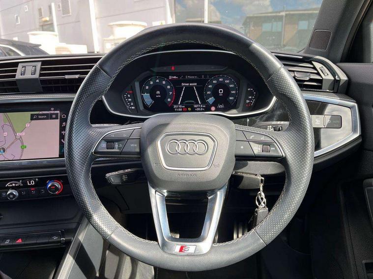 Amazon alexa Integration, Audi connect safety and service (e-call), Audi drive select, Audi lane departure warning, Audi Virtual Cockpit - 10.25" display, Bluetooth interface, Camera based traffic sign recognition, Cruise control + speed limiter, MMI Navigation Plus with high resolution 10.1 inch touchscreen colour display, Power operated tailgate, Progressive steering, Rear parking sensors, Service interval indicator, Smartphone interface includes wireless Apple carplay/Android Auto, Start stop system with recuperation, Voice control system with natural language interaction, Sports suspension, 2 USB-C ports with charge and data functions, 6 passive loudspeakers, DAB digital radio module, Acoustic windscreen, Aluminium roof rails, Aluminium window trim, Auto dimming frameless rear view mirror, Body coloured bumpers, Electrically folding, adjustable and heated door mirrors with integrated LED side indicators and kerb view function for passenger side, Front and rear electric windows, Front fog lights, Front side air inlets in matt platinum grey, Front spoiler blade in matt platinum grey, Grille vertical bars in aluminium silver/Matt, High gloss black finish B and C pillars, LED headlights with LED daytime running lights and dynamic rear indicator, LED rear lights, Privacy glass dark tinted rear and rear-side windows (from B-pillar backwards), Rain and light sensors, Rear diffuser strip in matt titanium black, S line badges on front wings, S Line front and rear bumpers, Side skirt insert in matt Platinium grey, Silver chrome grille surround, Titanium black radiator grille, 12V socket in rear centre console, 40:20:40 folding with manual adjustment for 60:40 forwards/backwards position and backrest angle, Adjustable rear seat bench/backrest with centre armrest and cupholder, Black cloth headlining, Dual zone electronic climate control, Front and rear black floor mats with contrast stitching in rock grey, Front and rear headrests, Front and rear roof module including reading lights, Front centre armrest, Glove compartment lighting, Height and reach adjustable steering wheel, Illuminated door sill trims with S logo, ISOFIX child seat mounting for front passenger with airbag deactivation and outer rear seat including top tether attachment point for outer rear seats, Luggage compartment light, Manual front seats with height adjustment, Perforated leather gearknob, Stainless steel luggage compartment sill finisher, Stainless steel pedals, Non smoking pack - Q3, 3x3 point rear seatbelts, 6 airbags - Driver, front passenger, curtain and side windows, Audi pre-sense front with pedestrain and cyclist recognition, Electrically operated child locks on rear doors, Electromechanical parking brake, Electronic stabilisation control including ABS, ASR and EDL, Hill descent control, Hill hold assist, Pre sense basic, Seatbelt monitoring, Tyre pressure warning, Warning triangle and first aid kit, Anti theft alarm, Anti theft wheel bolts, Remote central locking, Dark matt brushed aluminium inlay, Detail dashboard around MMI touch colour display in glass look, black with surround in aluminium look, Leatherette door armrest,