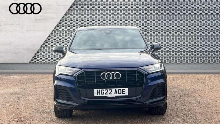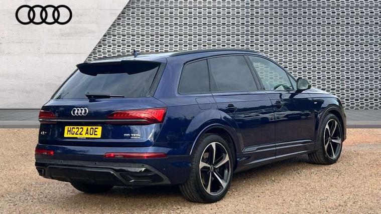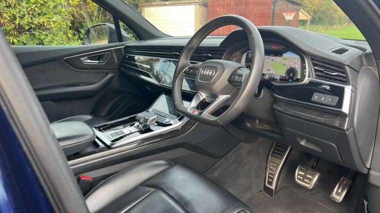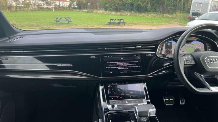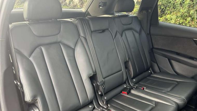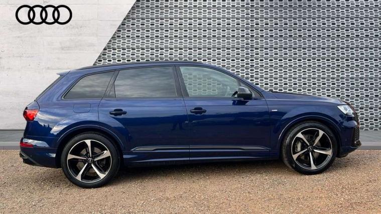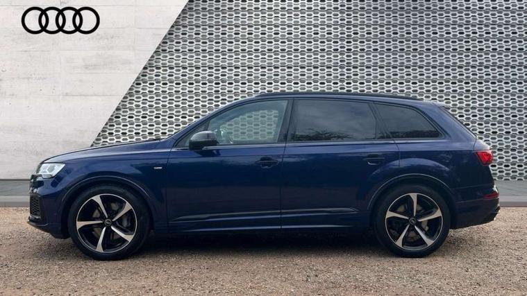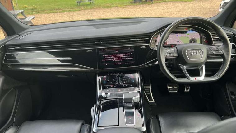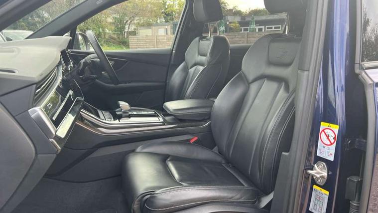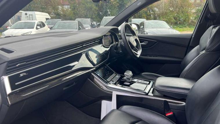 Audi connect safety and service (e-call), Audi connect with Amazon Alexa Integration, Audi drive select (Auto, Comfort, Dynamic, Efficiency, Individual, Off-road and All road), Audi smartphone interface includes wireless Apple carplay/Android Auto, Bluetooth interface, Camera based traffic sign recognition, Electromechanical steering, MMI navigation plus with MMI touch screens includes 10.1" and 8.6" screens with haptic feedback, Natural voice recognition, Parking system plus with 360 degree display (front, rear and side sensors) - acoustic and visual park assist system, Power operated tailgate, Rear view camera, Start/stop system, 48V Mild hybrid technology, 85 litre fuel tank, Adaptive air sports suspension, Quattro all wheel drive with self locking centre differential, Audi music interface - front 2 USB-C ports with charger and data functions, Audi sound system with 6 channel amplifier, 180 watt amplifying capacity and 10 loudspeakers including subwoofer, DAB digital radio module, 3rd brake light, Audi matrix LED headlights with dynamic front and rear indicators, Auto dimming frameless rear view mirror, Black roof rails, Bumpers in contrast paint scandium grey finish includes door trim and wheel arch trim strips, inlays in door strip contain quattro embossing, Electrically adj heated/folding + automatically dimming exterior mirrors with memory + automatic kerb side function for passenger side exterior mirror, Heat insulating glass in windshield, Integrated LED indications in door mirrors, LED daytime running lights, LED rear tail lights, Privacy glass - dark tinted rear and rear side windows from B-pillar backwards, Rear side wing doors, Rear wiper, 2 seat bench in 3rd row, 3 seat bench in 2nd row, 4 zone deluxe automatic climate control, 7 seat layout with ISOFIX points for the front passenger seat and rear passenger seat, Black cloth headlining, Comfort front centre armrest, Electric adjustable front seat with 4 way lumbar support, driver memory functionality, Folding rear seats, Front head restraints, Front/rear floor mats, Heated front seats, Illuminated door sill trims with S logo, LED interior ambient lighting, Luggage compartment cover, Luggage compartment sill protection in stainless steel, Rear head restraints, Single front passenger seat, Stainless steel pedals, Sunvisors with illuminated vanity mirrors, Tool kit, Titanium black styling pack - Q7/SQ7, 3 point seatbelts on all rear seats, Audi pre sense front, Child locks on rear doors, Driver and front passenger, front side and curtain airbags, Electromechanical parking brake, Electronic Stabilisation Control (ESC) including ABS, ASR and EDL, Extended pedestrian protection measures, Hill hold assist, Seatbelt monitoring, Tyre pressure loss indicator, Warning triangle and first aid kit, Anti theft alarm, Anti-theft wheel bolts and wheel loosening detection, Keyless Go, Remote central locking, Polished oak trim with grey finished, Tyre repair kit,