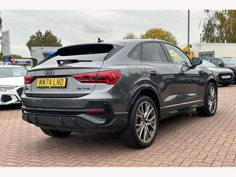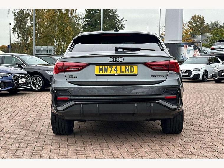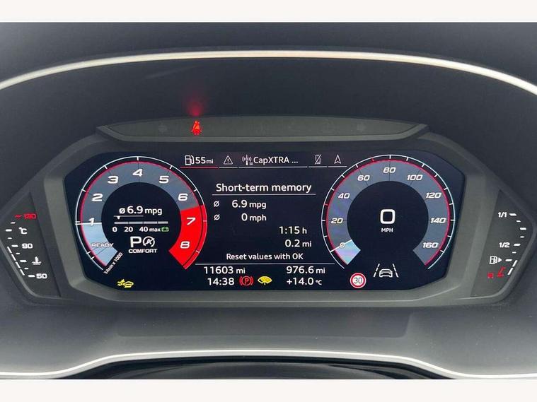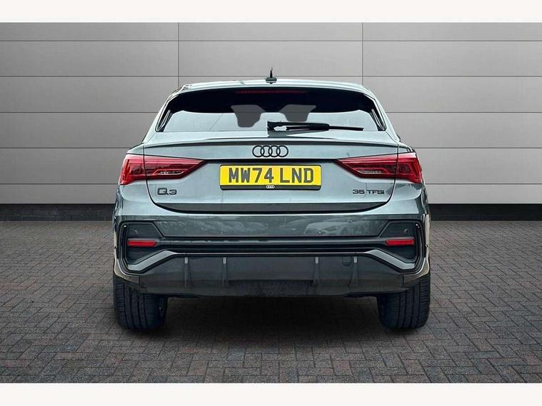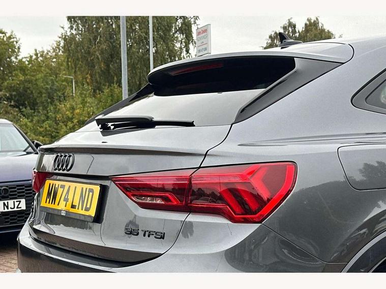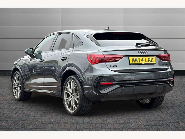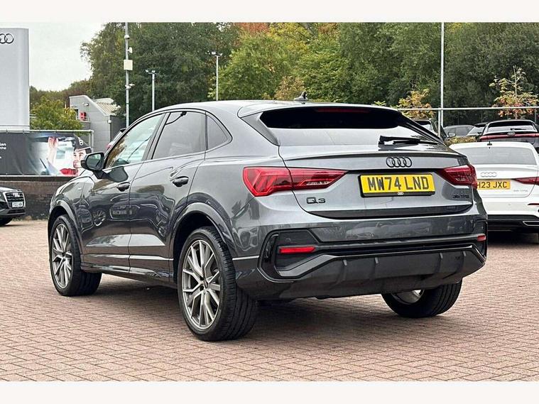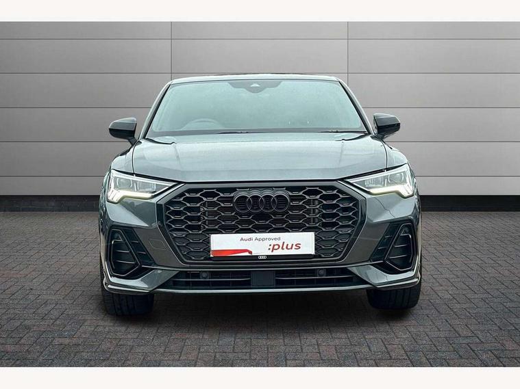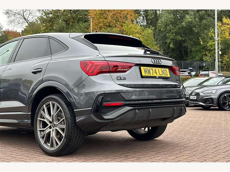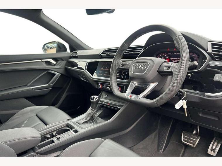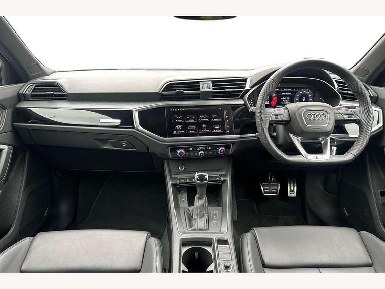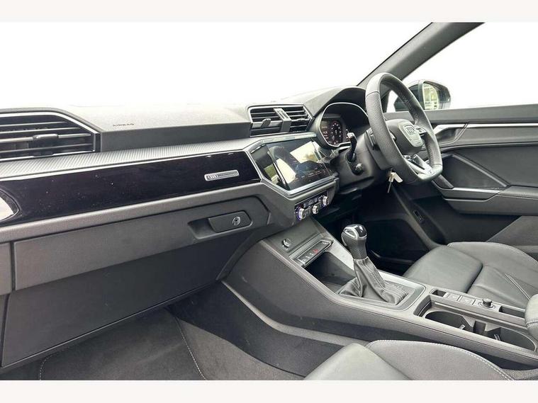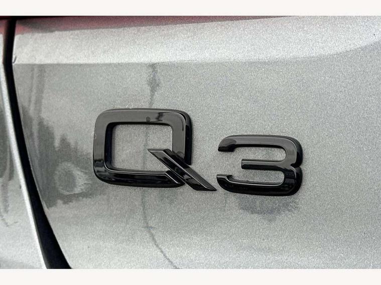 Audi connect safety and service, Audi drive select, Audi lane departure warning, Audi smartphone interface includes wireless Apple carplay/Android Auto, Audi Virtual Cockpit - 10.25" display, Bluetooth interface, Camera based traffic sign recognition, Distraction and Fatigue warning, Legal emergency call, MMI Navigation Plus with high resolution 10.1 inch touchscreen colour display, Power operated tailgate, Progressive steering, Service interval indicator, Start stop system with recuperation, Voice control system with natural language interaction, Sports suspension, 2 USB-C ports with charge and data functions, 6 passive loudspeakers, DAB digital radio module, Acoustic windscreen, Audi Beam uses LEDs to project the Audi logo onto the ground as you exit your Q3, Auto dimming door mirrors, Auto dimming frameless rear view mirror, Diffuser grille in grained matt black, Diffuser trim in selenite silver, Electrically folding, adjustable and heated door mirrors with integrated LED side indicators and kerb view function for passenger side, Front and rear electric windows, Front fog lights, Front underbody protection in manhattan grey paint finish, High gloss black finish B and C pillars, LED Dynamic rear indicators, LED headlights with LED daytime running lights, LED rear lights, LED third brake light, Privacy glass dark tinted rear and rear-side windows (from B-pillar backwards), Rain and light sensors, Rear side wing doors, Rear underbody protection in matt black, Rear wiper, S line front and rear bumpers and side skirts in contrasting Manhattan grey paint finish, Variable front intermittent wipers, 12V socket in rear centre console, 3 seat bench in 2nd row, 40:20:40 folding with manual adjustment for 60:40 forwards/backwards position and backrest angle, Adjustable rear seat bench/backrest with centre armrest and cupholder, Black cloth headlining, Dual zone electronic climate control, Electric lumbar support, Front and rear black floor mats with contrast stitching, Front and rear headrests, Front centre armrest, Height and reach adjustable steering wheel, Illuminated door sill trims with S logo, ISOFIX child seat mounting for front passenger with airbag deactivation and outer rear seat including top tether attachment point for outer rear seats, Luggage compartment sill protection in stainless steel, Manual front seats with height adjustment, Perforated leather gearknob, Single front passenger seat, Stainless steel pedals, Twin leather upholstery with front sport seats + S embossing, Black styling pack - Q3, Non smoking pack - Q3, 3x3 point rear seatbelts, 6 airbags - Driver, front passenger, curtain and side windows, Audi pre-sense front with pedestrain and cyclist recognition, Electrically operated child locks on rear doors, Electromechanical parking brake, Electronic stabilisation control including ABS, ASR and EDL, Front seatbelt reminder, Hill descent control, Hill hold assist, Pre sense basic, Seatbelt monitoring, Tyre pressure warning, Warning triangle and first aid kit, Anti theft alarm, Anti theft wheel bolts, Immobiliser, Remote central locking, Aluminium look interior elements, Detail dashboard around MMI touch colour display in glass look, black with surround in aluminium look, Leatherette door armrest, Piano black inlay,