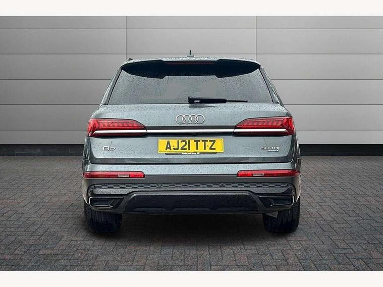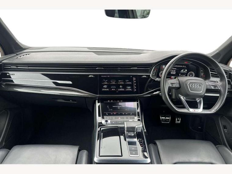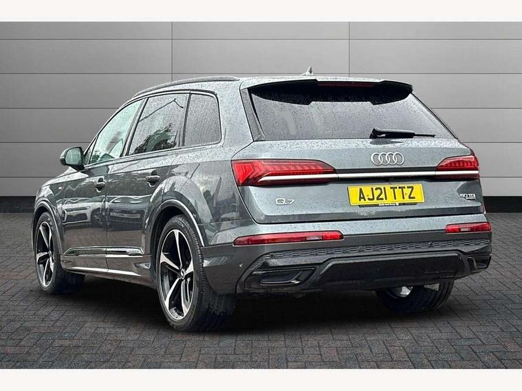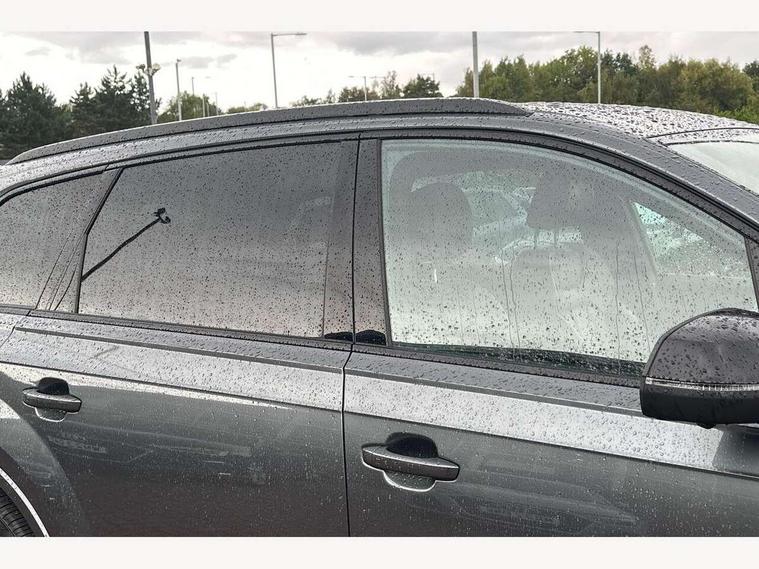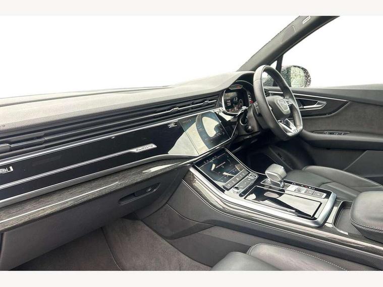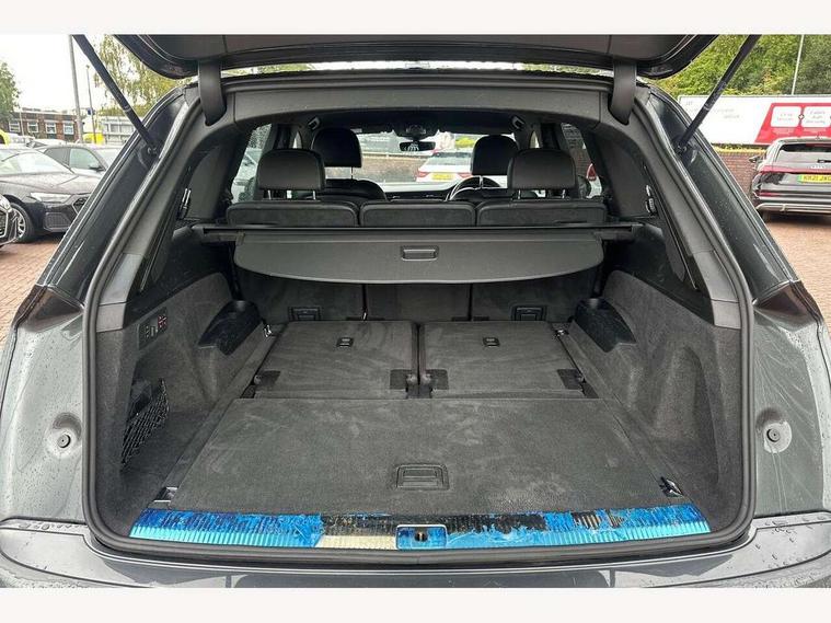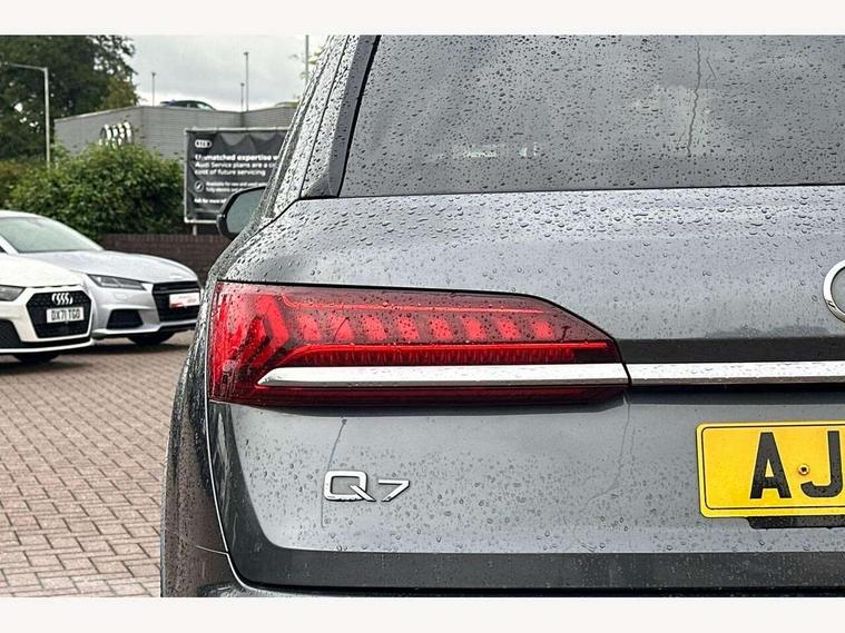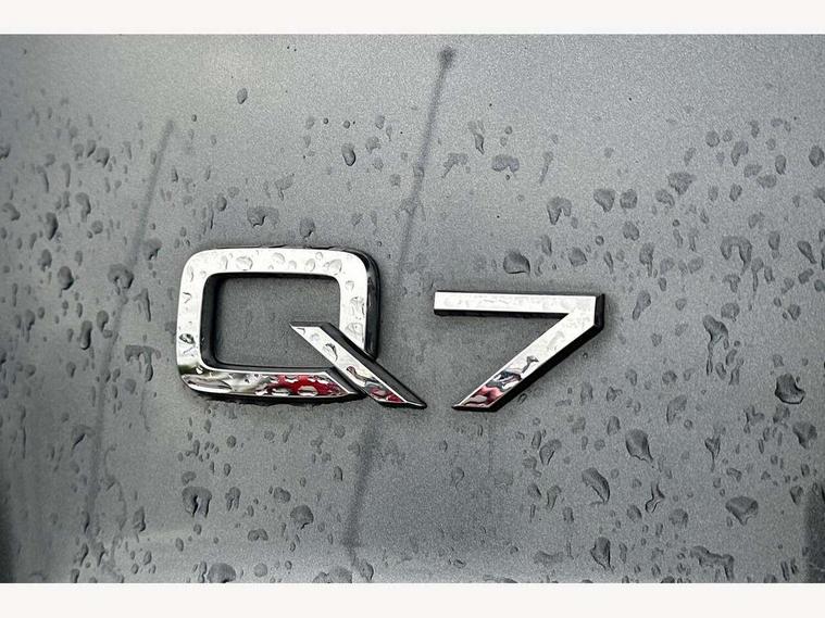 Audi connect safety and service (e-call), Audi drive select (Auto, Comfort, Dynamic, Efficiency, Individual, Off-road and All road), Audi phone box with wireless charging, Camera based traffic sign recognition, Electromechanical steering, MMI navigation plus with MMI touch screens includes 10.1" and 8.6" screens with haptic feedback, Natural voice recognition, Parking system plus with 360 degree display (front, rear and side sensors) - acoustic and visual park assist system, Power operated tailgate, Rear view camera, Smartphone interface includes wireless Apple carplay/Android Auto, Start/stop system, 48V Mild hybrid technology, Adaptive air sports suspension, Quattro all wheel drive with self locking centre differential, Audi music interface - front 2 USB-C ports with charger and data functions, Audi sound system with 6 channel amplifier, 180 watt amplifying capacity and 10 loudspeakers including subwoofer, DAB digital radio module, Audi matrix LED headlights with dynamic front and rear indicators, Auto dimming frameless rear view mirror, Black roof rails, Bumpers in contrast paint scandium grey finish includes door trim and wheel arch trim strips, inlays in door strip contain quattro embossing, Electrically adj heated/folding + automatically dimming exterior mirrors with memory + automatic kerb side function for passenger side exterior mirror, Heat insulating glass in windshield, Integrated LED indications in door mirrors, LED daytime running lights, LED rear tail lights, Privacy glass - dark tinted rear and rear side windows from B-pillar backwards, 4 zone deluxe automatic climate control, 7 seat layout with ISOFIX points for the front passenger seat and rear passenger seat, Black cloth headlining, Comfort front centre armrest, Folding rear seats, Front head restraints, Front/rear floor mats, Heated front seats, Illuminated door sill trims with S logo, LED interior ambient lighting, Luggage compartment cover, Luggage compartment sill protection in stainless steel, Rear head restraints, Stainless steel pedals, Sunvisors with illuminated vanity mirrors, Titanium black styling pack - Q7/SQ7, 3 point seatbelts on all rear seats, Audi pre sense front, Driver and front passenger, front side and curtain airbags, Electromechanical parking brake, Electronic Stabilisation Control (ESC) including ABS, ASR and EDL, Extended pedestrian protection measures, Hill hold assist, Seatbelt monitoring, Tyre pressure loss indicator, Warning triangle and first aid kit, Anti theft alarm, Anti-theft wheel bolts and wheel loosening detection, Keyless Go, Remote central locking, Polished oak trim with grey finish inlay, Tool kit, Tyre repair kit,
