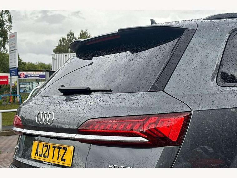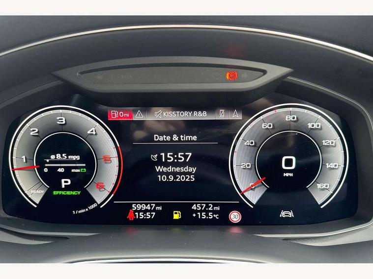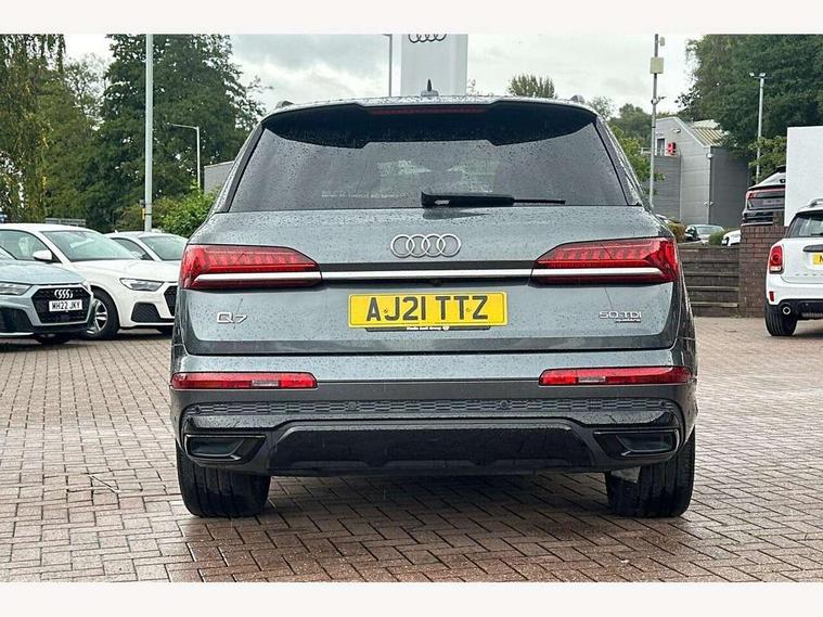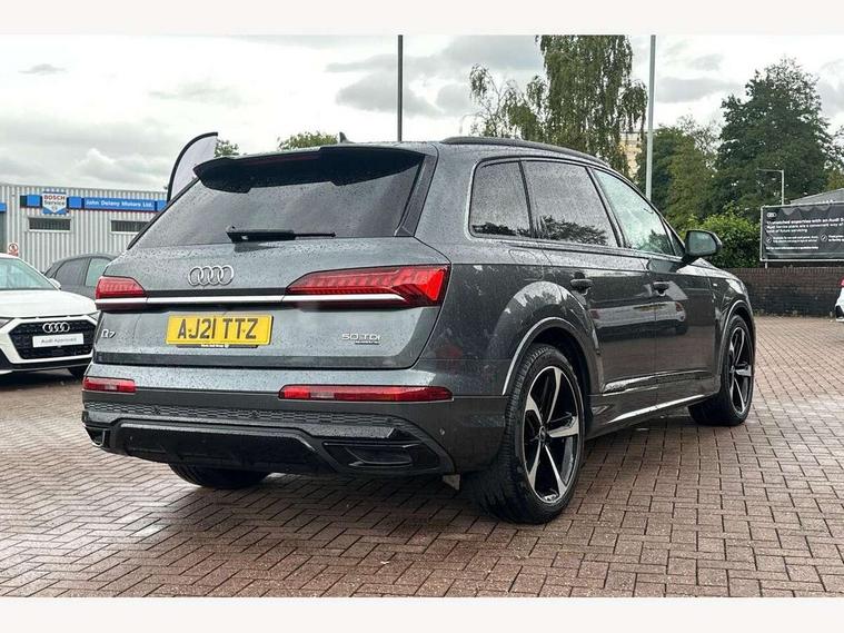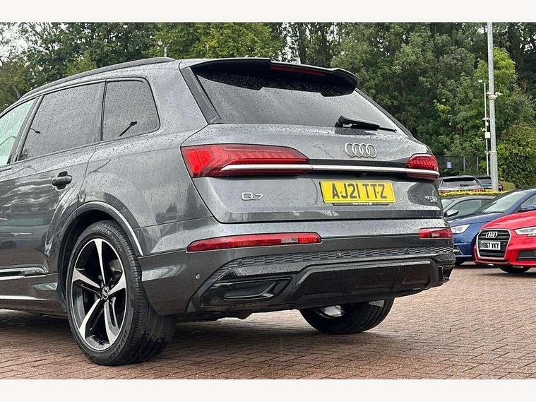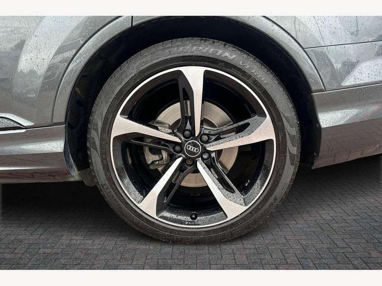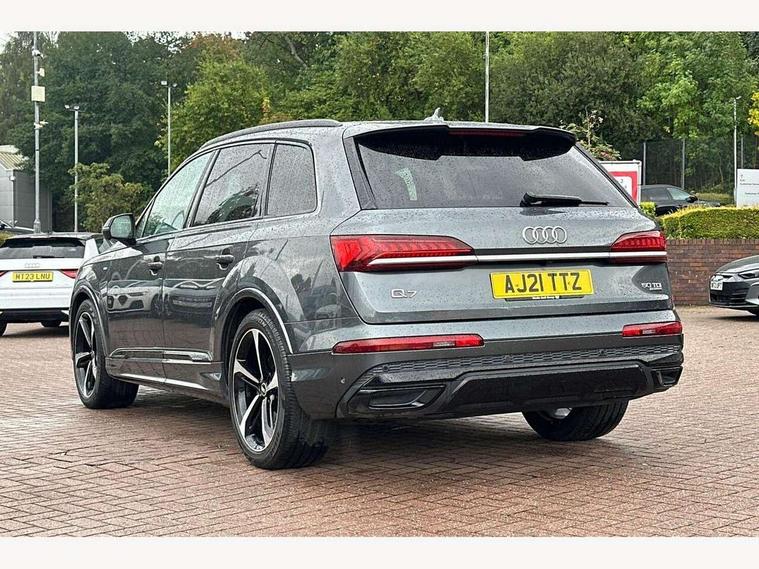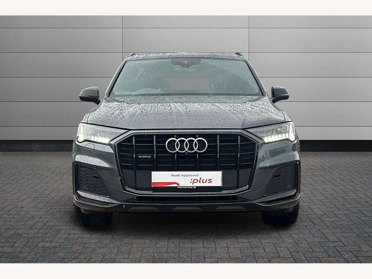 Audi connect safety and service (e-call), Audi drive select (Auto, Comfort, Dynamic, Efficiency, Individual, Off-road and All road), Audi phone box with wireless charging, Camera based traffic sign recognition, Electromechanical steering, MMI navigation plus with MMI touch screens includes 10.1" and 8.6" screens with haptic feedback, Natural voice recognition, Parking system plus with 360 degree display (front, rear and side sensors) - acoustic and visual park assist system, Power operated tailgate, Rear view camera, Smartphone interface includes wireless Apple carplay/Android Auto, Start/stop system, 48V Mild hybrid technology, Adaptive air sports suspension, Quattro all wheel drive with self locking centre differential, Audi music interface - front 2 USB-C ports with charger and data functions, Audi sound system with 6 channel amplifier, 180 watt amplifying capacity and 10 loudspeakers including subwoofer, DAB digital radio module, Audi matrix LED headlights with dynamic front and rear indicators, Auto dimming frameless rear view mirror, Black roof rails, Bumpers in contrast paint scandium grey finish includes door trim and wheel arch trim strips, inlays in door strip contain quattro embossing, Electrically adj heated/folding + automatically dimming exterior mirrors with memory + automatic kerb side function for passenger side exterior mirror, Heat insulating glass in windshield, Integrated LED indications in door mirrors, LED daytime running lights, LED rear tail lights, Privacy glass - dark tinted rear and rear side windows from B-pillar backwards, 4 zone deluxe automatic climate control, 7 seat layout with ISOFIX points for the front passenger seat and rear passenger seat, Black cloth headlining, Comfort front centre armrest, Folding rear seats, Front head restraints, Front/rear floor mats, Heated front seats, Illuminated door sill trims with S logo, LED interior ambient lighting, Luggage compartment cover, Luggage compartment sill protection in stainless steel, Rear head restraints, Stainless steel pedals, Sunvisors with illuminated vanity mirrors, Titanium black styling pack - Q7/SQ7, 3 point seatbelts on all rear seats, Audi pre sense front, Driver and front passenger, front side and curtain airbags, Electromechanical parking brake, Electronic Stabilisation Control (ESC) including ABS, ASR and EDL, Extended pedestrian protection measures, Hill hold assist, Seatbelt monitoring, Tyre pressure loss indicator, Warning triangle and first aid kit, Anti theft alarm, Anti-theft wheel bolts and wheel loosening detection, Keyless Go, Remote central locking, Polished oak trim with grey finish inlay, Tool kit, Tyre repair kit,