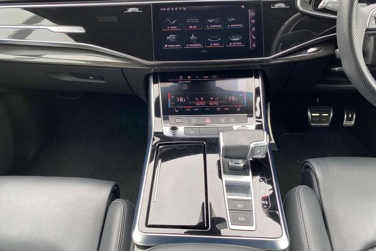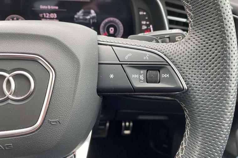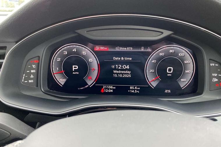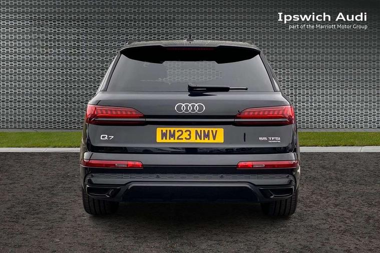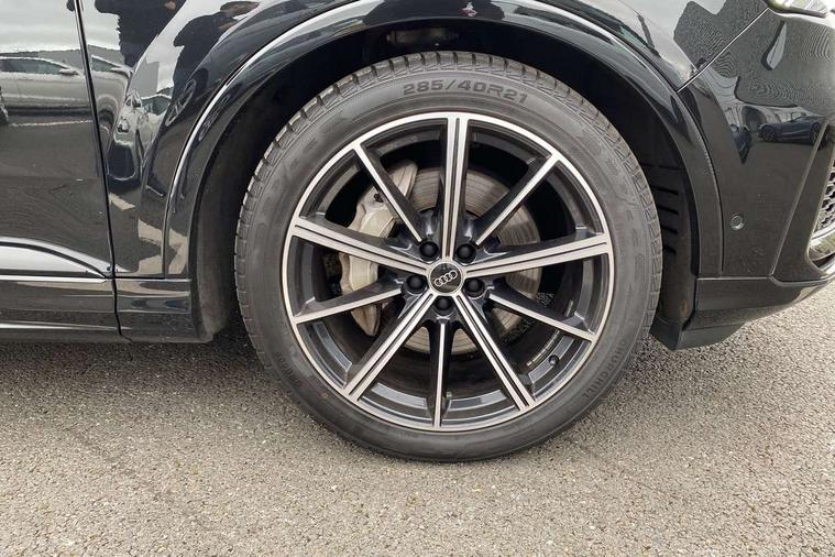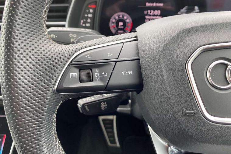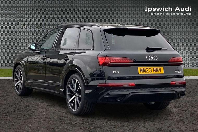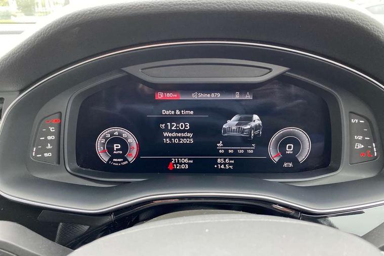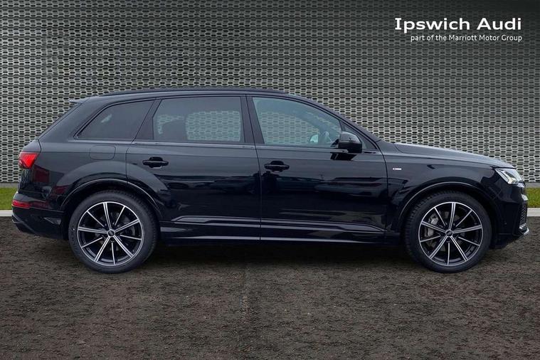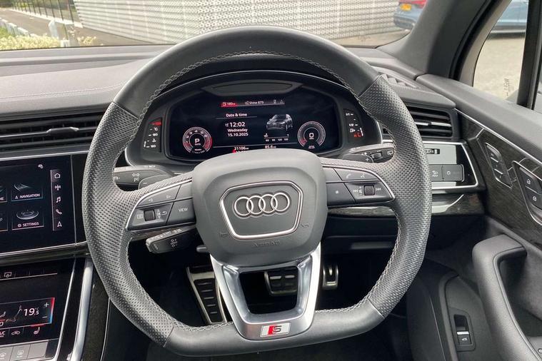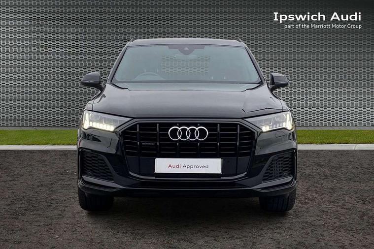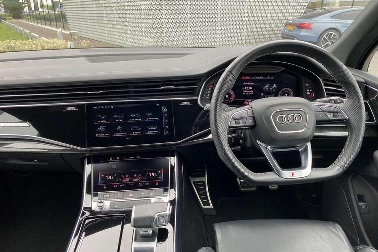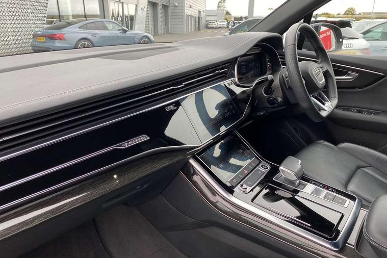 Audi connect safety and service (e-call), Audi connect with Amazon Alexa Integration, Audi drive select (Auto, Comfort, Dynamic, Efficiency, Individual, Off-road and All road), Audi phone box light with wireless charging, Audi virtual cockpit - 12.3" high-resolution LCD display with fully customisable instrument cluster, Bluetooth interface, Camera based traffic sign recognition, Electromechanical steering, MMI navigation plus with MMI touch screens includes 10.1" and 8.6" screens with haptic feedback, Natural voice recognition, Parking system plus with 360 degree display (front, rear and side sensors) - acoustic and visual park assist system, Power operated tailgate, Rear view camera, Smartphone interface includes wireless Apple carplay/Android Auto, Start/stop system, 48V Mild hybrid technology, 85 litre fuel tank, Adaptive air sports suspension, Quattro all wheel drive with self locking centre differential, Audi music interface - front 2 USB-C ports with charger and data functions, Audi sound system with 6 channel amplifier, 180 watt amplifying capacity and 10 loudspeakers including subwoofer, DAB digital radio module, 3rd brake light, Aluminium window trim, Audi Beam uses LEDs to project S emblem with red rhombus onto the ground when opening the side doors (front/rear), Auto dimming frameless rear view mirror, Black roof rails, Bumpers in contrast paint scandium grey finish includes door trim and wheel arch trim strips, inlays in door strip contain quattro embossing, Dark tinted Matrix LED headlights with dynamic front and rear indicators, Electrically adj heated/folding + automatically dimming exterior mirrors with memory + automatic kerb side function for passenger side exterior mirror, Heat insulating glass in windshield, Integrated LED indications in door mirrors, LED daytime running lights, LED rear tail lights, Privacy glass - dark tinted rear and rear side windows from B-pillar backwards, Rear side wing doors, Rear wiper, 2 seat bench in 3rd row, 2 zone automatic climate control, 3 seat bench in 2nd row, 7 seat layout with ISOFIX points for the front passenger seat and rear passenger seat, Black cloth headlining, Comfort front centre armrest, Electric adjustable front seat with 4 way lumbar support, driver memory functionality, Folding rear seats, Front head restraints, Front/rear floor mats, Heated front seats, Illuminated door sill trims with S logo, LED interior ambient lighting, Luggage compartment cover, Luggage compartment sill protection in stainless steel, Rear head restraints, Single front passenger seat, Stainless steel pedals, Sunvisors with illuminated vanity mirrors, Black styling pack plus - Q7, 3 point seatbelts on all rear seats, Audi pre sense front, Child locks on rear doors, Driver and front passenger, front side and curtain airbags, Electromechanical parking brake, Electronic Stabilisation Control (ESC) including ABS, ASR and EDL, Extended pedestrian protection measures, Hill hold assist, Seatbelt monitoring, Tyre pressure loss indicator, Warning triangle and first aid kit, Anti theft alarm, Anti-theft wheel bolts and wheel loosening detection, Keyless Go, Remote central locking, Polished oak trim with grey finish inlay, Tool kit, Tyre repair kit,