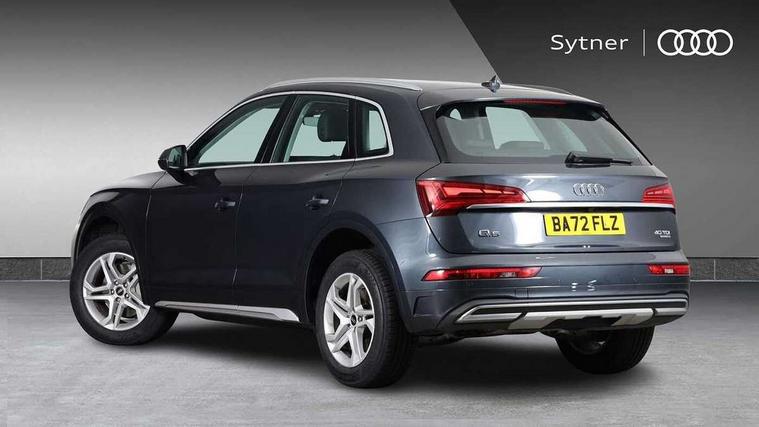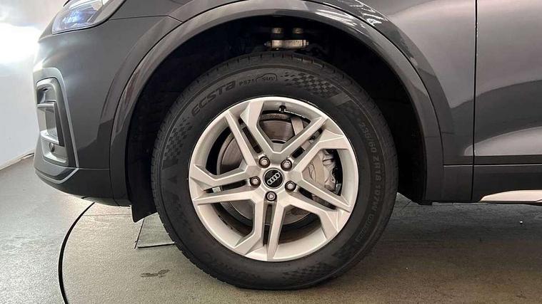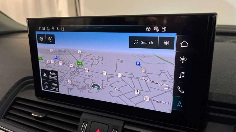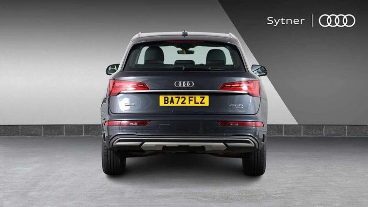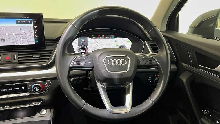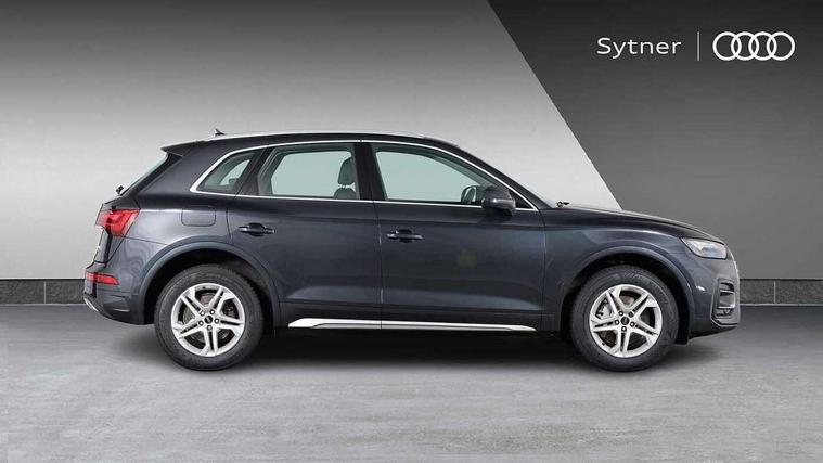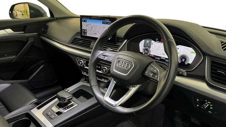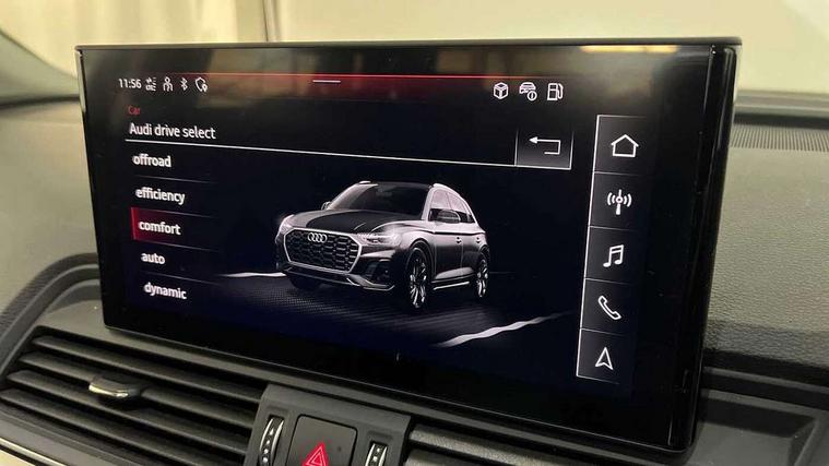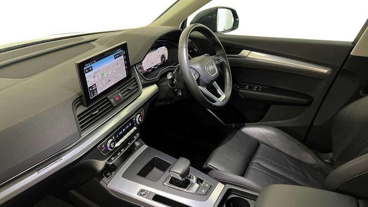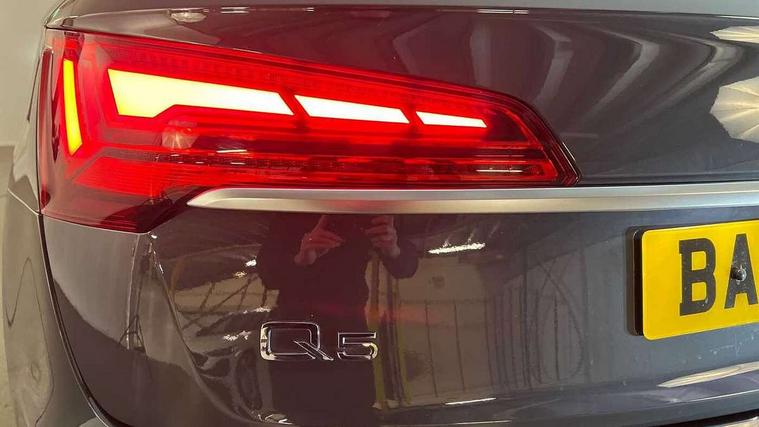 Audi connect safety and service (e-call), Audi connect with Amazon Alexa Integration, Audi drive select, Audi virtual cockpit plus with 12.3" screen and three different layout designs, Audi wireless smartphone interface, Automatic start-stop system with coasting functionality and efficiency programme, Bluetooth interface, Cruise control + speed limiter, Electro - mechanical power assisted steering, MMI navigation plus with 10.1" touch screen, Power tailgate, Reversing camera, Service interval indicator, Voice control system with Audi hotword activation "Hey Audi", Diesel particulate filter, Dynamic suspension, Quattro on demand, 2 x USB charging port with aux input socket, DAB Digital radio, Acoustic windscreen, Air inlets in matt titanium black with blades in matt aluminium silver, Aluminium roof rails, Auto dimming door mirrors, Auto dimming rear view mirror, Automatic headlight adjustment, Automatic headlights and windscreen wipers, Body colour bumpers, Body colour door mirrors, Chrome plated exhaust trims, Daytime running lights, Door sills in Selenite silver, Electric adjustable/heated/folding door mirrors, Front and rear electric windows, High level LED brake light, LED headlights and LED tail lights, Lower bumpers painted in contrast Manhattan grey, Matt selenite silver underbody protection, Matt twilight grey radiator grille with chrome vertical struts, Rear chrome trim strip below lights, Rear diffuser strip in selenite silver, Rear side wing doors, Rear spoiler, Rear wiper, Roof bars, 3 rear headrests, 3 spoke multifunction leather steering wheel with shift paddles, 40:20:40 split folding 3 rear bench seat in 2nd row with rear centre armrest, Comfort front centre armrest, Deluxe 3 zone electronic climate control, Door sills trims with aluminium inlays, Front/rear floor mats, Heated front seats, Height adjustable front head restraints, Height/reach adjustable steering column, ISOFIX child seat mounting and top tether, Luggage compartment cover, Manual seat adjustment with 4-way electric lumbar support, Removable luggage compartment floor, Silver cloth headlining, Single front passenger seat, Sunvisors with vanity mirrors, Twin leather upholstery + front sports seats, High gloss pack - Q5, LED interior light pack - Q5, 3 point seatbelts on all seats, 6 airbags - Driver, front passenger, curtain and side airbags, Electrically operated child locks on rear doors, Electromechanical parking brake, Electronic stabilisation control including ABS, ASR and EDL, Front passenger airbag deactivation, Hill descent control, Hill hold assist, Multi collision brake assist, Pop-up bonnet for pedestrian protection, Pre sense city, Seat belt force limiter, Seatbelt monitoring, Tyre pressure warning, Warning triangle and first aid kit, Anti theft alarm, Anti-theft wheel bolts, Keyless Go access/ignition system, Remote central locking, Aluminium rhombus inlay,