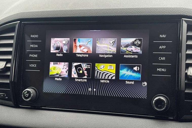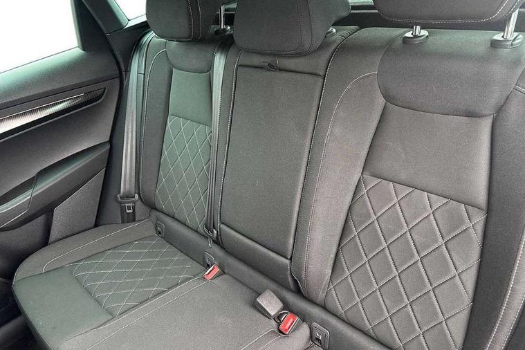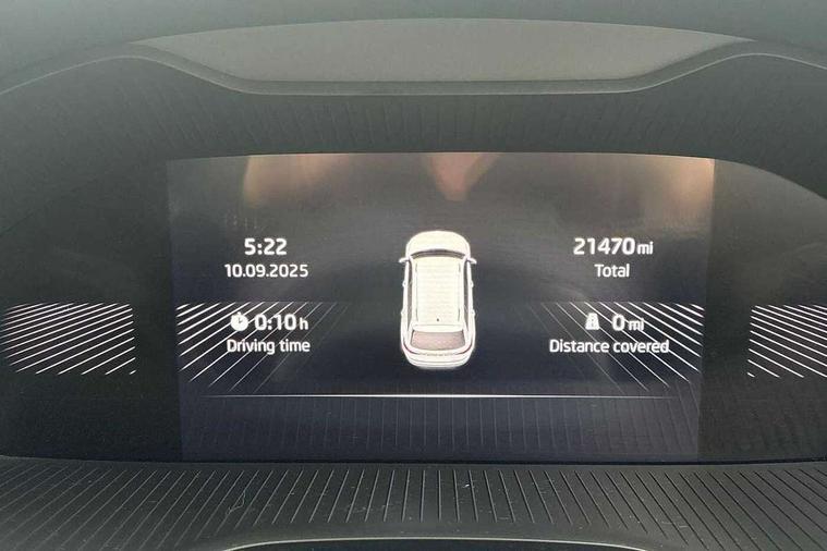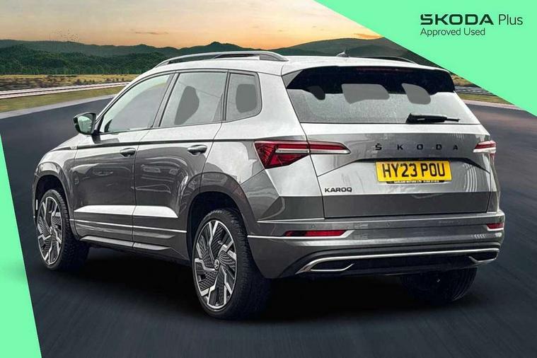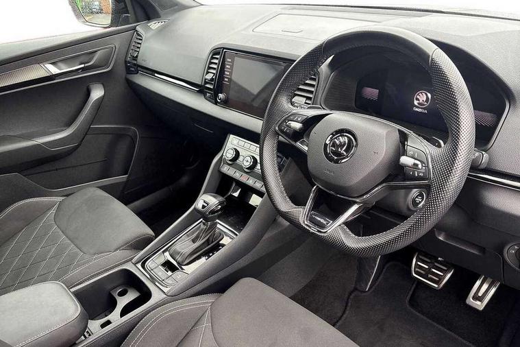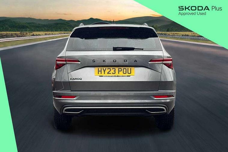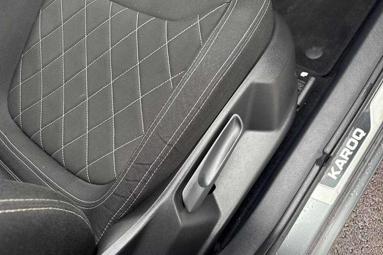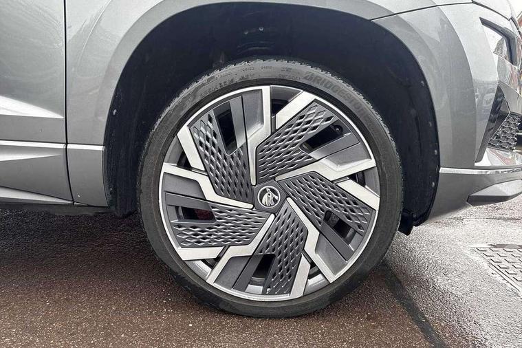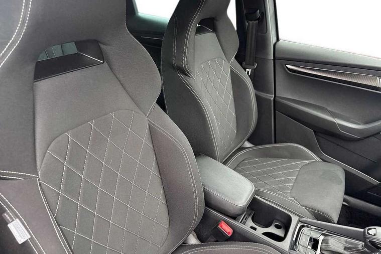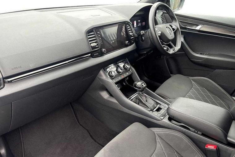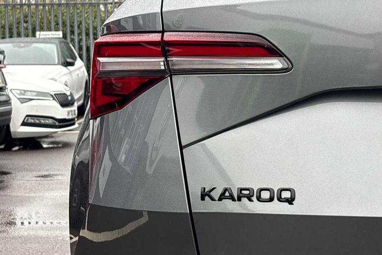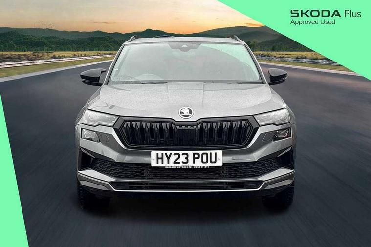 8" Digital display, Care connect, Driver fatigue sensor, Emergency services call system, Outside temperature gauge, Service interval indicator, SmartLink wireless for Apple and wired for Android, Start/stop system with regenerative braking, USB C Port x 2 in front centre console, Virtual cockpit, Virtual pedal with electrically operated boot door, 8 speakers, DAB radio with Bluetooth, USB connection, Acoustic glass, Aero front windscreen wipers with intermittent function, Auto dimming rear view mirror with light and rain sensors, Black door mirrors, Black electric window control buttons, Black radiator grille, Black roof rails, Body colour door handles, Dynamic headlight range control with cornering light function, Electric front and rear windows with child proof lock, Front door steps with SportLine logo, Heated rear windscreen, LED daytime running lights, LED rear lights with high functionality welcome effect and dynamic indicators, Light assistant (coming/leaving home/tunnel light), Panoramic sliding sunroof, Plastic scuff plates, Privacy glass, Protective door side sills in body colour, Rear diffuser, Rear side wing doors, Rear spoiler, Rear window wiper with washer system and intermittent control, Safety reflectors on front doors, Skoda lettering on tailgate in black, Sportline badge on front fender, Sportline decorative inserts with badging, Sports front and rear bumpers, Third brake light, 1.5 litre bottle holders in driver and front passenger door panels, 12V socket in boot, 12v socket in front centre armrest with storage compartment and rear air vents, 2 Folding hooks and nets in boot, 3 rear height adjustable headrests, 3 seat bench in 2nd row, 3 spoke leather sports multifunction steering wheel and silver stitching with gear shift paddles, 4 foldable roof handles with rear coat hooks, Black floor carpet, Black roof headlining, Chrome inner door handles, Double sided boot floor, Foldable hooks in the boot, Front head restraints, Height adjustable front three point seats belts with tensioners, Height/reach adjust steering wheel, Ice scraper, Illuminated glovebox, Illuminated luggage compartment, Isofix child seat preparation outer rear, Manual lumbar support for front seats, Pen holder, Pollen filter, Rear boot cover, Rear reading lights, Rear seats fixed folding and divided 60:40, Rubbish bin door, Safety vest holder, Single front passenger seat, Storage box in upper central dashboard closed, Sunvisors with illuminated vanity mirrors, Textile floor mats, Ticket holder, Titan black interior ceiling, Tool kit, Welcome animation with sportline logo, Light Pack - Karoq, Parking pack - Karoq, Automatic door unlocking in case of crash, Automatic fuel cut off in case of crash, Child locks on rear doors, Driver airbag, Electronic parking brake with auto hold function, Emergency rear braking signal, ESC including ABS, MSR, ASR, EDS, HBA, DSR, RBS, MKB and traction control, Front side airbags, Hill hold control, Knee airbags, Passenger airbag with switch-off function, Pedestrian monitor, Seatbelt reminder signalisation and pretensioner for all seats, Three point seatbelts rear, Two tone horn, Tyre pressure display, Tyre pressure monitor, Alarm with interior monitoring, back up horn and tilt sensor with safe function, Electronic engine immobiliser, Keyless entry and start/stop, Remote central locking with 2 remote folding keys, Black air vent surround, Black centre console, Satin black dashboard, Satin black door trim, 19" Vega black polished alloy wheels, Anti-theft wheel bolts protection, Matt black aero hub caps, Storage on wheel cover,