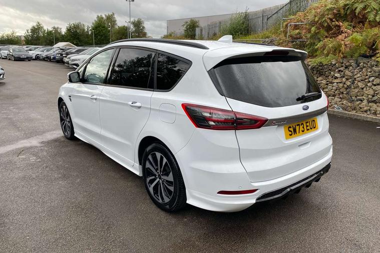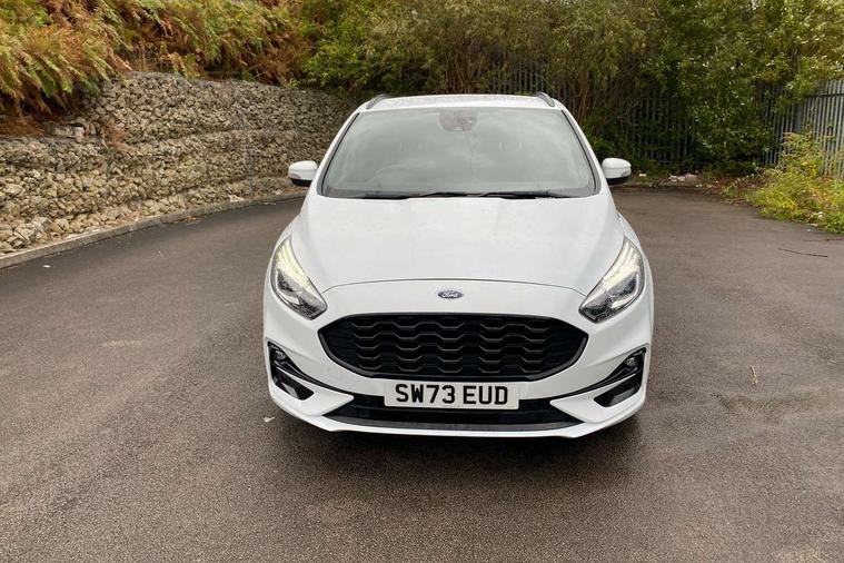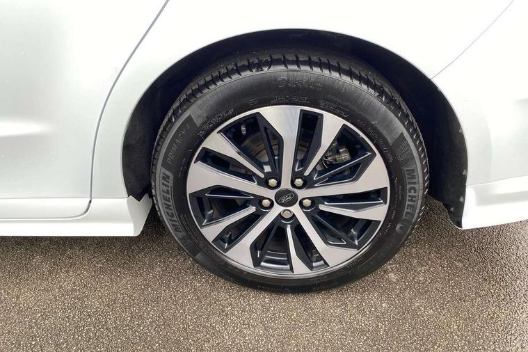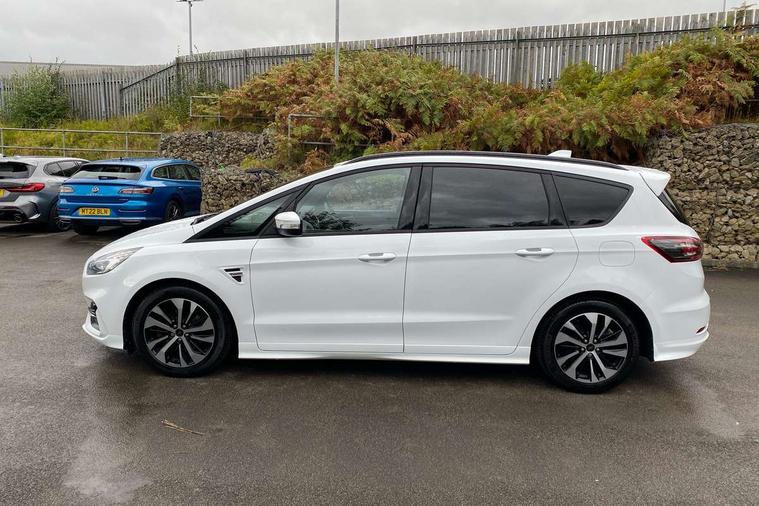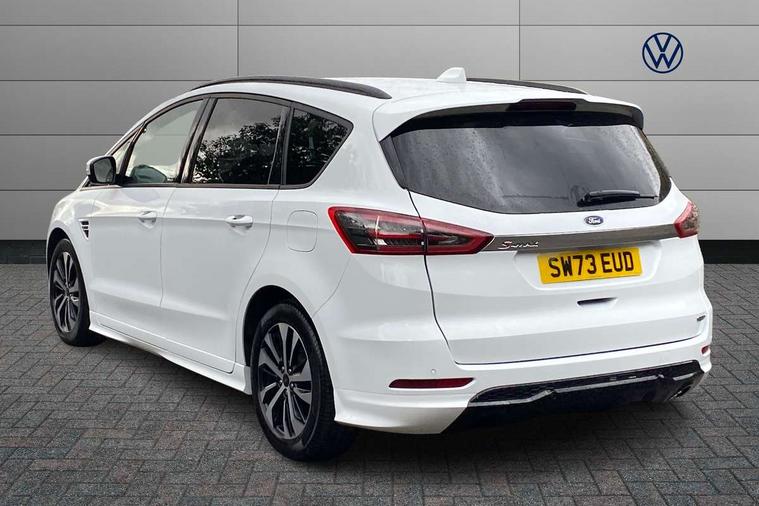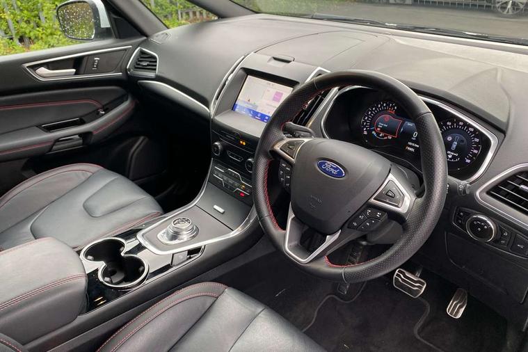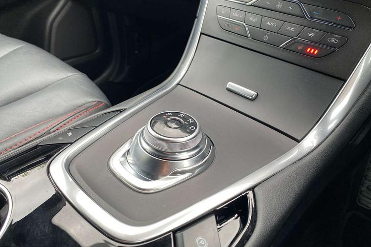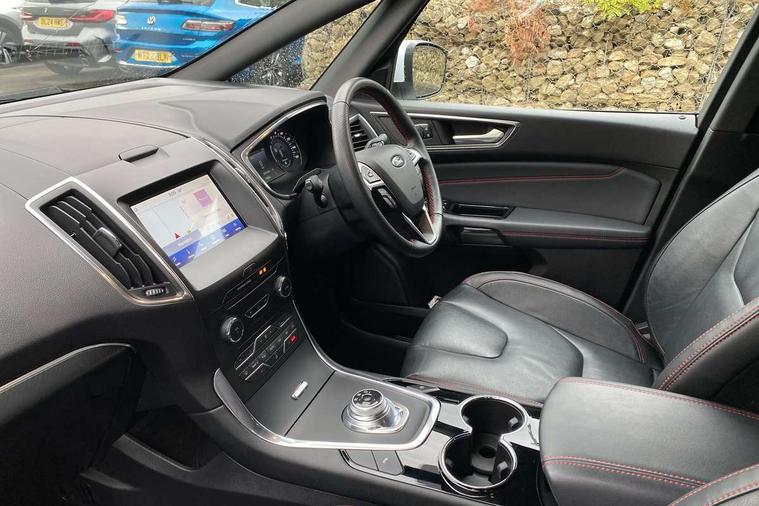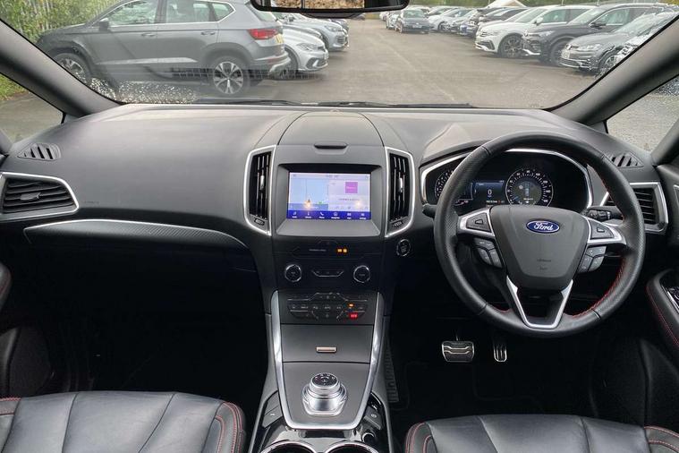 'Ford Power' starter button, 10.1" semi digital cluster, Easy fuel capless refuelling system, eCall emergency call system, Lane keeping aid including driver impairment monitor and active steering with lane departure warning, PAS, Rotary gear shift dial, Traffic sign recognition, Unique instrument cluster, Sports suspension, Steering wheel mounted controls, 3rd brake light, Auto dimming rear view mirror, Automatic headlights, Automatic wipers with variable sensitivity adjustment, Black trim to side windows, Body colour door handles, Body coloured bumpers, Full body coloured trim, Halogen front fog lights, Halogen projector headlights, LED daytime running lights, LED rear lights, Power fold mirrors - heated, indicators with puddle lamps, Power operated front and rear windows, Quickclear heated front windscreen, Rear privacy glass - dark glass to rear windows, Rear side wing doors, Rear spoiler, ST-Line illuminated scuff plates, Tailgate wash/wipe, Tinted glass, Unique front, rear and side sports bodystyling with dark exterior detailing, Unique ST-Line badging, 10 way power adjustable drivers seat with memory function, 10 way power passenger seats, 2 x 3rd row individual seats with fold flat, 230V power outlet in centre console, 3 x 2nd row individual seats wih fold flat, slide and recline, Aluminium sports pedals, Ambient lighting, Dark headliner, Dual zone electronic automatic temperature control, Floor mats in all three rows, Front and rear head restraints, Front seat back table trays, Heated steering wheel, ISOFIX attachments for child seats in 2nd row, Overhead console with sunglasses stowage, Perforated leather trimmed steering wheel with red stitching, Pollen and odor air filter, Reach and rake adjustable steering column, Salerno part leather upholstery with perforated miko suede inserts + red stitching, Single front passenger seat, Sports seats, Variable heated front seats, 3 point seatbelts on all seats, ABS/EBD, Driver/Front Passenger airbags, Drivers knee airbag, Electric handbrake, ESP+EBA, Front and rear (row 2) curtain airbags, Front side airbags, Manual child lock in rear doors, Passenger airbag deactivate switch, Pre collision assist system, Traction control, Tyre pressure monitoring system, Immobiliser, Keyless entry system, Locking wheel nuts, MyKey system, Remote control central locking, Thatcham alarm, Tyre inflation kit,