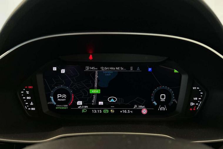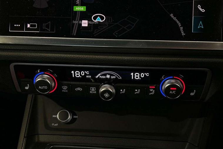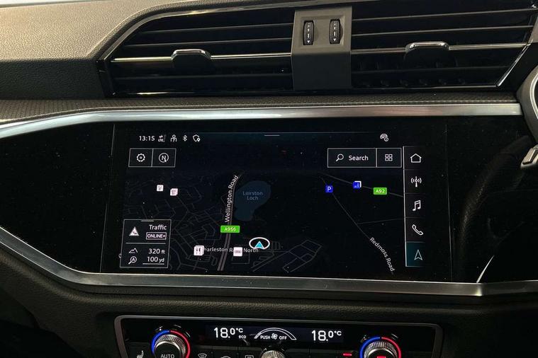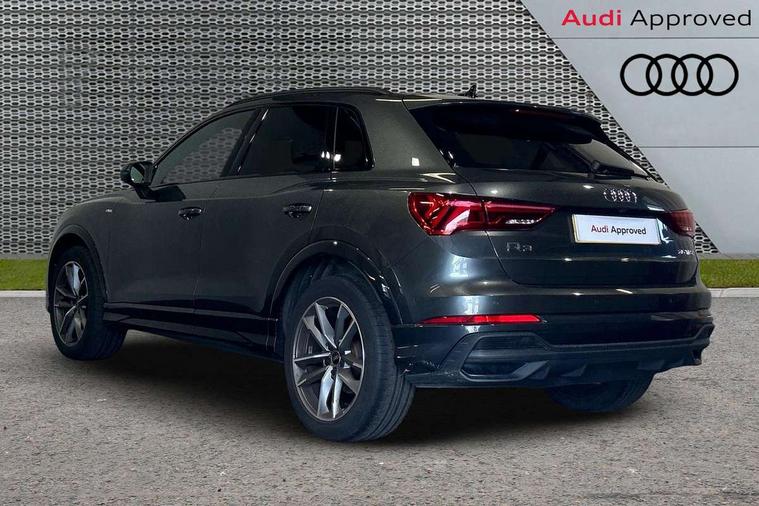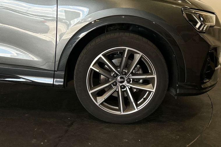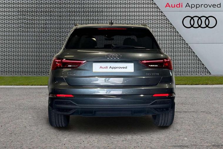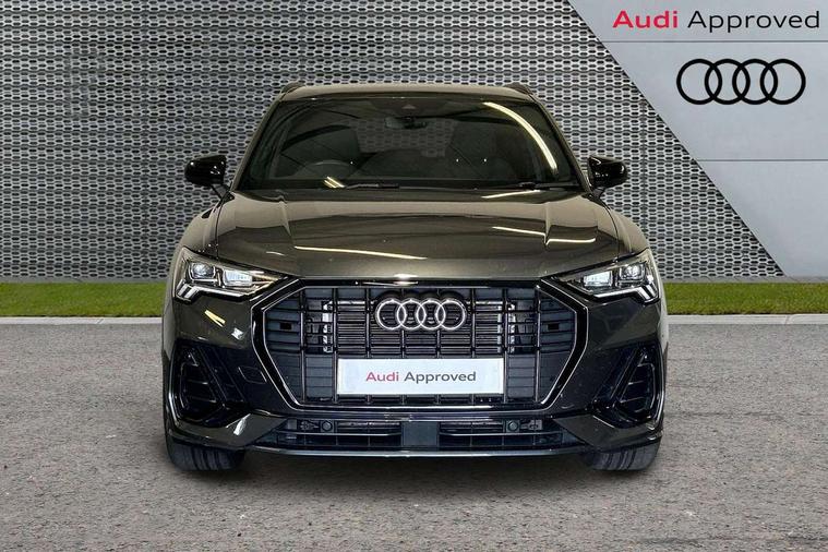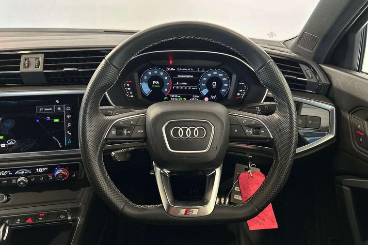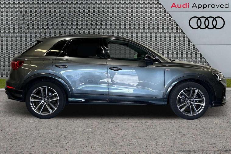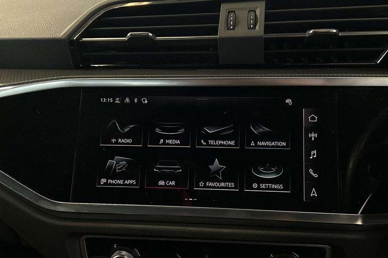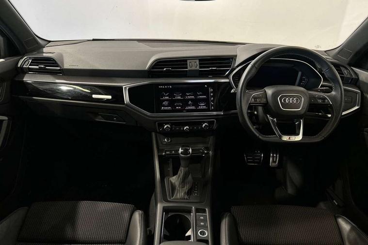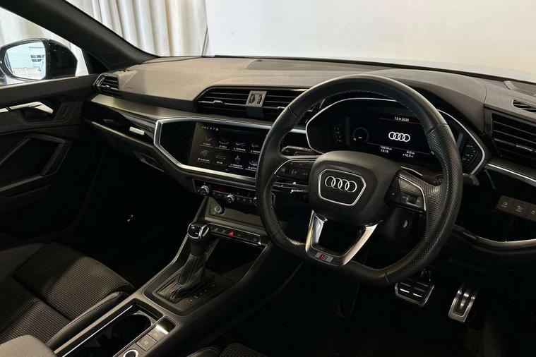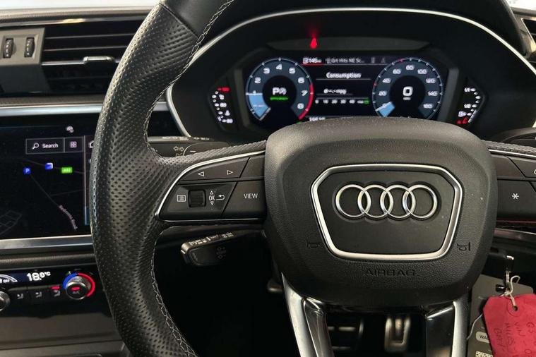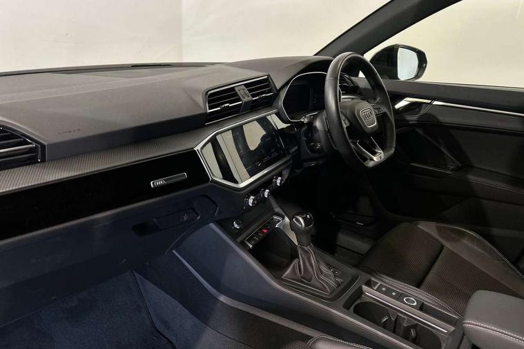 360 degree camera, Amazon alexa Integration, Audi connect safety and service, Audi drive select, Audi lane departure warning, Audi Virtual Cockpit - 10.25" display, Bluetooth interface, Camera based traffic sign recognition, Distraction and Fatigue warning, Legal emergency call, MMI Navigation Plus with high resolution 10.1 inch touchscreen colour display, Phonebox light with wireless charging, Power operated tailgate, Progressive steering, Service interval indicator, Smartphone interface includes wireless Apple carplay/Android Auto, Start stop system with recuperation, Voice control system with natural language interaction, Sports suspension, 2 USB-C ports with charge and data functions, DAB digital radio module, SONOS premium sound system, Acoustic windscreen, Anthracite black radiator grille, Audi Beam uses LEDs to project the Audi logo onto the ground as you exit your Q3, Auto dimming door mirrors, Auto dimming frameless rear view mirror, Black roof rails, Electrically folding, adjustable and heated door mirrors with integrated LED side indicators and kerb view function for passenger side, Front and rear electric windows, Front fog lights, Grille vertical bars in aluminium silver/Matt, High gloss black finish B and C pillars, LED Dynamic rear indicators, LED rear lights, LED third brake light, Matrix LED headlights with LED daytime running lights, Panoramic glass sunroof, Privacy glass dark tinted rear and rear-side windows (from B-pillar backwards), Rain and light sensors, Rear diffuser grille in grained matt black, Rear diffuser strip in matt anthracite black, Rear side wing doors, Rear wiper, S line bumpers in contrasting Manhattan grey, Variable front intermittent wipers, 12V socket in rear centre console, 3 seat bench in 2nd row, 40:20:40 folding with manual adjustment for 60:40 forwards/backwards position and backrest angle, Adjustable rear seat bench/backrest with centre armrest and cupholder, Black carpet mats, Black cloth headlining, Dual zone electronic climate control, Electric lumbar support, Electrically adjustable front seats, Front and rear black floor mats with contrast stitching in rock grey, Front and rear headrests, Front centre armrest, Heated front seats, Height and reach adjustable steering wheel, Illuminated door sill trims with S logo, ISOFIX child seat mounting for front passenger with airbag deactivation and outer rear seat including top tether attachment point for outer rear seats, Luggage compartment sill protection in stainless steel, Perforated leather gearknob, Single front passenger seat, Stainless steel pedals, Twin leather upholstery with front sport seats + S embossing, Black styling pack - Q3, Non smoking pack - Q3, 3x3 point rear seatbelts, 6 airbags - Driver, front passenger, curtain and side windows, Audi pre-sense front with pedestrain and cyclist recognition, Electrically operated child locks on rear doors, Electromechanical parking brake, Electronic stabilisation control including ABS, ASR and EDL, Front seatbelt reminder, Hill descent control, Hill hold assist, Pre sense basic, Seatbelt monitoring, Tyre pressure warning, Warning triangle and first aid kit, Advanced key, Anti theft wheel bolts, Immobiliser, Remote central locking, Thatcham approved category 1 anti theft alarm, Aluminium look interior elements, Detail dashboard around MMI touch colour display in glass look, black with surround in aluminium look, Leatherette door armrest, Piano black inlay,