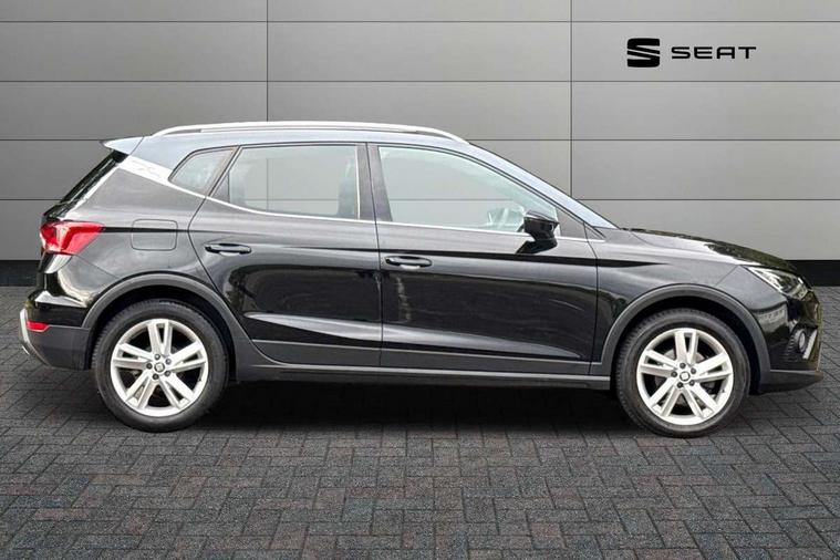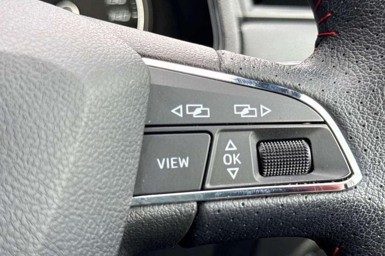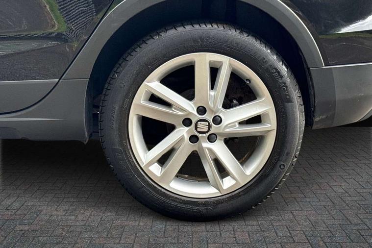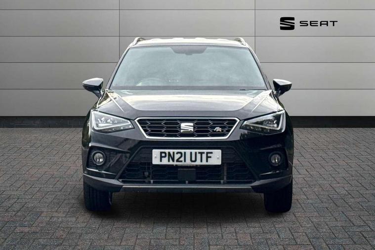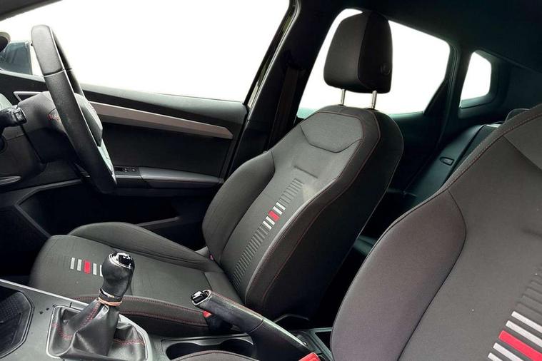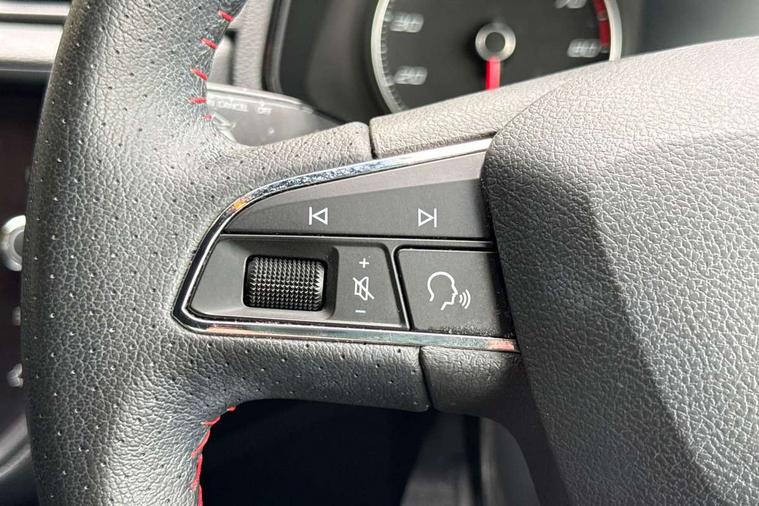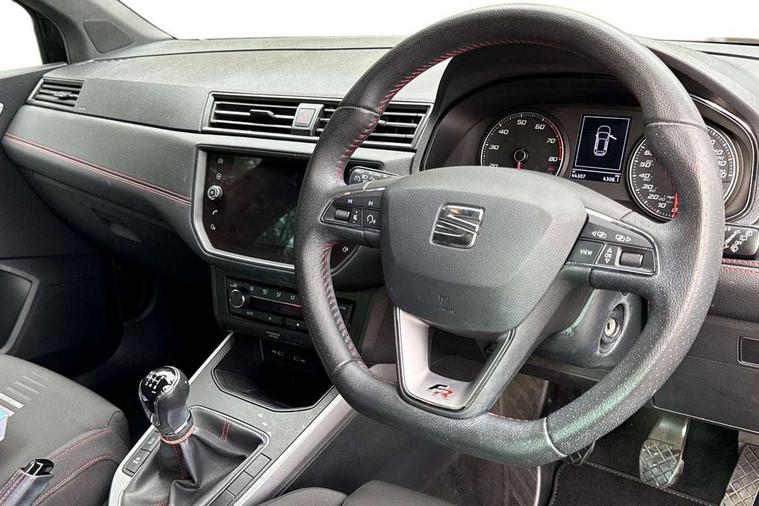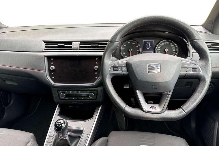 'Lights On' Reminder warning buzzer, Cruise control and speed limiter, Digital clock, Electric speed sensitive power steering, Full Link Smartphone Integration with Mirror Link, Apple Car Play, Google Android Auto with USB Type C cable for Apple and Android compatibility, Low fuel warning light, Outside temperature display, Rear parking sensor, RPM counter, Seat connect with safety, service, remote and online, SEAT Drive profile - Four different models normal-sport-eco-individual, steering response, throttle response, Trip computer, Sports suspension, Bluetooth interface for hands free and audio streaming, DAB digital radio and AM/FM radio, Steering wheel mounted audio controls, Anti theft roof antenna, Auto dimming interior rear view mirror, Automatic activation of hazard warning lights, Automatic headlights, Body coloured bumpers, Body coloured door handle inserts, Chrome front grille frame, Chrome roof rails, Chrome window trim, Coming/leaving home lighting function, Dark tinted rear windows, Electric front/rear windows with one touch/auto up/down, Electrically adjustable, heated and folding door mirrors, Full LED headlights dipped and mainbeam + front and rear fog lights, LED daytime running lights, LED rear tail lights and licence plate lights, Protective side mouldings, Rain sensing wipers, Rear window wash/wipe, Roof colour door mirrors, Twin exhaust pipe styling hidden exhaust pipe, Visible VIN plate, Windshield wiper with intermittent control and potentiometer, 2 cupholders, 60/40 split folding rear seat, Aircare filter, Black interior roof, Double boot floor, Driver sunvisor with covered mirror + card holder, Dual zone climate control, Front courtesy light with front reading lights, Front sport seats, Gear shift indicator, Height adjustable front seats, Height/reach adjustable steering column, Illuminated boot, Instrument lighting with brightness control, Interior light in footwell, central console and door panel, ISOFIX points in outer rear seats with top tether anchorage points, Multi-colour ambient interior lighting, Nora cloth upholstery, Passenger sunvisor with vanity mirror, Perforated flat bottomed leather steering wheel/gear knob/handbrake with red stitching and FR logo, Two front and three rear height adjustable headrests, Connectivity pack plus - Arona, Interior chrome pack - Arona, 3 point seatbelts on all rear seats, ABS, Active front headrests, Child locks on rear doors, Driver and front passenger airbags with front passenger airbag de activation, front side and curtain airbags, Electronic stability control, Emergency Brake Assist (EBA) and front assist, Front and rear seatbelt reminder, Hill hold control, Multi-Collision braking, Tiredness recognition system, Traction control, Tyre pressure monitoring system, 2 folding remote keys with window open/close function, Alarm with back-up horn, Electronic engine immobiliser, Locking wheel bolts, Remote central locking + deadlocks, Tow away protection, Interior chrome line trim, Leatherette dashboard, 17" Dynamic alloy wheels,