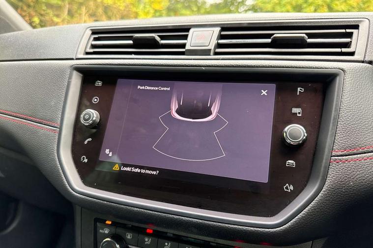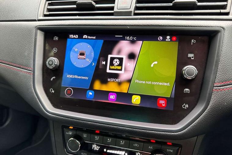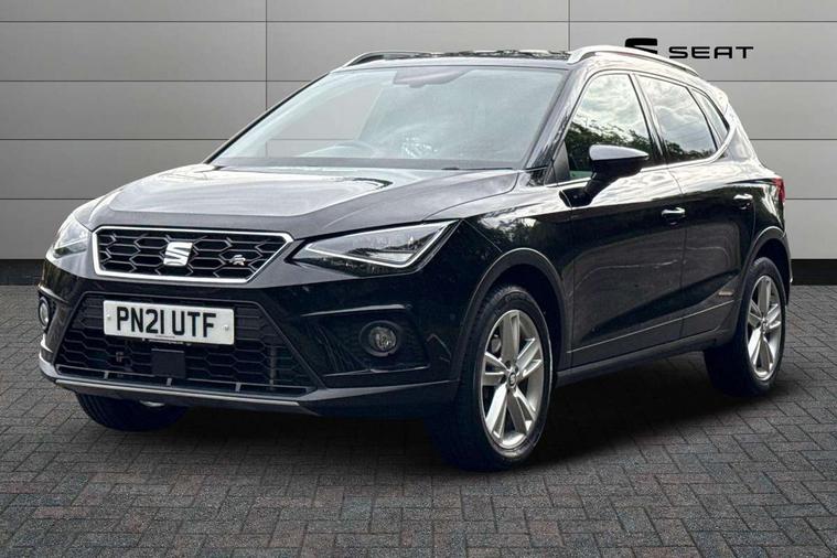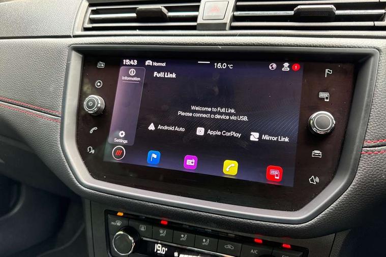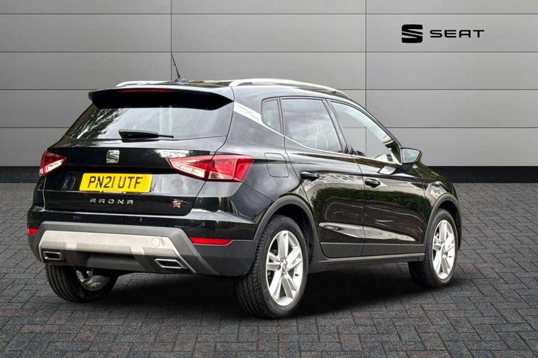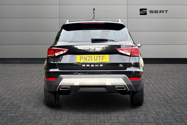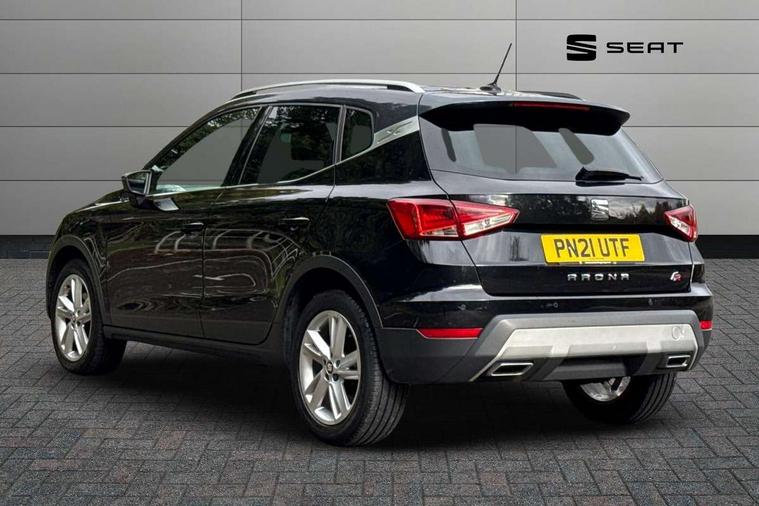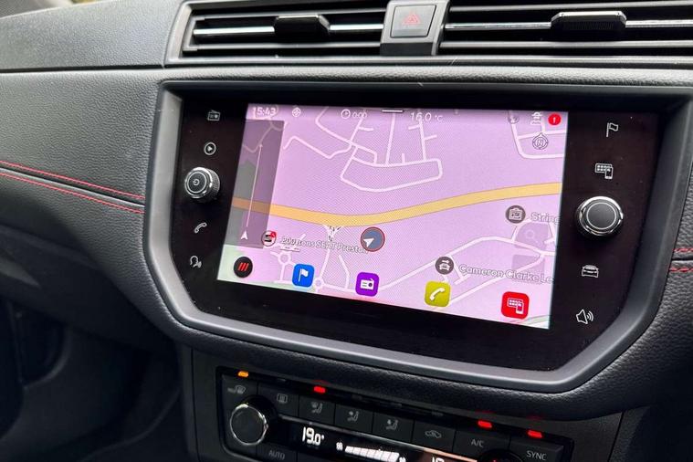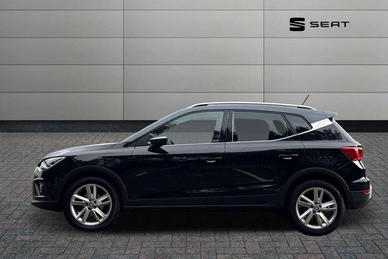 'Lights On' Reminder warning buzzer, Cruise control and speed limiter, Digital clock, Electric speed sensitive power steering, Full Link Smartphone Integration with Mirror Link, Apple Car Play, Google Android Auto with USB Type C cable for Apple and Android compatibility, Low fuel warning light, Outside temperature display, Rear parking sensor, RPM counter, Seat connect with safety, service, remote and online, SEAT Drive profile - Four different models normal-sport-eco-individual, steering response, throttle response, Trip computer, Sports suspension, Bluetooth interface for hands free and audio streaming, DAB digital radio and AM/FM radio, Steering wheel mounted audio controls, Anti theft roof antenna, Auto dimming interior rear view mirror, Automatic activation of hazard warning lights, Automatic headlights, Body coloured bumpers, Body coloured door handle inserts, Chrome front grille frame, Chrome roof rails, Chrome window trim, Coming/leaving home lighting function, Dark tinted rear windows, Electric front/rear windows with one touch/auto up/down, Electrically adjustable, heated and folding door mirrors, Full LED headlights dipped and mainbeam + front and rear fog lights, LED daytime running lights, LED rear tail lights and licence plate lights, Protective side mouldings, Rain sensing wipers, Rear window wash/wipe, Roof colour door mirrors, Twin exhaust pipe styling hidden exhaust pipe, Visible VIN plate, Windshield wiper with intermittent control and potentiometer, 2 cupholders, 60/40 split folding rear seat, Aircare filter, Black interior roof, Double boot floor, Driver sunvisor with covered mirror + card holder, Dual zone climate control, Front courtesy light with front reading lights, Front sport seats, Gear shift indicator, Height adjustable front seats, Height/reach adjustable steering column, Illuminated boot, Instrument lighting with brightness control, Interior light in footwell, central console and door panel, ISOFIX points in outer rear seats with top tether anchorage points, Multi-colour ambient interior lighting, Nora cloth upholstery, Passenger sunvisor with vanity mirror, Perforated flat bottomed leather steering wheel/gear knob/handbrake with red stitching and FR logo, Two front and three rear height adjustable headrests, Connectivity pack plus - Arona, Interior chrome pack - Arona, 3 point seatbelts on all rear seats, ABS, Active front headrests, Child locks on rear doors, Driver and front passenger airbags with front passenger airbag de activation, front side and curtain airbags, Electronic stability control, Emergency Brake Assist (EBA) and front assist, Front and rear seatbelt reminder, Hill hold control, Multi-Collision braking, Tiredness recognition system, Traction control, Tyre pressure monitoring system, 2 folding remote keys with window open/close function, Alarm with back-up horn, Electronic engine immobiliser, Locking wheel bolts, Remote central locking + deadlocks, Tow away protection, Interior chrome line trim, Leatherette dashboard, 17" Dynamic alloy wheels,
