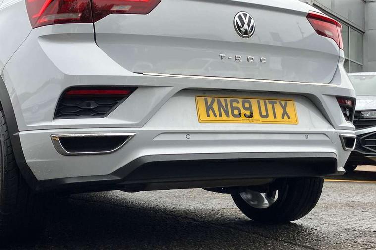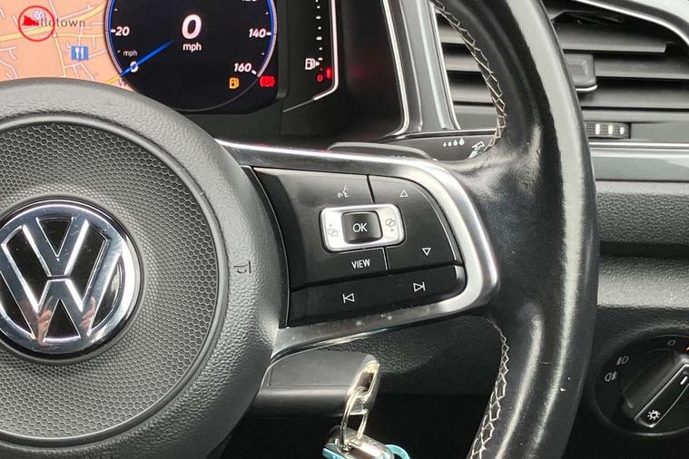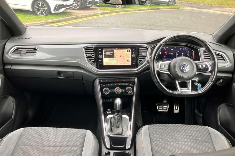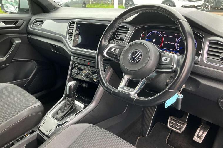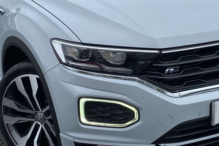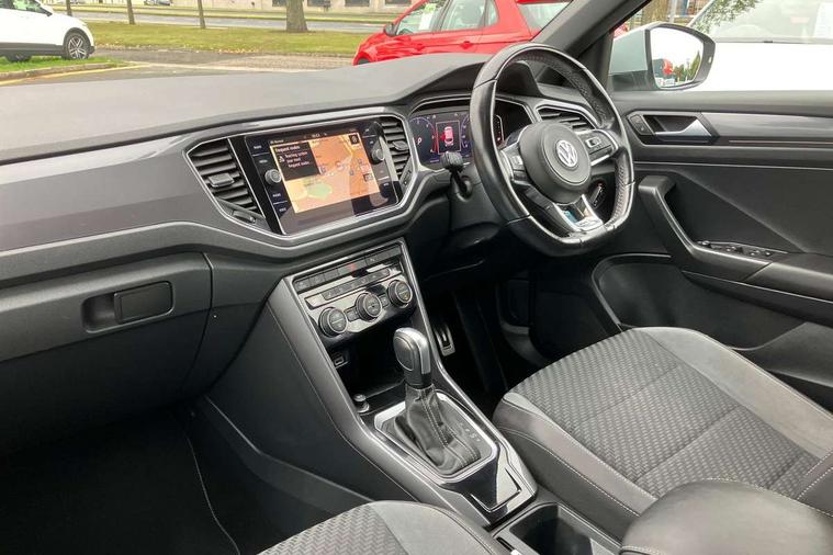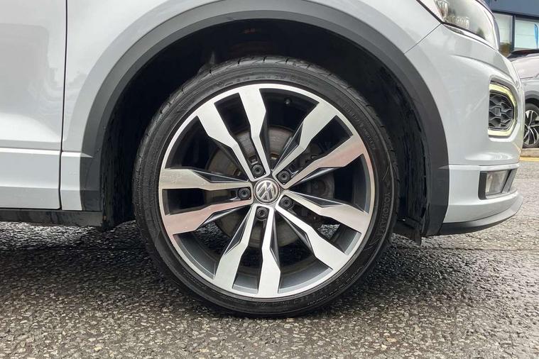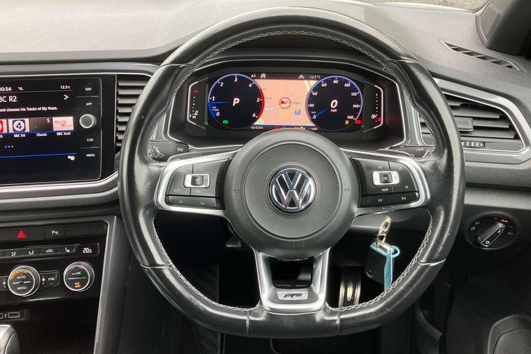 Shadow steel decorative inserts in dash and door panel, R line styling pack - T-Roc, Winter pack - T-Roc, 19" Suzuka alloy wheels with low rolling resistance tyres and anti wheel bolts, Steel space saver spare wheel, Alarm with remote central locking and interior protection, Electronic engine immobiliser, Remote central locking with 2 remote folding keys, Bluetooth - Simultaneous pairing of 2 compatible mobile devices, DAB Digital radio, Dynamic navigation based on TMC+, Front USB type C Interface 2X and USB charging socket, Multi device interface (MDI) with USB connection, Music playback - MP3, WMA and AAC files, Premium USB cable in choice of either Apple or Android smartphone compatibility, SD card slot, SMS functionality - read, compose and send SMS messages using touch-screen display, Three route options - Fast, Short, Eco, Title and cover art display, 3 rear three point seatbelts, ABS, Driver and front passenger safety-optimised head restraints, Electronic parking brake with auto hold, Electronic stability control (ESC) includes ASR, EDL, EDTC and trailer stabilisation function, ESC with EDL, ASR, EDTC and trailer stabilisation function, Front and rear curtain airbags, driver and front passenger airbags with passenger deactivation switch and front side impact airbags, Rigid safety cell with front and rear crumple zones, Three point height adjust front seatbelts + pretensioners, Tyre pressure loss indicator, Ventilated front and rear disc brakes, Volkswagen roadside assistance, Auto dimming interior rear view mirror, Automatic hazard lights activation under emergency braking, Black grained lower door protectors, Black grained wheel arches, Body colour door handles, Body colour rear roof spoiler, Chrome effect left and right trapezoid exhaust tailpipe fascia surround, Chrome trim on upper and lower radiator grille, Door mirror integrated indicators, Electrically foldable, adjustable and heated door mirrors with puddle lights and reverse activated kerb-view adjustment on passenger's door mirror, Front and rear electric windows, Front fog lights with static cornering function, Front windscreen wiper with intermittent wipe and 4 position delay, Fully galvanised body, Heated rear window, High level 3rd brake light, LED darkened rear light clusters, LED rear number plate lights, Manual coming/automatic leaving home lighting function, Rain sensor, Rear tinted glass from B-pillar backwards approx 65% tinted, Rear windscreen washer and wiper with interval delay, Windscreen wiper with intermittent wipe light, 12V socket in centre console storage area, 2 LED front and rear reading lights, 3 rear head restraints, 4 load lashing points in luggage compartment, Aluminium pedals, Ambient lighting in front footwell and light strips below trim in front doors, Black decorative sleeve on gear handles, Black roof lining and sun visors, Carbon flag cloth upholstery, Climate control - 2 zone electronic air conditioning with automatic air recirculation and allergy filter, Drawer under drivers seat, Front + rear carpet mats, Front centre armrest with storage compartment, longitudinal and height adjustable and two rear air vents, Front cupholders x 2, Front footwell illumination, Front seat back storage pockets, Front sport seats, Glovebox, Height adjustable front seats, Height/reach adjust steering wheel, Illuminated vanity mirrors, Illuminated vanity mirrors in sun visors with air bag label on sun visor and b-pillar, Instrument lighting, white adjustable panel illumination, Interior light delay, Isofix easy fit child seat preparation for 2 outer rear seats, Load through provision with single cup holder when folded down, Luggage compartment cover, removable, Luggage compartment lighting, R Line badge, Split folding rear seat backrests with centre armrest, Storage compartment in left and right luggage area, Storage compartment in rear doors, Storage compartments in driver and front passenger doors, Three spoke multi function leather trimmed steering wheel and gear knob including paddle shift, Unique R Line door sill protectors, App-Connect, 2 USB connection charging sockets, Active Info Display, 10.3" high resolution TFT dash display screen with customised information, Adaptive cruise control, Automatic start/stop system, Bluetooth telephone and audio connection for compatible devices, Car information display, Car-Net Security and Service, Discover navigation, 8" touch screen navigation/infotainment system with Car-Net, European map, CD/radio, 2D/3D map and speed limiter, Driver alert system with audible and visual fatigue detection system, Driver alert system with fatigue detection, Driver profile selection, Driver profile selection including ECO function, Driver tips and journey analysis, Dusk sensor, Front assist, radar sensor controlled distance monitor, city emergency braking + predictive pedestrian protection, Lane assist, Multifunction computer with visual gear change recommendation for fuel consumption, Progressive power assisted steering, Service interval indicator, Think blue trainer driver tips and journey analysis, Voice activation, Warning sound and light for doors and tailgate open, Warning sound and light for front and rear seat belts if unfastened, Warning sound and light for front seatbelts unfastened, Battery regeneration during braking, Misfuel prevention device for diesel engine,