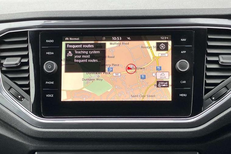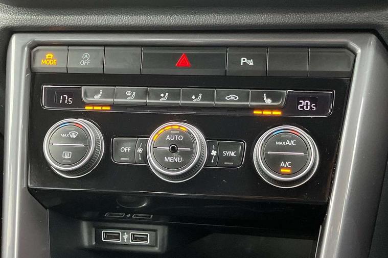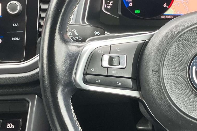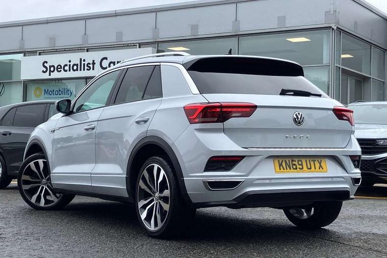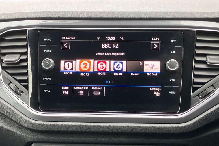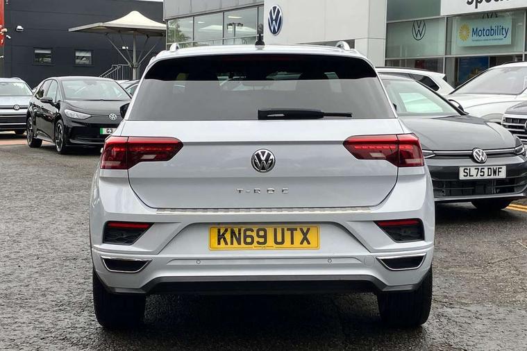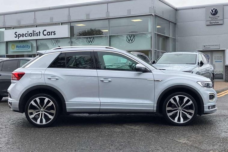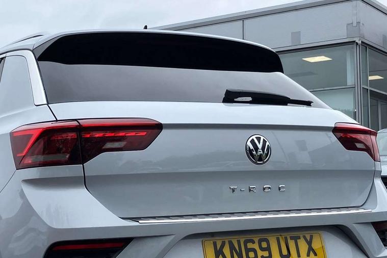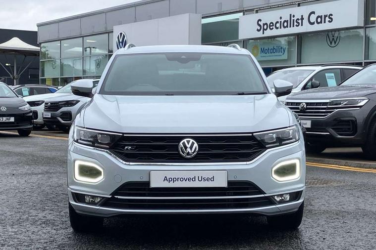 Shadow steel decorative inserts in dash and door panel, R line styling pack - T-Roc, Winter pack - T-Roc, 19" Suzuka alloy wheels with low rolling resistance tyres and anti wheel bolts, Steel space saver spare wheel, Alarm with remote central locking and interior protection, Electronic engine immobiliser, Remote central locking with 2 remote folding keys, Bluetooth - Simultaneous pairing of 2 compatible mobile devices, DAB Digital radio, Dynamic navigation based on TMC+, Front USB type C Interface 2X and USB charging socket, Multi device interface (MDI) with USB connection, Music playback - MP3, WMA and AAC files, Premium USB cable in choice of either Apple or Android smartphone compatibility, SD card slot, SMS functionality - read, compose and send SMS messages using touch-screen display, Three route options - Fast, Short, Eco, Title and cover art display, 3 rear three point seatbelts, ABS, Driver and front passenger safety-optimised head restraints, Electronic parking brake with auto hold, Electronic stability control (ESC) includes ASR, EDL, EDTC and trailer stabilisation function, ESC with EDL, ASR, EDTC and trailer stabilisation function, Front and rear curtain airbags, driver and front passenger airbags with passenger deactivation switch and front side impact airbags, Rigid safety cell with front and rear crumple zones, Three point height adjust front seatbelts + pretensioners, Tyre pressure loss indicator, Ventilated front and rear disc brakes, Volkswagen roadside assistance, Auto dimming interior rear view mirror, Automatic hazard lights activation under emergency braking, Black grained lower door protectors, Black grained wheel arches, Body colour door handles, Body colour rear roof spoiler, Chrome effect left and right trapezoid exhaust tailpipe fascia surround, Chrome trim on upper and lower radiator grille, Door mirror integrated indicators, Electrically foldable, adjustable and heated door mirrors with puddle lights and reverse activated kerb-view adjustment on passenger's door mirror, Front and rear electric windows, Front fog lights with static cornering function, Front windscreen wiper with intermittent wipe and 4 position delay, Fully galvanised body, Heated rear window, High level 3rd brake light, LED darkened rear light clusters, LED rear number plate lights, Manual coming/automatic leaving home lighting function, Rain sensor, Rear tinted glass from B-pillar backwards approx 65% tinted, Rear windscreen washer and wiper with interval delay, Windscreen wiper with intermittent wipe light, 12V socket in centre console storage area, 2 LED front and rear reading lights, 3 rear head restraints, 4 load lashing points in luggage compartment, Aluminium pedals, Ambient lighting in front footwell and light strips below trim in front doors, Black decorative sleeve on gear handles, Black roof lining and sun visors, Carbon flag cloth upholstery, Climate control - 2 zone electronic air conditioning with automatic air recirculation and allergy filter, Drawer under drivers seat, Front + rear carpet mats, Front centre armrest with storage compartment, longitudinal and height adjustable and two rear air vents, Front cupholders x 2, Front footwell illumination, Front seat back storage pockets, Front sport seats, Glovebox, Height adjustable front seats, Height/reach adjust steering wheel, Illuminated vanity mirrors, Illuminated vanity mirrors in sun visors with air bag label on sun visor and b-pillar, Instrument lighting, white adjustable panel illumination, Interior light delay, Isofix easy fit child seat preparation for 2 outer rear seats, Load through provision with single cup holder when folded down, Luggage compartment cover, removable, Luggage compartment lighting, R Line badge, Split folding rear seat backrests with centre armrest, Storage compartment in left and right luggage area, Storage compartment in rear doors, Storage compartments in driver and front passenger doors, Three spoke multi function leather trimmed steering wheel and gear knob including paddle shift, Unique R Line door sill protectors, App-Connect, 2 USB connection charging sockets, Active Info Display, 10.3" high resolution TFT dash display screen with customised information, Adaptive cruise control, Automatic start/stop system, Bluetooth telephone and audio connection for compatible devices, Car information display, Car-Net Security and Service, Discover navigation, 8" touch screen navigation/infotainment system with Car-Net, European map, CD/radio, 2D/3D map and speed limiter, Driver alert system with audible and visual fatigue detection system, Driver alert system with fatigue detection, Driver profile selection, Driver profile selection including ECO function, Driver tips and journey analysis, Dusk sensor, Front assist, radar sensor controlled distance monitor, city emergency braking + predictive pedestrian protection, Lane assist, Multifunction computer with visual gear change recommendation for fuel consumption, Progressive power assisted steering, Service interval indicator, Think blue trainer driver tips and journey analysis, Voice activation, Warning sound and light for doors and tailgate open, Warning sound and light for front and rear seat belts if unfastened, Warning sound and light for front seatbelts unfastened, Battery regeneration during braking, Misfuel prevention device for diesel engine,