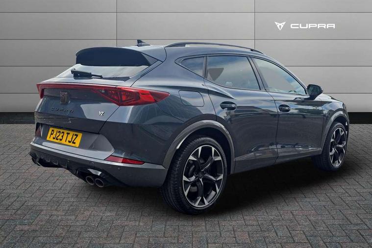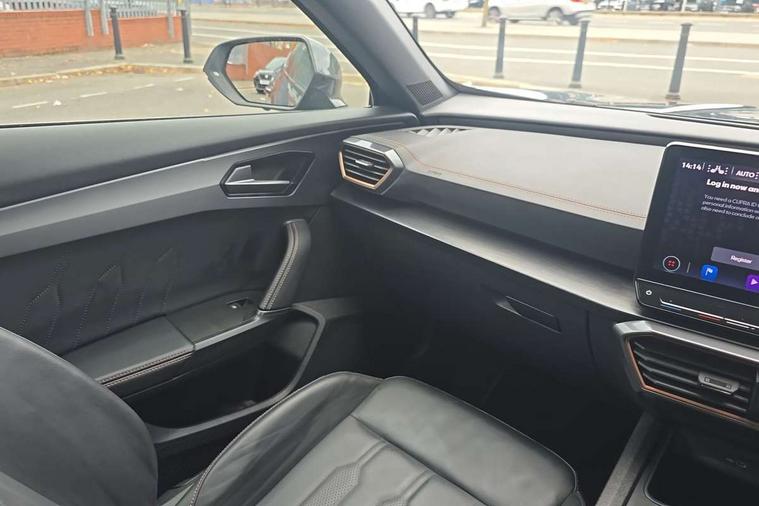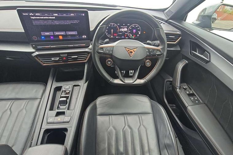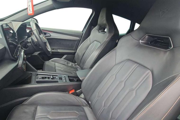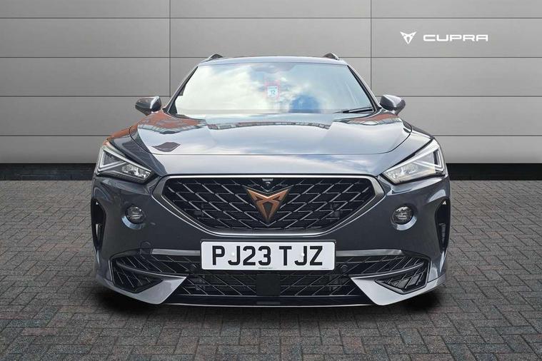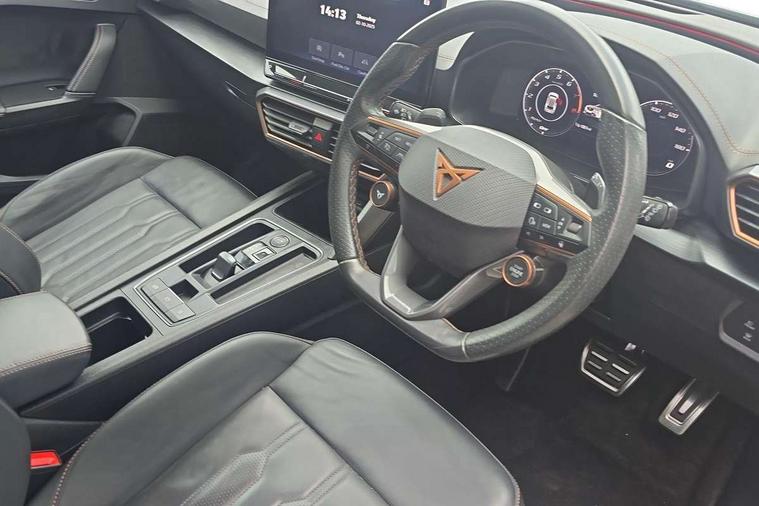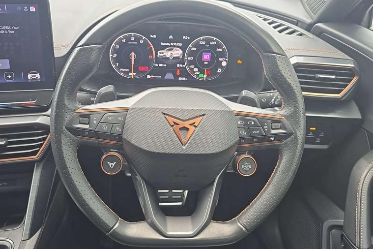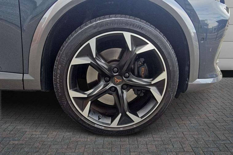 Digital cockpit and configurable dashboard, Driver alert system, Dynamic chassis control with driving profile selection (Comfort, Sport, CUPRA, Individual), Forward collision warning with automatic braking, Lane assist, Navigation system with 12'' Touchscreen Display, Park assist (inc front/rear parking sensors), Predictive adaptive cruise control with speed limiter, RPM, trip computer, outside temp gauge, instrument light brightness, low fuel warning light, lights on reminder, gearshift indicator, Service interval indicator, Speed sensitive power steering, Start/stop system with regenerative braking, Virtual pedal and electric tailgate, Voice control system, Wired Android Auto, Wireless apple carplay, Wireless phone charger, Electronic locking differential and dynamic traction support, Sports suspension with front shock absoption, 2 front and 2 rear USB type C sockets, Auxiliary input socket, DAB radio, Auto dimming rear view mirror, Body colour door handles, Body coloured bumpers, Dark grey wing mirror, Daytime running light with automatic headlight control and coming home feature, Dynamic headlight range control, Electric front/rear windows, Electrically adjustable heated and folding door mirrors with memory function, Front fog lamps with cornering function, Gloss black roof rails and window surrounds, LED Headlights, LED Taillights with dynamic indicator, Rain sensing wipers, Rear diffuser with twin exhaust pipe on each side, Rear side wing doors, Rear wash/wipe, Sports bumpers, Third brake light, Tinted rear windows, VZ logo rear badging, Welcome lights, 12v power supply in centre console, 12V socket, 12v socket in loadspace, 2 front and 2 rear reading lights, 230V socket, 3 seat bench in 2nd row, 60/40 split rear bench seat with armrest and mechanical seat release, Black headlining, Cupra sports pedals, Dust/pollen filter, Front and rear head restraints, Front centre armrest, Height/reach adjust steering wheel, Illuminated interior front door sills, Illuminated sunvisor with mirror, Isofix, Leather heated multi-function sports steering wheel with start stop, CUPRA mode button and gear shift paddles, Luggage tie-down hooks, Single front passenger seat, Three zone climate control with control panel in rear, Variable luggage/load compartment floor, Wraparound lighting, Genuine Nappa leather Pack - Cupra, Safety and driving pack (XL) - Formentor, 3 point seatbelts on all rear seats, ABS, Brake control system - ESC and brake booster, Child proof door locks, Driver and front passenger airbags with front passenger airbag de-activation, Electronic parking brake, Front and rear disc brakes, Front side curtain airbags, Hill hold control, Public e-call, Seat belt reminder for front and rear seats, Tyre pressure monitoring system, Anti theft alarm system, Keyless entry and start system (KESSY), Locking wheel bolts, Copper and aluminium interior detailing, 19" 'Exclusive' machined sport matte black and silver alloy wheels, Space saver spare wheel,