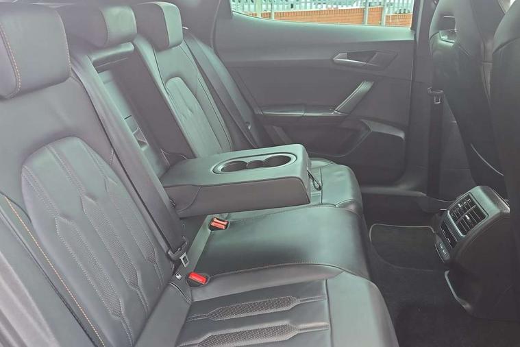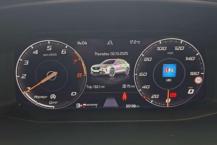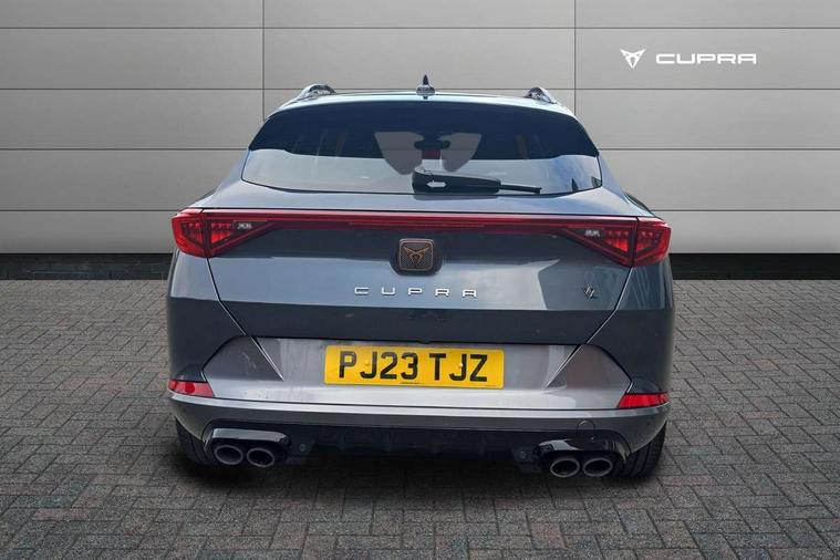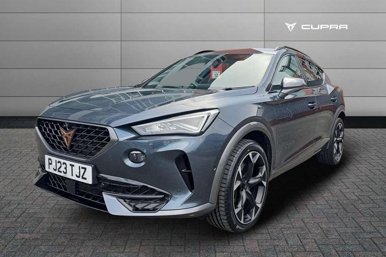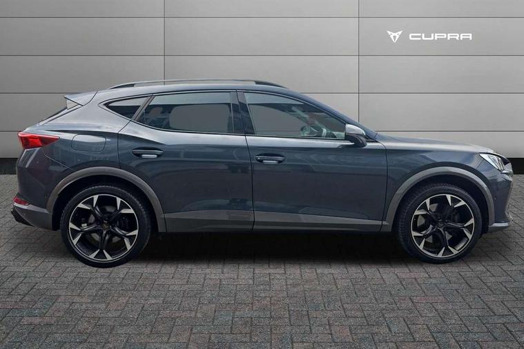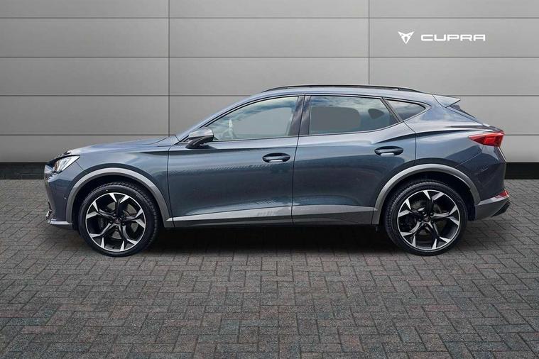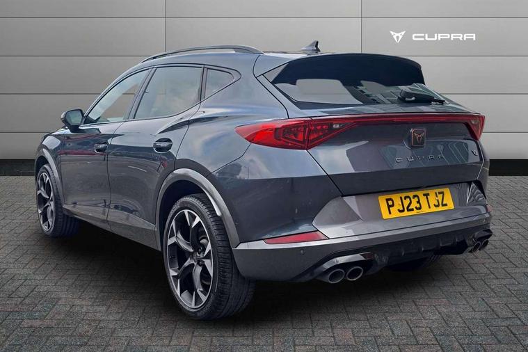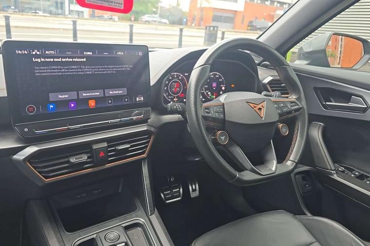 Digital cockpit and configurable dashboard, Driver alert system, Dynamic chassis control with driving profile selection (Comfort, Sport, CUPRA, Individual), Forward collision warning with automatic braking, Lane assist, Navigation system with 12'' Touchscreen Display, Park assist (inc front/rear parking sensors), Predictive adaptive cruise control with speed limiter, RPM, trip computer, outside temp gauge, instrument light brightness, low fuel warning light, lights on reminder, gearshift indicator, Service interval indicator, Speed sensitive power steering, Start/stop system with regenerative braking, Virtual pedal and electric tailgate, Voice control system, Wired Android Auto, Wireless apple carplay, Wireless phone charger, Electronic locking differential and dynamic traction support, Sports suspension with front shock absoption, 2 front and 2 rear USB type C sockets, Auxiliary input socket, DAB radio, Auto dimming rear view mirror, Body colour door handles, Body coloured bumpers, Dark grey wing mirror, Daytime running light with automatic headlight control and coming home feature, Dynamic headlight range control, Electric front/rear windows, Electrically adjustable heated and folding door mirrors with memory function, Front fog lamps with cornering function, Gloss black roof rails and window surrounds, LED Headlights, LED Taillights with dynamic indicator, Rain sensing wipers, Rear diffuser with twin exhaust pipe on each side, Rear side wing doors, Rear wash/wipe, Sports bumpers, Third brake light, Tinted rear windows, VZ logo rear badging, Welcome lights, 12v power supply in centre console, 12V socket, 12v socket in loadspace, 2 front and 2 rear reading lights, 230V socket, 3 seat bench in 2nd row, 60/40 split rear bench seat with armrest and mechanical seat release, Black headlining, Cupra sports pedals, Dust/pollen filter, Front and rear head restraints, Front centre armrest, Height/reach adjust steering wheel, Illuminated interior front door sills, Illuminated sunvisor with mirror, Isofix, Leather heated multi-function sports steering wheel with start stop, CUPRA mode button and gear shift paddles, Luggage tie-down hooks, Single front passenger seat, Three zone climate control with control panel in rear, Variable luggage/load compartment floor, Wraparound lighting, Genuine Nappa leather Pack - Cupra, Safety and driving pack (XL) - Formentor, 3 point seatbelts on all rear seats, ABS, Brake control system - ESC and brake booster, Child proof door locks, Driver and front passenger airbags with front passenger airbag de-activation, Electronic parking brake, Front and rear disc brakes, Front side curtain airbags, Hill hold control, Public e-call, Seat belt reminder for front and rear seats, Tyre pressure monitoring system, Anti theft alarm system, Keyless entry and start system (KESSY), Locking wheel bolts, Copper and aluminium interior detailing, 19" 'Exclusive' machined sport matte black and silver alloy wheels, Space saver spare wheel,