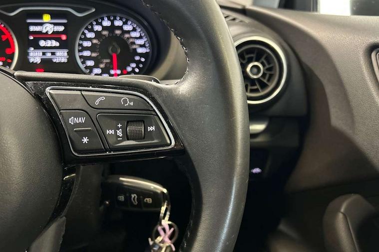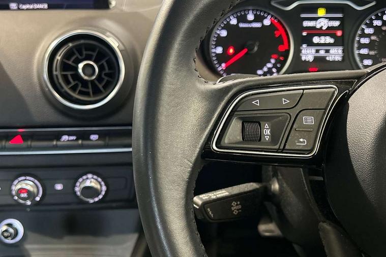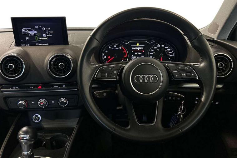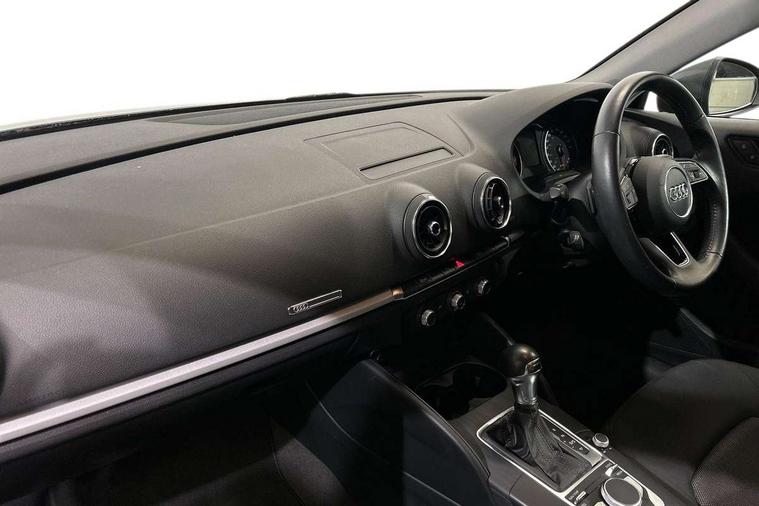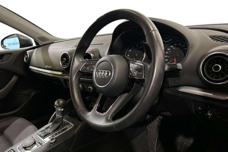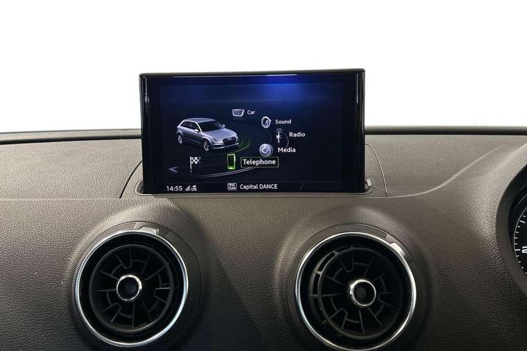 Audi connect, Audi smartphone interface, Colour driver's information system display, Electro-mechanical PAS, HDD satellite navigation system radio single CD/DVD player MMI control system, Mobile telephone preparation - bluetooth interface, Service interval indicator, Speed limit display, Voice control system, Dynamic suspension, 2 USB ports, Audi music interface, Auxiliary input socket, CD player, DAB Digital radio, MMI radio plus with 7" colour MMI screen and MMI controller, Auto dimming rear view mirror with light and rain sensors, Body colour bumpers, Body colour door mirrors with integral indicators, Body colour roof spoiler, Electric front windows, Electric operated/heated door mirrors, Electric rear windows, Heated windscreen washer jets, LED daytime running lights, Matt black radiator grille, Rear wiper, Single exhaust tailpipe, Xenon headlights, 3 adjustable rear headrests, 3 spoke leather multifunction sports steering wheel, 4 lashing points to secure luggage, Adjustable front armrest, Front and rear interior lights with delay, Front passenger seat isofix location point, Front/rear floor mats, Height/depth adjustable steering column, Illuminated glovebox, ISOFIX child seat preparation+airbag deactivation, Jack and tool kit, Rock grey headlining, Steering wheel gearshift paddles, Storage compartment in centre console, Storage compartment under front seats, Storage compartments in doors, Non smoking pack - A3, 3 point seatbelts on all seats, ABS/EBD, Active bonnet, Active front headrests, ASR, Curtain airbags, Driver and passenger side airbags, Driver/Front Passenger airbags, Drivers knee airbag, EDL, Electromechanical parking brake, ESC - Electronic Stability Control + traction control, Front passenger airbag deactivation, Manual rear child locks, Multi-Collision braking, Seatbelt warning, Tyre pressure warning, Warning triangle and first aid kit, Anti theft alarm, Anti-theft wheel bolts, Remote control central locking, Thatcham category 1 alarm + immobiliser, Aluminium air vent surrounds, Micrometallic silver inlay, Space saver spare wheel,