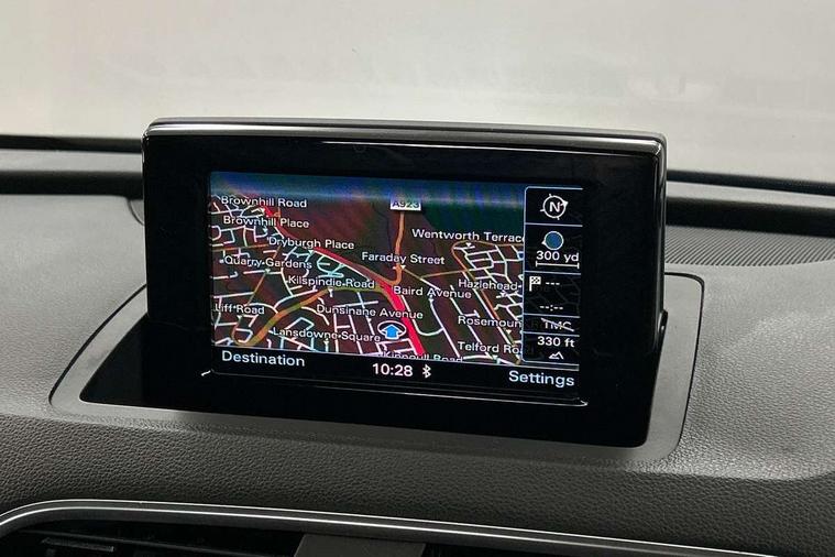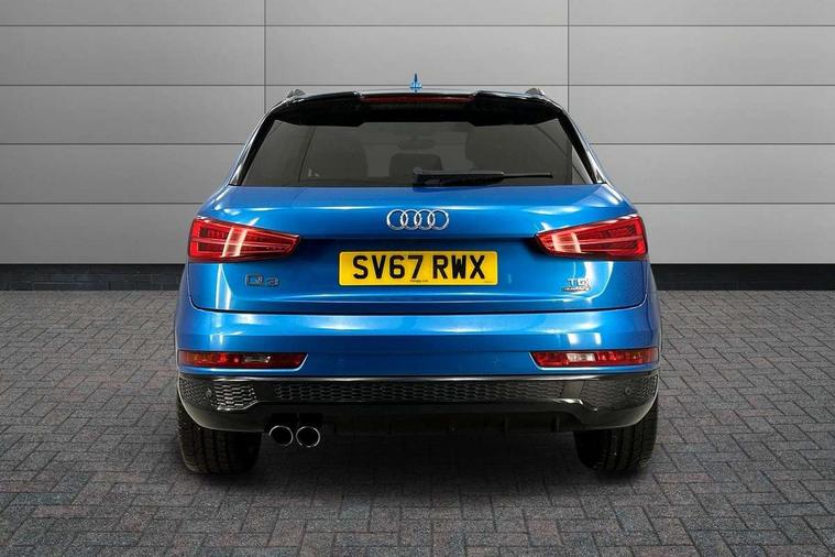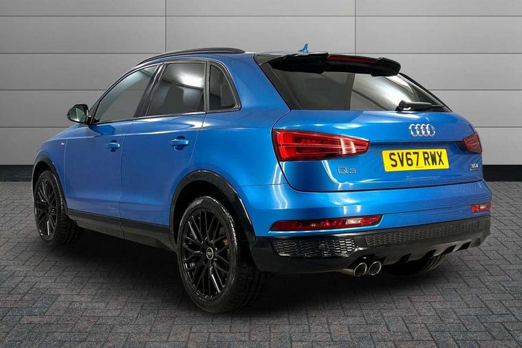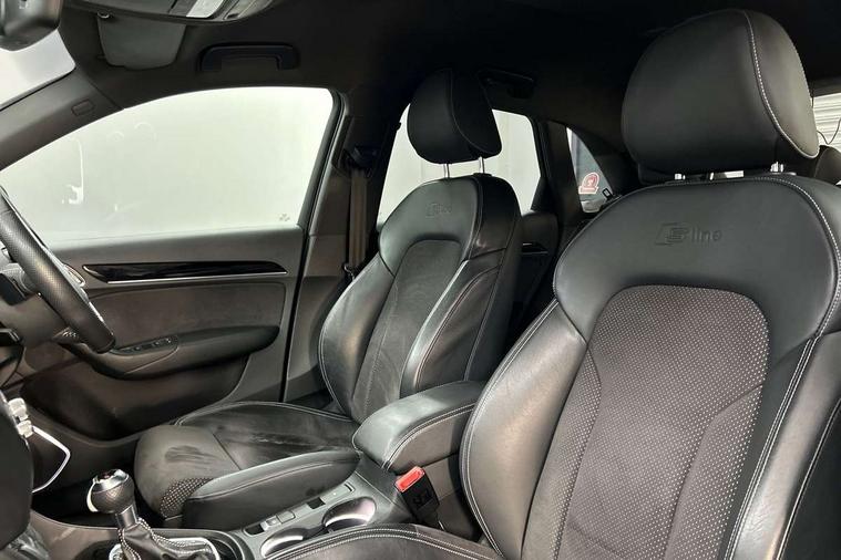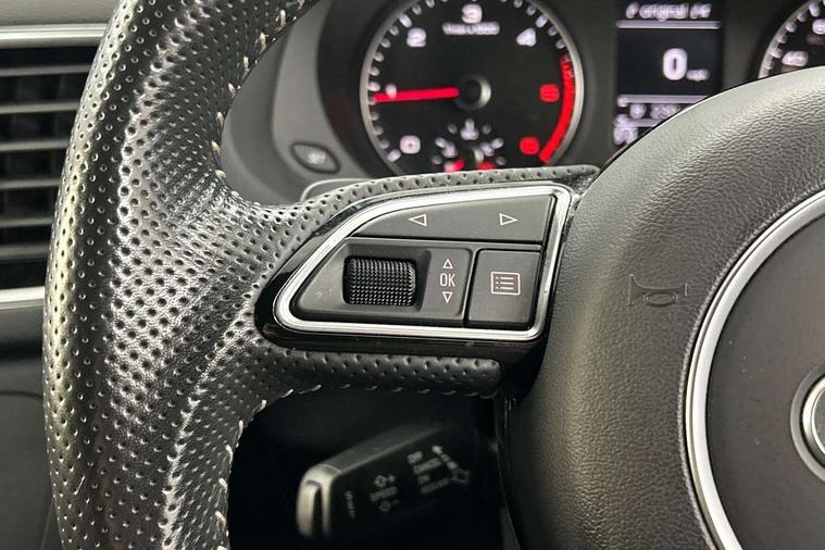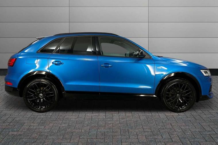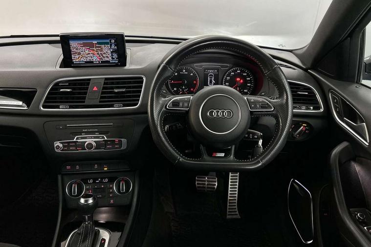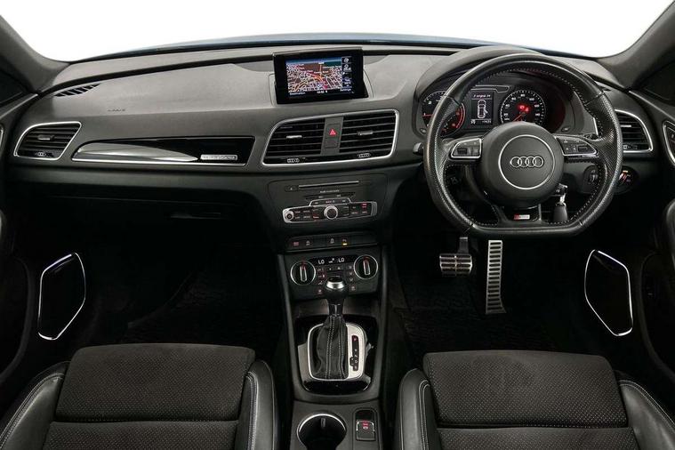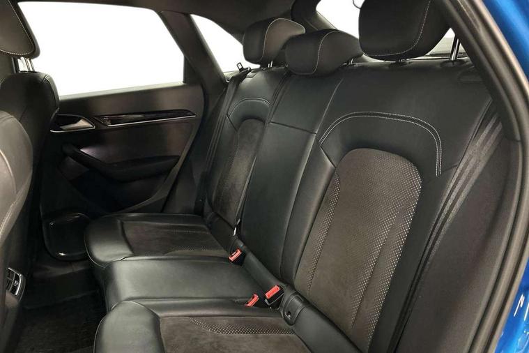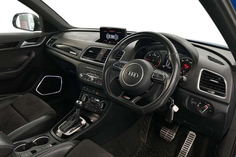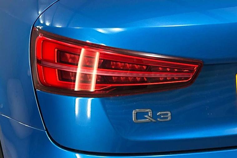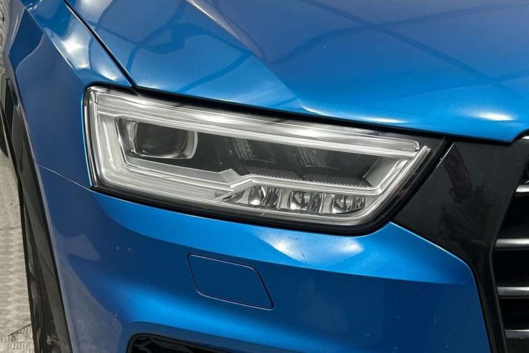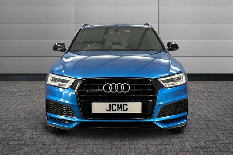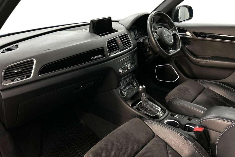 6.5" colour display screen, Audi drive select, Cruise control, Electro-mechanical PAS, Low washer fluid indicator, MMI - Multi Media Interface control system, On board computer, Remote electric boot opening/closing, Service interval indicator, Voice control system, Diesel particulate filter, Sports suspension, Audi music interface, BOSE sound system, DAB digital radio module, Acoustic windscreen, Aluminium window surround, Auto dimming rear view mirror, Black exhaust tailpipes, Black high gloss door mirrors, Black roof rails, Body coloured bumpers, Chrome fog light surround, Chrome grille, Coming home function, Door mirror integrated indicators, Front and rear electric windows, Front lip spoiler, Heated windscreen washer jets, High Gloss Black Contrast Bumpers, High Gloss Black rear spoiler, LED daytime running lights, LED headlights with headlight washers, LED rear lights, Light and rain sensor for auto activation of lights and windscreen wipers, Loading sill protector in stainless steel, Privacy glass, Rear diffuser with platinum insert, Rear wiper, S Line body styling, Sunband for windscreen, 12V socket in rear centre console, 3 spoke flat bottom multi-function perforated leather steering wheel with contrast stitching and aluminium gearshift paddles, Aluminium door sill trims, Aluminium gear knob, Aluminium pedals, Black cloth headlining, Dual zone climate control, Electric front lumbar adjustment, Front and rear headrests, Front and rear velour floor mats, Front centre armrest with storage compartment and angle adjustment, Front sports seats, Height/reach adjust steering wheel, ISOFIX on front passenger and rear outer seats, Jack and tool kit, Retractable luggage cover, Reversible boot floor, Split fold rear seat, Storage compartment and 12V socket, Under floor storage in luggage area, Audi Exclusive black styling pack - Q3, LED interior light pack - Q3, 3x3 point rear seatbelts, ABS+Electronic Brake force Distribution, Curtain airbags, Driver and passenger airbags, Driver and passenger side airbags, EDL + ASR, Electrically operated child locks on rear doors, Electromechanical parking brake, ESP, First aid kit, Front passenger airbag deactivation, Head airbags, Seatbelt warning light, Tyre pressure monitoring system, Warning triangle, Locking wheel bolts, Remote central locking, Thatcham category 1 alarm + immobiliser, Piano black finish inlay, Space saver spare wheel,