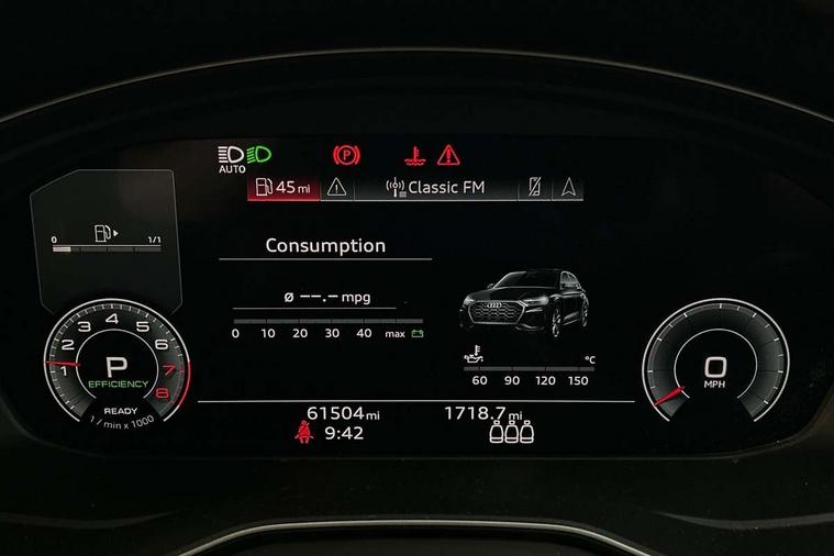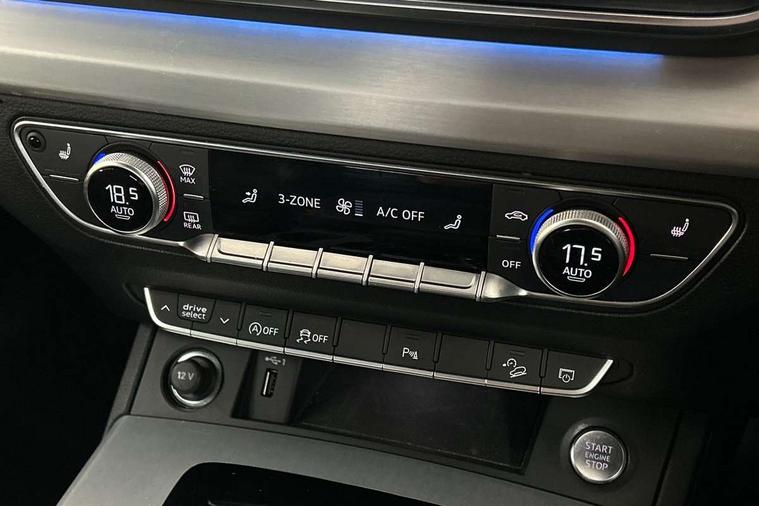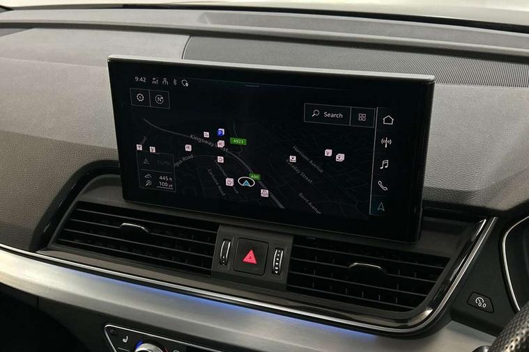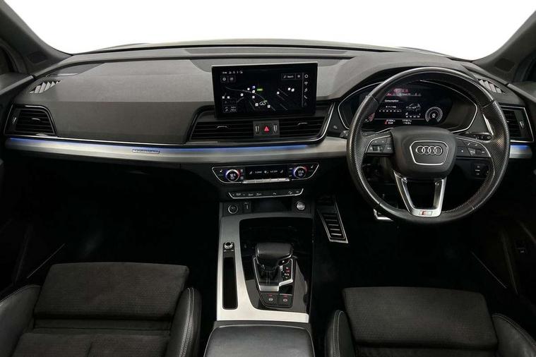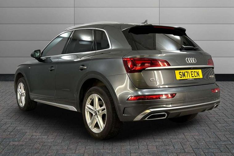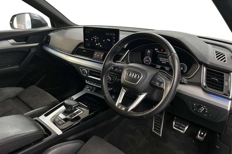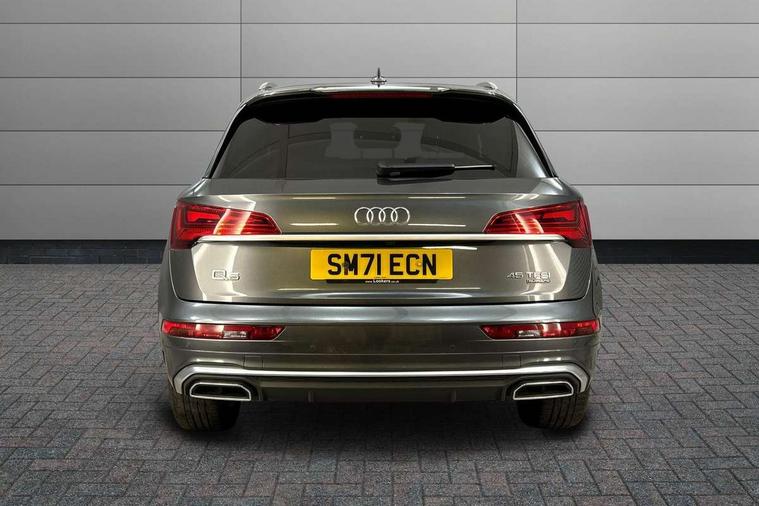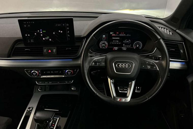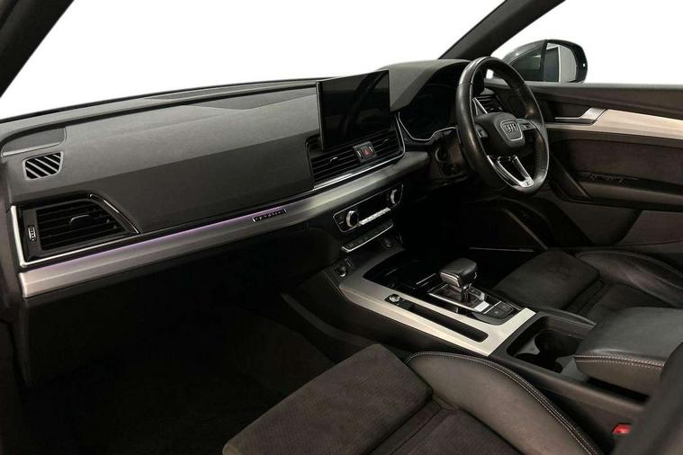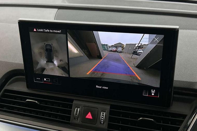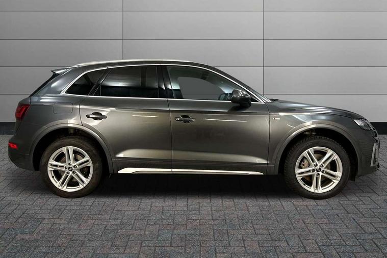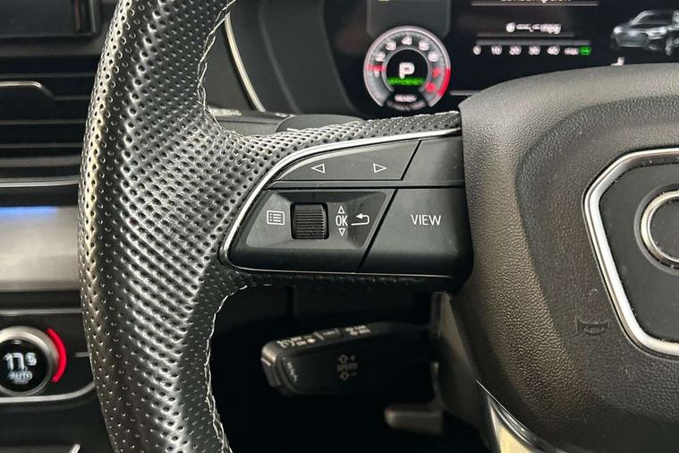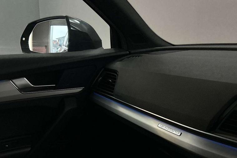 Audi connect safety and service (e-call), Audi connect with Amazon Alexa Integration, Audi drive select, Audi virtual cockpit plus with 12.3" screen and three different layout designs, Audi wireless smartphone interface, Automatic start-stop system with coasting functionality and efficiency programme, Bluetooth interface, Electro - mechanical power assisted steering, MMI navigation plus with 10.1" touch screen, Power tailgate, Reversing camera, Service interval indicator, Voice control system with Audi hotword activation "Hey Audi", Quattro on demand, S line sports suspension, 2 x USB charging port with aux input socket, DAB Digital radio, 3rd brake light, Acoustic windscreen, Aluminium roof rails, Audi matrix LED headlights with dynamic front and rear indicators, Auto dimming rear view mirror, Automatic headlights and windscreen wipers, Body colour bumpers, Body colour door mirrors, Body colour rear diffuser with matt aluminium silver surrounds, Body colour underbody protection, Chrome plated exhaust trims, Daytime running lights, Door sills in Selenite silver, Electric adjustable/heated/folding door mirrors, Front air inlet surrounds in aluminium, Front and rear electric windows, Front radiator grille in honeycomb design, Headlight washers, Lower bumpers painted in contrast Manhattan grey, Rear chrome trim strip below lights, Rear privacy glass and rear side windows, Rear side wing doors, Rear spoiler, Rear wiper, Roof bars, S Line badges on the front wings, S Line front and rear bumpers, S Line side skirts, 3 rear headrests, 40:20:40 split folding 3 rear bench seat in 2nd row with rear centre armrest, Black cloth headlining, Comfort front centre armrest, Contrast stitching on seats, steering wheel and gear lever gaiter, Deluxe 3 zone electronic climate control, Front/rear floor mats, Gear lever in black leather, Heated front seats, Height adjustable front head restraints, Height/reach adjustable steering column, Illuminated door sill trims with S logo, ISOFIX child seat mounting and top tether, Luggage compartment cover, Manual seat adjustment with 4-way electric lumbar support, Removable luggage compartment floor, Single front passenger seat, Stainless steel pedals, Sunvisors with vanity mirrors, High gloss pack - Q5, LED interior light pack - Q5, 3 point seatbelts on all seats, 6 airbags - Driver, front passenger, curtain and side airbags, Electrically operated child locks on rear doors, Electromechanical parking brake, Electronic stabilisation control including ABS, ASR and EDL, Front passenger airbag deactivation, Hill descent control, Hill hold assist, Multi collision brake assist, Pop-up bonnet for pedestrian protection, Pre sense city, Seat belt force limiter, Seatbelt monitoring, Tyre pressure warning, Warning triangle and first aid kit, Anti theft alarm, Anti-theft wheel bolts, Keyless Go access/ignition system, Matt brushed aluminium inlays,