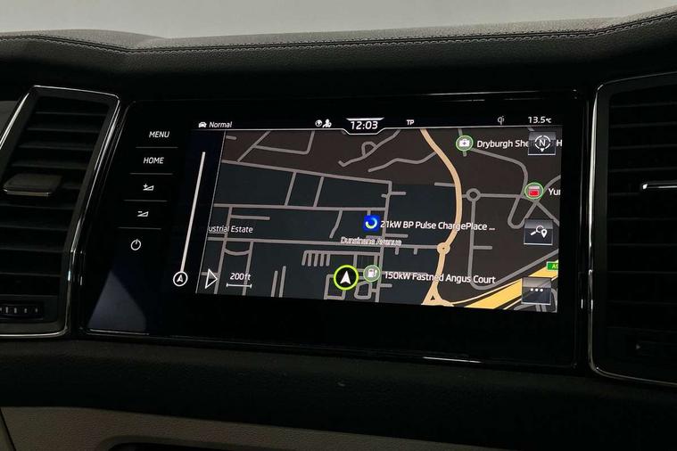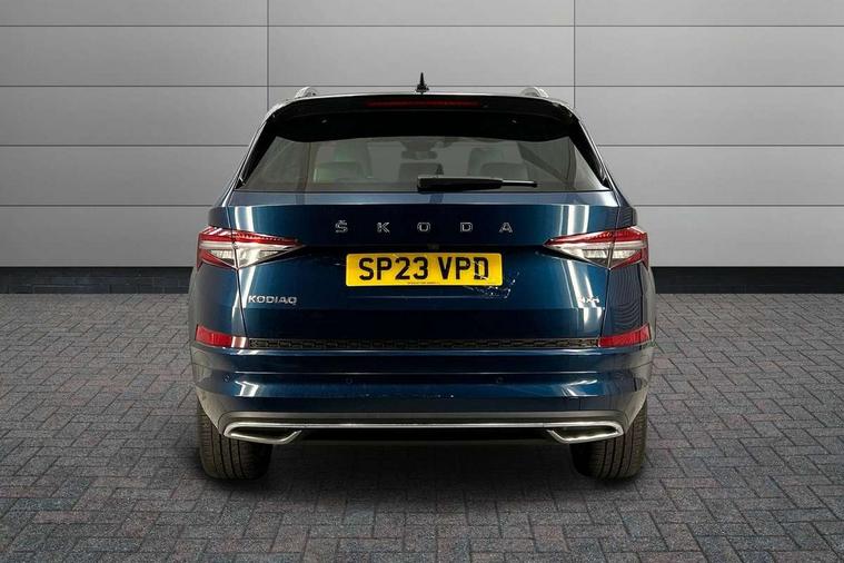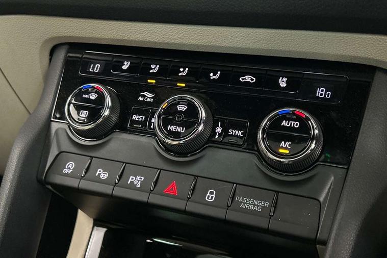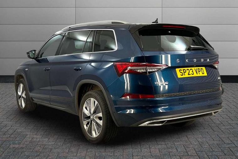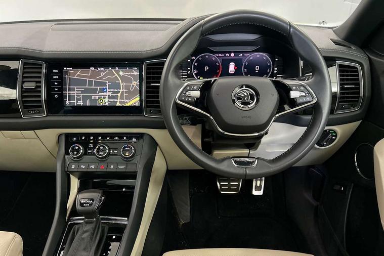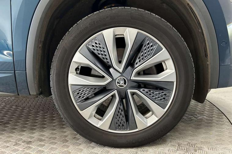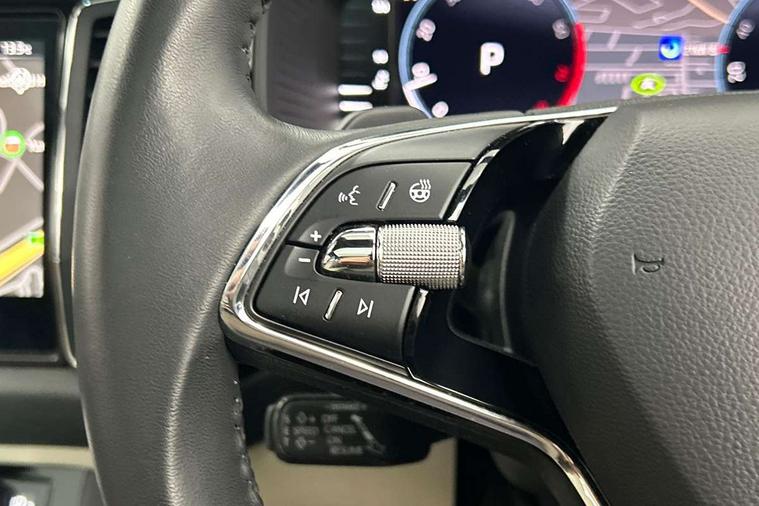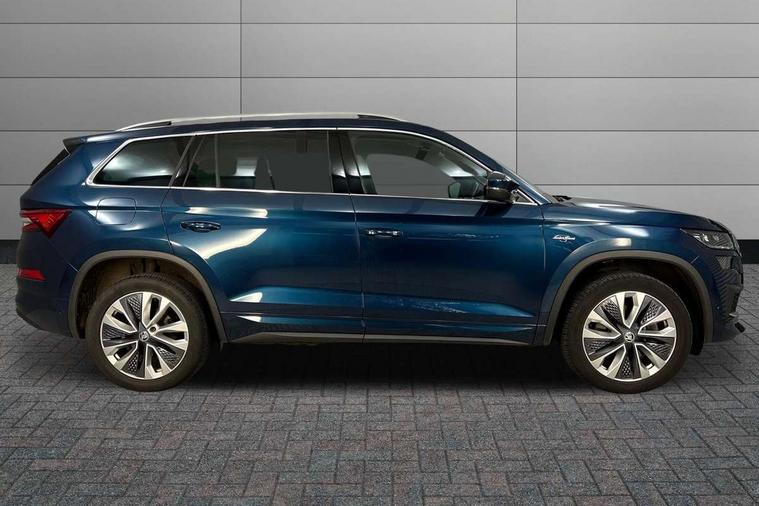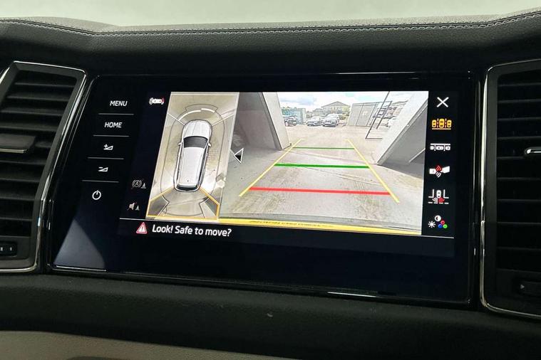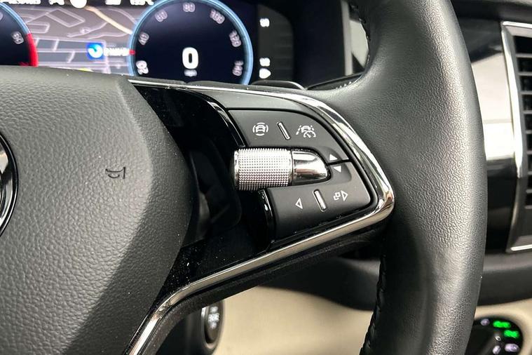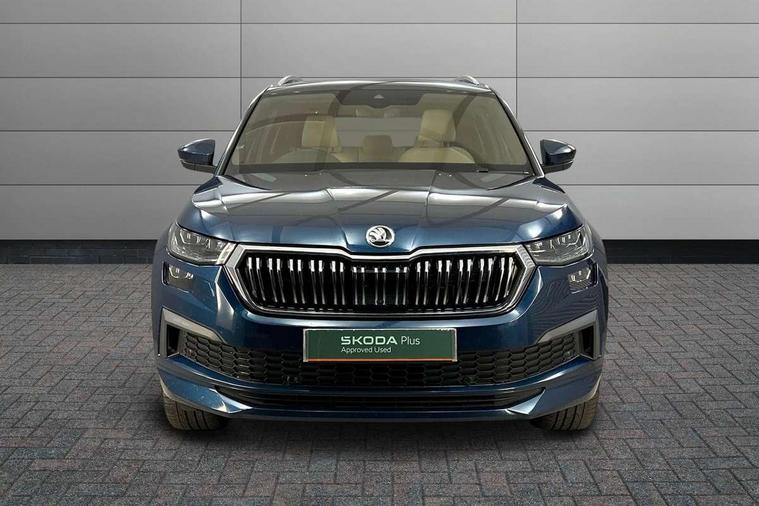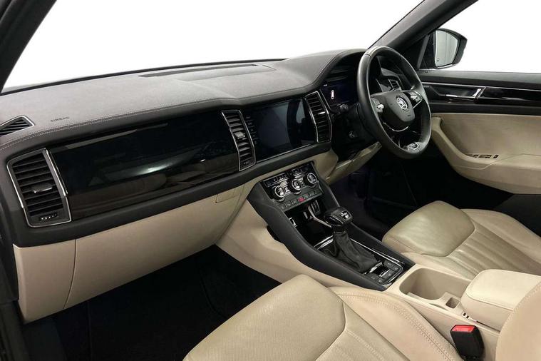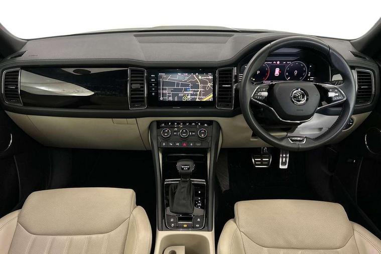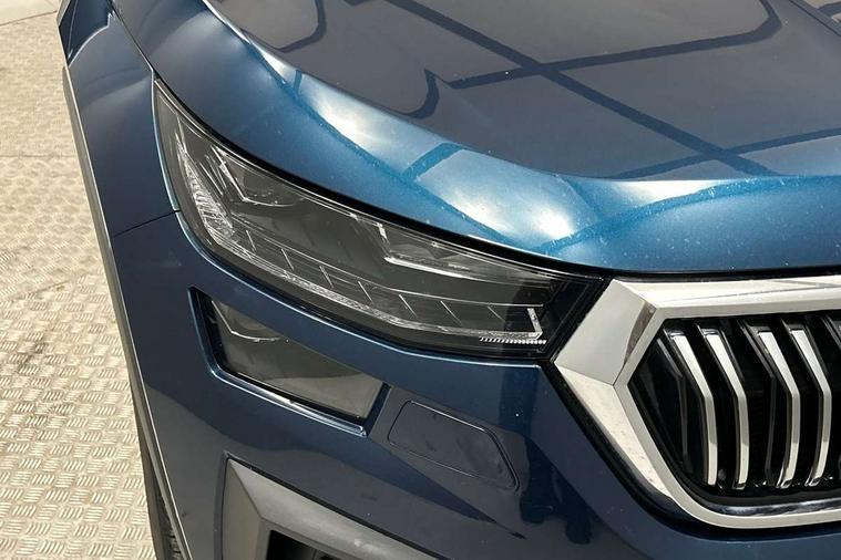 Area view, Blind spot detection system, Bluetooth system, Columbus satellite navigation with 9.2" touchscreen, integrated Wi-Fi, web radio, Digital voice enhancement, e call+, ECO Stop/start function, Exterior temperature indicator, Progressive steering, Smartlink wireless for apple carplay and wired for android auto, Speed limiter, Tailgate unlocking from outside, USB C Port x 2 in front centre console, Virtual Cockpit - 10.25" digital display, Wireless charging, Canton sound system, DAB Digital radio, Aero front windscreen wipers with intermittent function, Aero rear window wiper, Auto dimming rear view mirror, Black wheel arch surrounds, Body colour bumpers, Body colour door mirrors and handles, Body colour door panels, Chrome front grille, Chrome roof rails with chrome window surround, Electric adjustable/heated/folding door mirrors, driver side auto dimming with boarding sports and memory function, Electric front and rear windows, Extended rear spoiler with finlets in gloss black, Front fog lights, Full LED matrix headlights with AFS (adaptive front light system), cornering function and AWL (all weather lighting system), Headlight washers, Heated rear window, Invisible tailpipe, L&K front and rear bumpers including lower rear chrome strip, LED daytime running lights, LED rear fog light, LED third brake light in rear spoiler, Light assistant (coming/leaving home/tunnel light), Off-road style lower front bumper element, Panoramic sunroof, Privacy glass, Rain and light sensors, Rear LED lights (high functionality) with welcome effect and dynamic indicators, Rear side wing doors, Safety reflectors on front and rear doors, Window control switches with black trim, Without engine designation, 12V socket in boot, 2 rails with 2 hooks, 2 seat bench in 3rd row, 3 seat bench in 2nd row, 4 foldable roof handles with rear coat hooks, 60:40 foldable rear seat with sliding adjustment and backrest angle adjustment, Aluminium pedals, Bottle holders in door panel in the 1.5 litre front and 1 litre rear, Cargo storage compartments, Chrome headlight control button, Chrome interior door handles, Coat hooks on B pillar, Covered storage compartment on driver side, Decorative door sill covers, Front centre armrest with storage compartment, cup holder and 12V socket, Front courtesy lights, Gear shift lever with chrome frame and black gloss insert, Grey stitching in front and rear armrests and door armrests + door inserts, Height adjustable front headrests, Illuminated and cooled glovebox, Illuminated luggage compartment, Isofix child seat fittings in outer rear seats with top tether, Manually adjustable steering column, Net programme in boot (1x horizontal Net, 2x vertical Nets), Overhead glasses storage compartment, Pollen filter, Rear centre armrest with cupholders, Single front passenger seat, Sliding trunk cover, Small Bags on the inner sides of the front backrests, Sunvisors with illuminated vanity mirrors, Three rear height adjustable headrests, Ticket holder on A Pillar, Umbrella in door panel, Variable boot floor, LED Interior light pack - Kodiaq, Auto door release and activation of warning lights in the event of an accident, Child locks on rear doors, Driver and front passenger airbag with knee airbag and front passenger airbag deactivation, Electronic parking brake with hill start assist, Emergency rear braking signal, ESC (incl. ABS+MSR+ASR+EDS+HBA+DSR+RBS+MKB), Front assist with autonomous emergency braking, Front side airbags with curtain airbags, Fuel cut off safety device, Height adjustable front 3 point seatbelts + pretensioners, Hill hold control, Rear disc brakes, Safety vest holder in door, Seat belt reminder for all seats, Three point rear seat belts, Two tone horn, Tyre pressure monitor, Alarm with interior monitoring and tilt sensor with safe function, Anti-theft wheel bolts, Immobiliser, Keyless entry and start system (KESSY), Remote central locking with 2 keys, Grey stitching in dashboard, Piano black decorative inserts, Plaquette L&K front fenders, Temporary spare wheel (space saver),