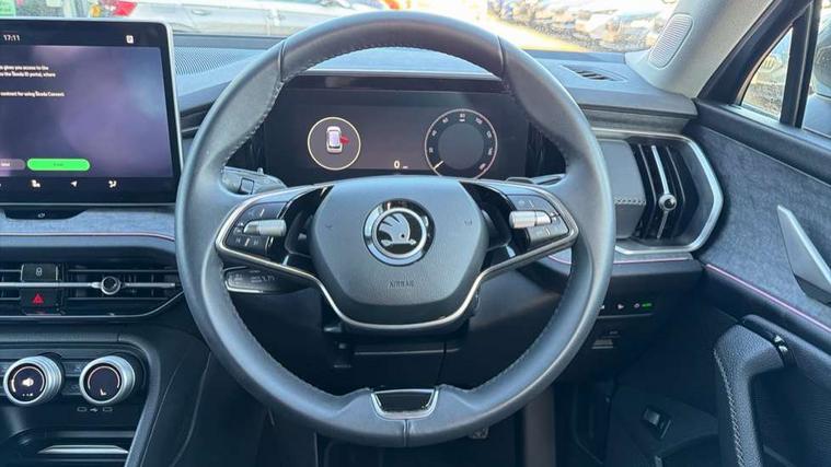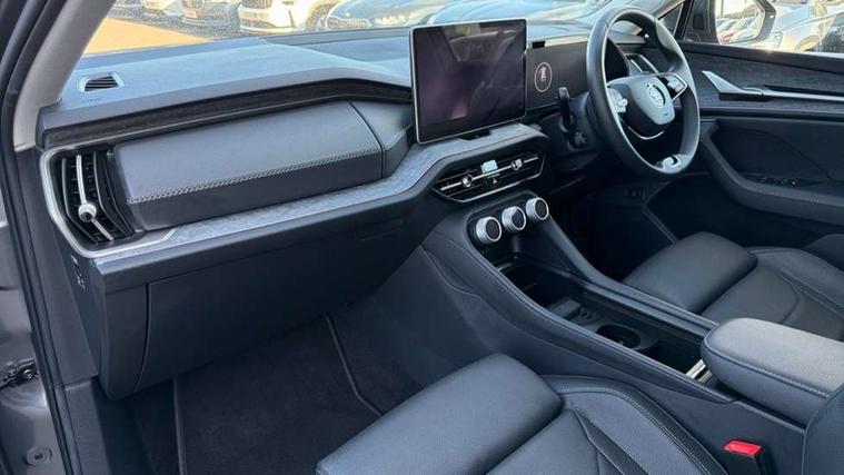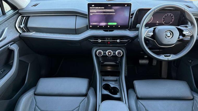 13" satellite navigation touchscreen display, Blind spot detection with door exit warning, Bluetooth system, ChatGPT functionality, Drive mode selector, Driver alert with fatigue sensor, Driver drowsiness alert system, Dry display cleaner, e call+, Front cross traffic assist, Lane assist, PAS, Rear traffic assist, Tailgate unlocking from outside, Traffic sign recognition, USB C Port x 2 in front centre console, Virtual Cockpit - 10.25" digital display, Voice control system, Wireless charging for two smartphones (15W) with cooling function, Wireless SmartLink for Apple CarPlay and Android Auto, Stop/start function, 2x USB-C in the rear, DAB Digital radio, Aero front windscreen wipers with intermittent function, Auto dimming rear view mirror, AWL (all weather lighting) and all weather light with cornering function, Black wheel arch surrounds, Body colour bumpers, Body colour door mirrors and handles, Cornering light and poor weather light, Electric folding /adjustable/separted heated/folding door mirrors, auto dimming with boarding sports and memory function, Electric front and rear windows, Exterior black decorative trims, Heat insulating glass in windshield, Heated rear window, Ice scraper in fuel tank cap, Invisible tailpipe, LED daytime running lights, LED rear fog light, LED third brake light in rear spoiler, Light assistant with automatic headlight control and coming home feature, Logo projection in door mirrors, Privacy glass, Rear side wing doors, Rear spoiler, Rear window wiper, Red decorative strip between rear LED lights, Safety reflectors on front and rear doors, Window control switches with black trim, Windscreen wipers with rain sensor, Without engine designation, 1.5l bottle holder points in all door, 12V socket in boot, 1x centre rear reading light, 2 seat bench in 3rd row, 3 configurable smart dials with 32mm coloured display, 3 seat bench in 2nd row, 4 foldable roof handles with rear coat hooks, Ambient interior lighting - Dashboard, front-door stowage compartments, front and rear door panels and footwell lighting, Automatic gear selector on steering wheel, Chrome interior door handles, Driver/front passenger reading lights, Fabric headlining, Fixed bench 40:60:40 split folding backrests, Front and rear floor mats, Front centre armrest with jumbo box storage compartment, cup holder and 12V socket, Front courtesy lights, Height adjustable front headrests, Isofix child seat fittings in outer middle row rear seats and front passenger with top tether, Manually adjustable steering column, Pollen filter, Rear centre armrest with cupholders, Rear seat boot backrest release, Retractable luggage compartment cover, Single front passenger seat, Sliding trunk cover, Small Bags on the inner sides of the front backrests, Storage pocket including mobile phone pockets on the backs of the front seats, Sunvisors with illuminated vanity mirrors, Three rear height adjustable headrests, Ticket holder on A Pillar, Tri zone climate control, Umbrella in door panel x1 made from sustainable materials, Upper and lower glovebox with card holder and coin compartment, USB C port by rear view mirror for charging only (15W), Exterior styling pack - Kodiaq, Auto door release and activation of warning lights in the event of an accident, Driver and front passenger airbag with knee airbag and front passenger airbag deactivation, Electric child locks, Electronic parking brake, ESC (incl. ABS+EMD+MSR+ASR+EDL+HBA+DSR+RBS+ESBS+MCB+TSA+XDS), Front assist with braking reaction to vehicles, pedestrians and cyclists, Front disc brakes, Fuel cut off safety device, Height adjustable front 3 point seatbelts + pretensioners, Hill hold control, Junction assist with automatic emergency braking, Rear disc brakes, Safety vest holder in door, Seat belt reminder for all seats, Three point rear seat belts, Two tone horn, Tyre pressure monitor, Anti-theft wheel bolts, Immobiliser, Remote central locking with 2 keys, Breakdown kit,