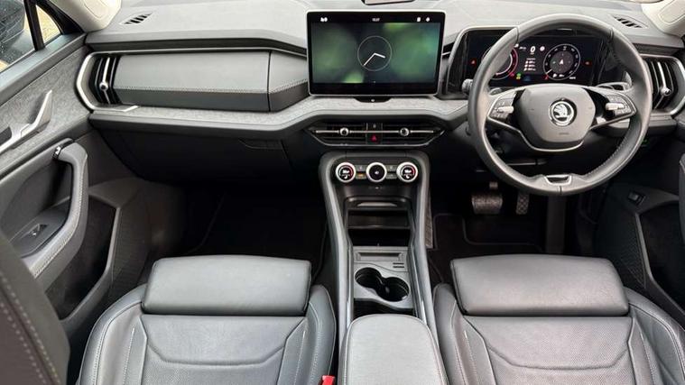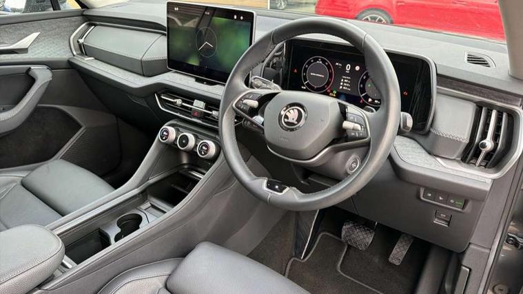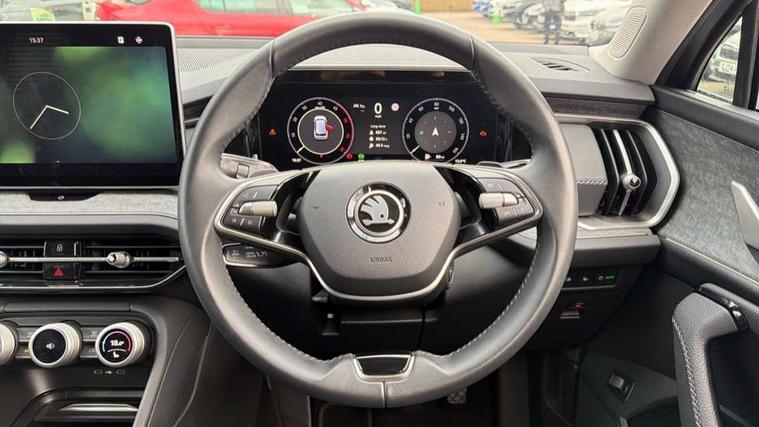 13" satellite navigation touchscreen display, Blind spot detection with door exit warning, Bluetooth system, ChatGPT functionality, Drive mode selector, Driver alert with fatigue sensor, Driver drowsiness alert system, Dry display cleaner, e call+, Front cross traffic assist, Lane assist, PAS, Rear traffic assist, Tailgate unlocking from outside, Traffic sign recognition, USB C Port x 2 in front centre console, Virtual Cockpit - 10.25" digital display, Voice control system, Wireless charging for two smartphones (15W) with cooling function, Wireless SmartLink for Apple CarPlay and Android Auto, Stop/start function, 2x USB-C in the rear, DAB Digital radio, Aero front windscreen wipers with intermittent function, Auto dimming rear view mirror, AWL (all weather lighting) and all weather light with cornering function, Black wheel arch surrounds, Body colour bumpers, Body colour door mirrors and handles, Cornering light and poor weather light, Electric folding /adjustable/separted heated/folding door mirrors, auto dimming with boarding sports and memory function, Electric front and rear windows, Exterior black decorative trims, Heat insulating glass in windshield, Heated rear window, Ice scraper in fuel tank cap, Invisible tailpipe, LED daytime running lights, LED rear fog light, LED third brake light in rear spoiler, Light assistant with automatic headlight control and coming home feature, Logo projection in door mirrors, Privacy glass, Rear side wing doors, Rear spoiler, Rear window wiper, Red decorative strip between rear LED lights, Safety reflectors on front and rear doors, Window control switches with black trim, Windscreen wipers with rain sensor, Without engine designation, 1.5l bottle holder points in all door, 12V socket in boot, 1x centre rear reading light, 2 seat bench in 3rd row, 3 configurable smart dials with 32mm coloured display, 3 seat bench in 2nd row, 4 foldable roof handles with rear coat hooks, Ambient interior lighting - Dashboard, front-door stowage compartments, front and rear door panels and footwell lighting, Automatic gear selector on steering wheel, Chrome interior door handles, Driver/front passenger reading lights, Fabric headlining, Fixed bench 40:60:40 split folding backrests, Front and rear floor mats, Front centre armrest with jumbo box storage compartment, cup holder and 12V socket, Front courtesy lights, Height adjustable front headrests, Isofix child seat fittings in outer middle row rear seats and front passenger with top tether, Manually adjustable steering column, Pollen filter, Rear centre armrest with cupholders, Rear seat boot backrest release, Retractable luggage compartment cover, Single front passenger seat, Sliding trunk cover, Small Bags on the inner sides of the front backrests, Storage pocket including mobile phone pockets on the backs of the front seats, Sunvisors with illuminated vanity mirrors, Three rear height adjustable headrests, Ticket holder on A Pillar, Tri zone climate control, Umbrella in door panel x1 made from sustainable materials, Upper and lower glovebox with card holder and coin compartment, USB C port by rear view mirror for charging only (15W), Exterior styling pack - Kodiaq, Auto door release and activation of warning lights in the event of an accident, Driver and front passenger airbag with knee airbag and front passenger airbag deactivation, Electric child locks, Electronic parking brake, ESC (incl. ABS+EMD+MSR+ASR+EDL+HBA+DSR+RBS+ESBS+MCB+TSA+XDS), Front assist with braking reaction to vehicles, pedestrians and cyclists, Front disc brakes, Fuel cut off safety device, Height adjustable front 3 point seatbelts + pretensioners, Hill hold control, Junction assist with automatic emergency braking, Rear disc brakes, Safety vest holder in door, Seat belt reminder for all seats, Three point rear seat belts, Two tone horn, Tyre pressure monitor, Anti-theft wheel bolts, Immobiliser, Remote central locking with 2 keys, Breakdown kit,