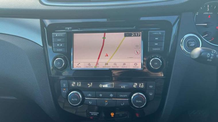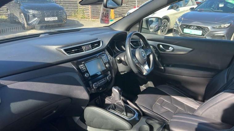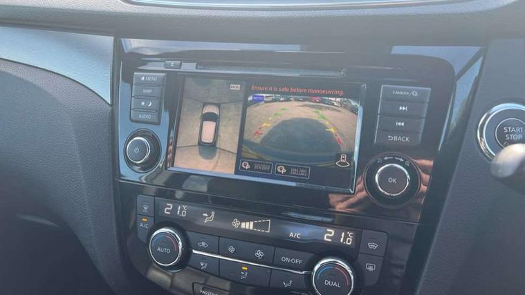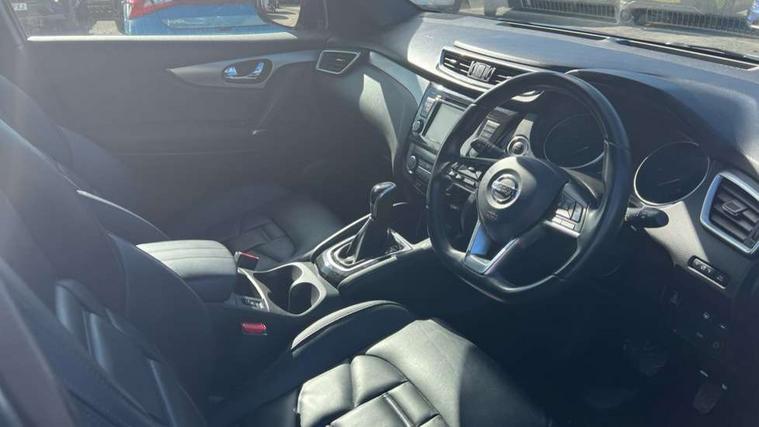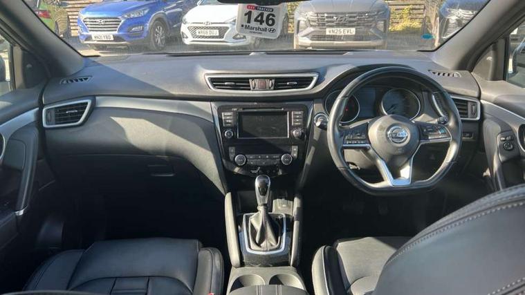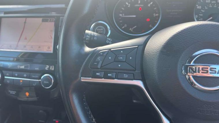 Advanced drive assist display 5'' TFT coloured screen, Android Auto, Apple CarPlay preparation, Bluetooth connectivity, Electric speed sensitive power steering, Front parking sensors, Intelligent around view monitor, Intelligent parking assist, Lane departure warning system, Nissan connect evo 7" touchscreen navigation and entertainment system, Normal or sport selectable steering, Outside temperature sensor, Push button starter, Rear parking sensors, Rear view camera, Service interval indicator, Smartphone integration, Stop/start system, Tomtom connected services, Traffic sign recognition, Trip computer, Voice control system, Diesel particulate filter, Nissan chassis control (intelligent ride control, intelligent trace control, intelligent engine brake), AM/FM radio, CD audio system, Aux-in socket, Bose premium 8 speaker system, DAB Digital radio, Rear USB connection, Steering wheel mounted audio controls, USB port, Anti dazzle rear view mirror, Auto wipers, Body coloured door handles, Chrome window surround, Daytime running lights dip function when turn signal applied, Electric folding door mirrors, Electric front and rear windows with one touch illuminated window controls, Electric front/rear windows, Electrically adjustable door mirrors, Front fog lights, Front/rear full painted bumper/side silver finisher, Gloss silver door mirror caps, Halogen headlights, Heated door mirrors, High beam assist, Intelligent auto headlights, LED indicators in door mirrors, Matt silver roof rails, One touch 4x auto windows with illuminated switches, Panoramic sunroof with one touch shade, Privacy glass, Rear roof spoiler, Rear wiper with reverse link, Shark fin antenna, Underbody vortex generators, 2 X front 12v power sockets, 3 height adjustable rear headrests, 60/40 split folding rear seat, Ambient lighting, Ambient lighting in centre console, Boot lighting, Centre console storage box/armrest, Chrome interior door handles, Configurable luggage board system, Dark headlining, Dual zone climate control, Electric 4-way lumbar support for drivers seat, Electrically adjustable driver seat, Electrically adjustable passenger seat, Front and rear door pockets with bottle holders, Front and rear seat belt pre-tensioners with load limiters, Height adjustable front headrests, Individual rear seat reading lights, ISOFIX restraints on outer rear seats x2, Leather D shaped steering wheel, Leather gear lever, Leather knee pad, Manual lumbar support on passenger seat, Map reading lamp, Memory for drivers seat/door mirrors, Monoform front seats with plastic backboard, One touch electric shade, Parcel shelf stow function under luggage board, Pollen filter, Rear armrest with 2 cupholders, Synthetic leather wrapped door handle with contrasting stitching, Tilt/telescopic adjustable steering wheel, Heat package - Qashqai, ProPilot pack - Qashqai, Safety shield plus pack - Qashqai, 6 airbags - Driver, front passenger, curtain and side airbags, ABS, ESP, EBD and brake assist, Auto hold function, Child locks on rear doors, Electronic parking brake, Front and rear seat belt warning, Front passenger airbag deactivation, Height adjustable front seatbelts, Hill start assist, Intelligent emergency braking with pedestrian recognition, Three 3 point rear seatbelts, Tyre pressure monitoring system, Anti-theft immobiliser, Intelligent Key, Remote central locking, Thatcham Cat.1 alarm, Carbon graphite dash trim, Tyre puncture repair kit,