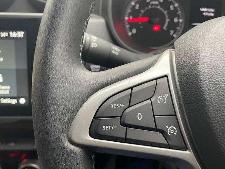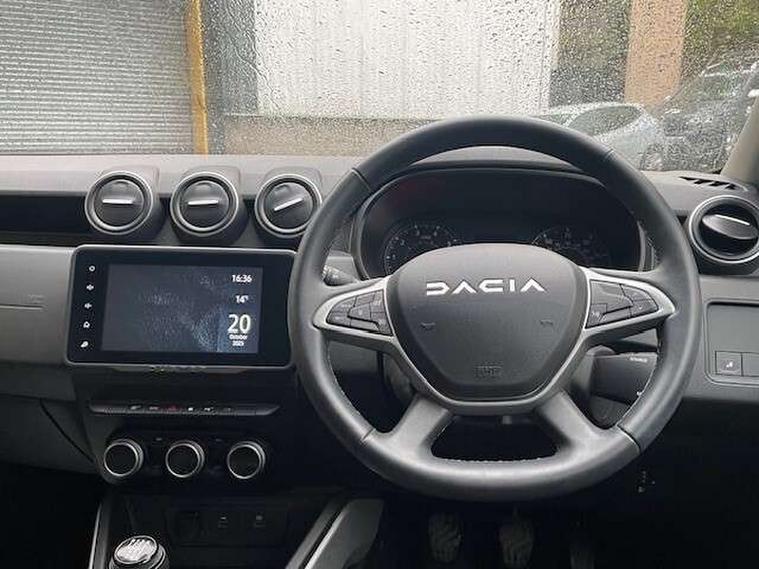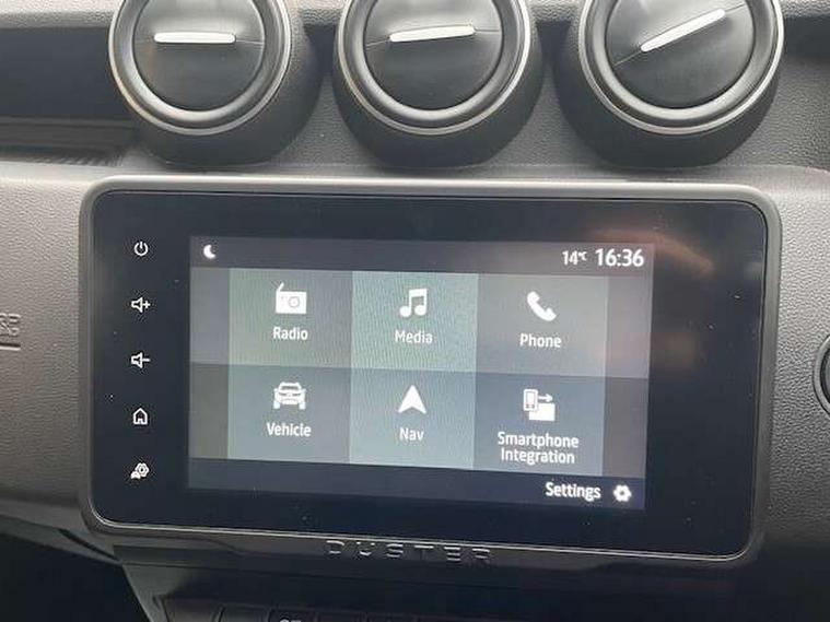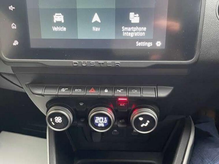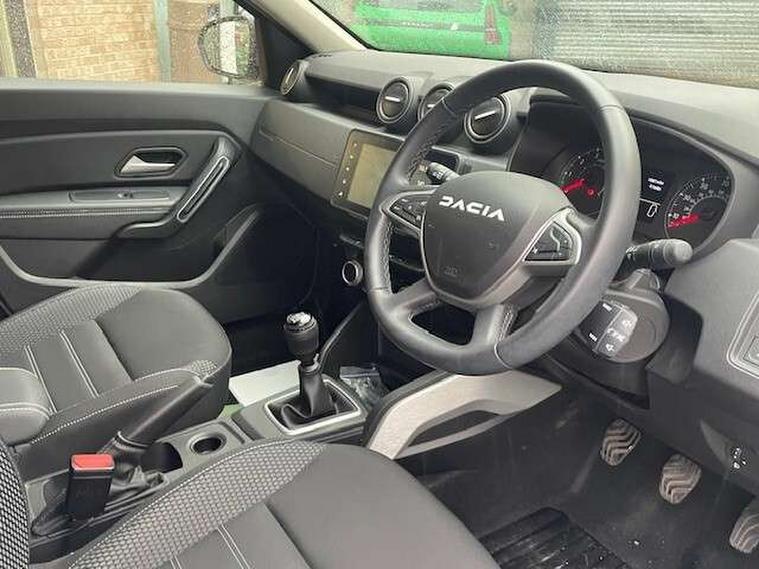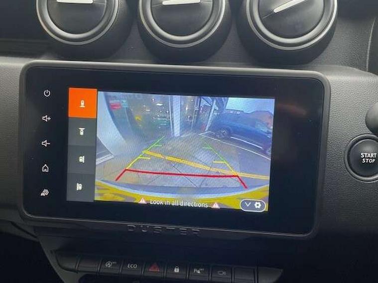 Blind spot warning, Cruise control and speed limiter, eCall emergency system, Eco mode, Electric power assisted steering, Multi view camera, On board computer, odometer, trip computer, average fuel consumption, average speed, service indicator, outside temperature gauge, Rear parking sensors, Rev counter, Reversing camera, Stop/start system, 8" Media Navigation with wireless smartphone replication, Dacia plug and radio/MP3/USB/bluetooth/DAB/steering wheel control, 3 speed windscreen wipers, Acoustic windshield, Automatic front wipers, Black side sills, Black/satin chrome tailgate trim with Duster inscription in black background and lettering, Body coloured door handles, Chrome front grille with hot stamping, Chrome logo surround on steering wheel, Dark glass on lateral rear windows, Daytime running lights, Drivers window one touch up/down, Dusk sensor, Electric adjustable/heated door mirrors, Electric folding door mirrors, Electric front windows, Electric rear windows, Front and rear body coloured bumpers, Front door sill protection strip, Front fog lights, Grey quartz longitudinal roof bars with Duster inscription, Heated rear window, High level third rear brake light, Modular roof bars, Rain sensor, Rear side wing doors, Rear spoiler, Rear wash/wipe, Satin chrome door mirrors, Underbody protection skid plates, Y shaped LED headlights with rear LED lights, 3 rear height adjustable headrests, 3 seat bench in 2nd row, 60/40 split folding rear seat, Automatic air conditioning, Backlighted steering wheel buttons, Boot light, Driver seat lumbar adjustment, Fabric decorative insert on door panels, Fabric upholstery, Front head restraints, Front passenger reading light, Gear shift indicator, Glovebox light, Heated seats, Height adjustable driver seat, Height adjustable front and rear headrests, Height and depth adjustable steering wheel, High centre console with driver armrest, Isofix points for child seats in both outer rear seats, Map pocket on front seat backs, Passenger sunvisor with vanity mirror, Rear passenger reading light, Satin chrome gear lever cap insert, Satin chrome interior door handles, Satin chrome lower steering wheel insert, Single front passenger seat, Soft feel leather steering wheel, 3x3 point rear seatbelts, ABS and Emergency brake assist, ASR traction control with Electronic stability control, Child locks on rear doors, Door open visual and audible warning, Driver airbag, Driver and passenger seatbelt not fastened - visual and audible warning, EBD - Electronic brakeforce distribution, Front passenger airbag, Front passenger airbag deactivation, Front seatbelt pretensioners, Front side airbags, Height adjustable front seatbelts, Hill start assist, Tyre pressure monitor, Keyless entry, Remote central locking, Thatcham approved engine immobiliser, Charcoal grey central console surround, Matt black central console fascia, Matt black decorative insert on rear door panels, Piano black decorative insert on front door panels, Satin chrome air vent surround, Satin chrome instrument dial surrounds, 17" Alloy wheels,