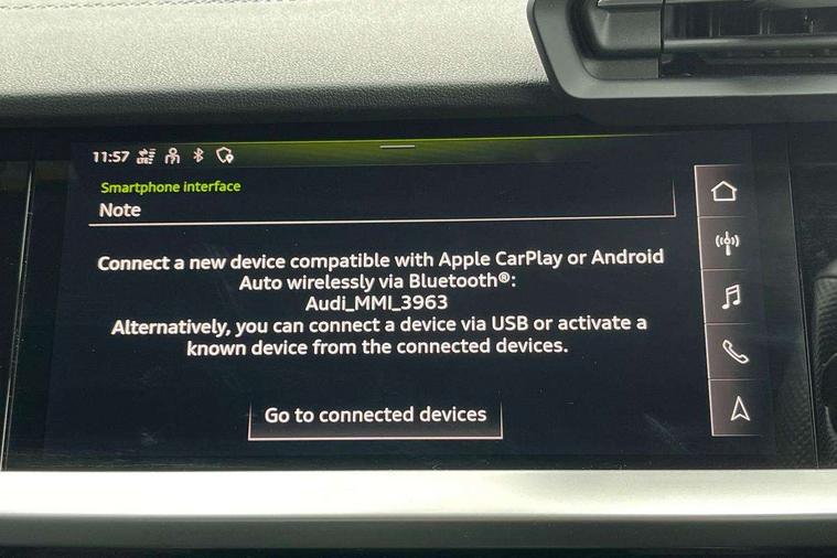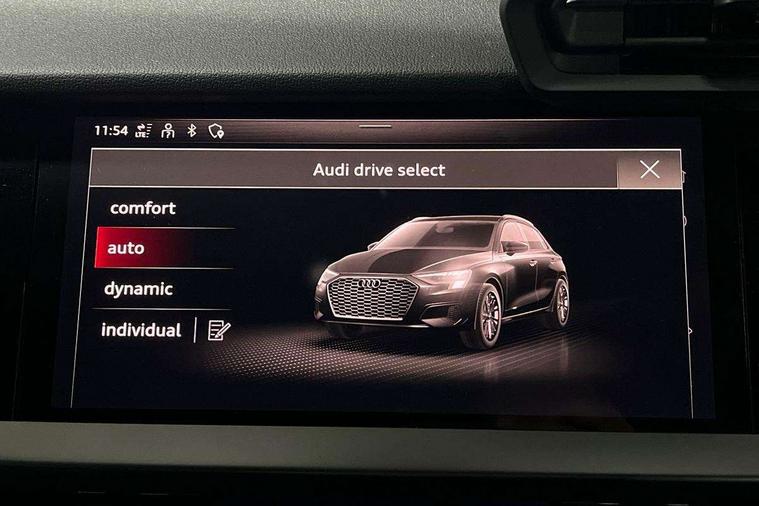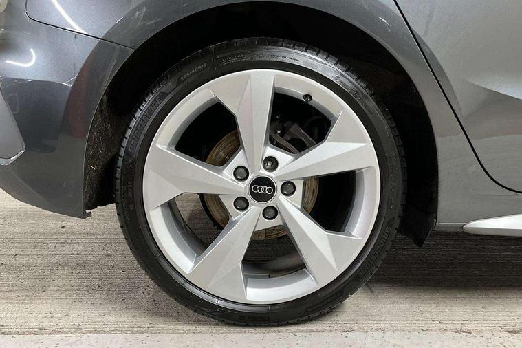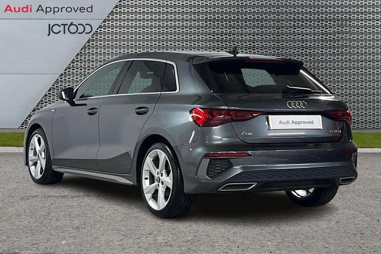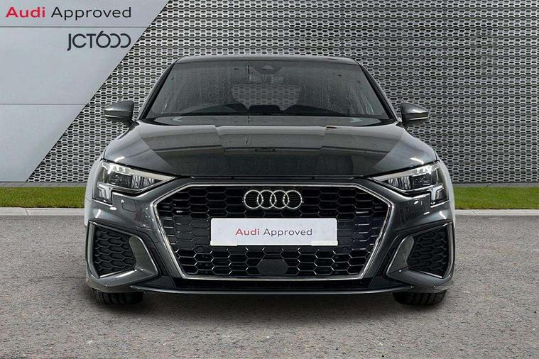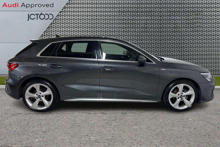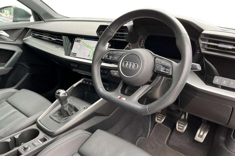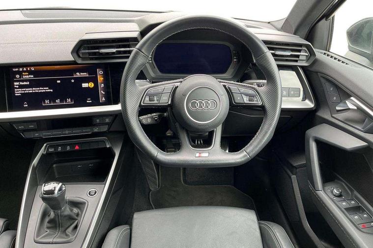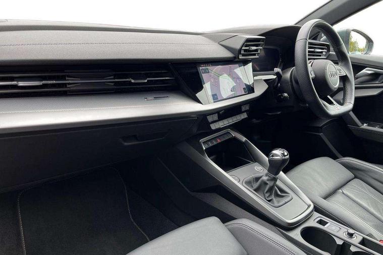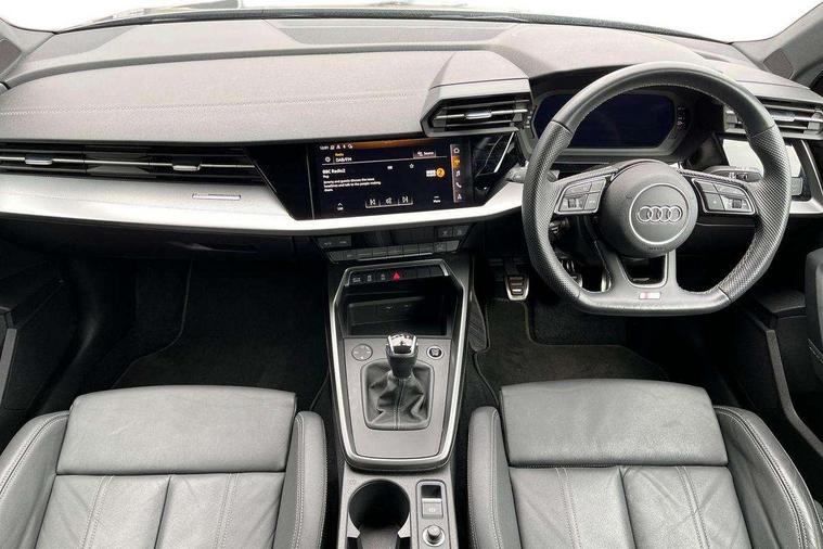 Audi drive select (Auto, Comfort, Dynamic and Individual), Audi smartphone interface, Audi Virtual Cockpit - 10.25" digital and colour instrument cluster, Automatic start/stop system with recuperation, Bluetooth interface, Collision avoidance assistant, Cruise control, e-Call (emergency call), Electromechanical power speed sensitive steering, Lane departure warning system, MMI Navigation Plus with high resolution 10.1" colour touch screen display, Rear parking sensors, Service indicator, Trip computer, Voice control system with natural language interaction, 2xUSB-C connection with data and charging functions, 6 passive loudspeakers, DAB Digital radio, 3rd brake light, Acoustic glass windscreen, Aluminium window trim, Auto dimming frameless rear view mirror, Electrically adjustable/heated/folding/auto dimming door mirrors with integrated LED indications + kerb view function for passenger side, Front electric windows, Illuminated aluminium inserts front door sills with S logo, LED daytime running lights, LED headlights with LED rear lights and dynamic rear indicators, Light and rain sensors, Privacy glass - dark tinted rear window, rear door and side windows, Rear electric windows, Rear side air outlets in grained matt black, Rear side wing doors, Rear wiper, S line bumpers, S roof spoiler, 12V socket and storage compartment in front centre console, 3 seat bench in 2nd row, 40/20/40 split folding rear seat bench with cupholder, Black cloth headlining, Dual zone electronic climate control, Front and rear centre armrest in leather, Front and rear headrests, Front/rear floor mats, Height and reach adjustable steering wheel, Illuminated vanity mirror, Interior lighting - glove compartment light and right hand side, Luggage compartment floor covering, Manual boot compartment lid, Manually adjustable front seats, Seat side bolsters, Single front passenger seat, Stainless steel pedals and front footrest in black, Twin leather upholstery with front sports seats S embossed logo, Aluminium interior elements pack - A3 Sportback, S line styling pack - A3 Sportback, 3x3 point rear seat belts, Audi pre sense front, Driver and front passenger airbag with passenger airbag deactivation, Electronic Stabilisation Control (ESC) including ABS, ASR and EDL, First aid kit with warning triangle and 2 safety vests, Front side airbags with head airbags and interaction airbag, Pre-sense front with pedestrian and cyclist detection, Seatbelt monitoring, Tyre pressure loss indicator, Anti theft alarm, Anti-theft wheel bolts, Immobiliser, Manual child locks, Remote control central locking, Accent surfaces in the dashboard and centre console in platinum grey silk effect paint finish, Dark spectrum aluminium inlays,