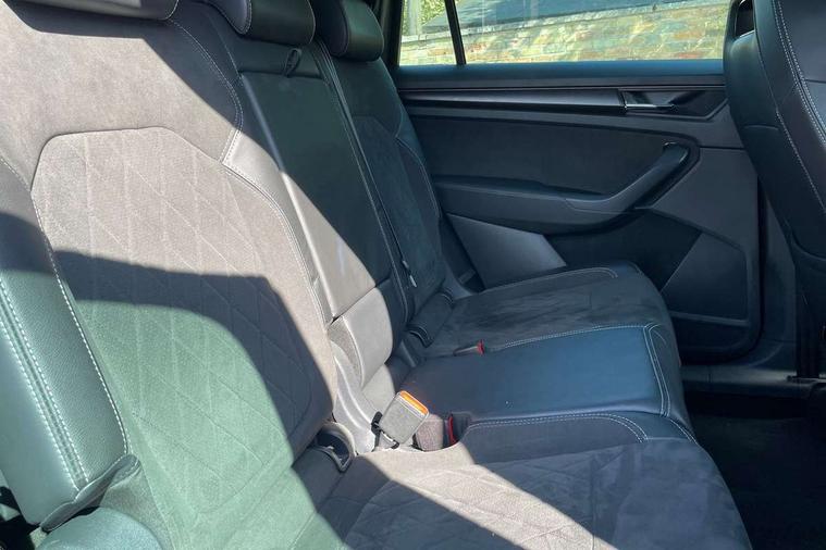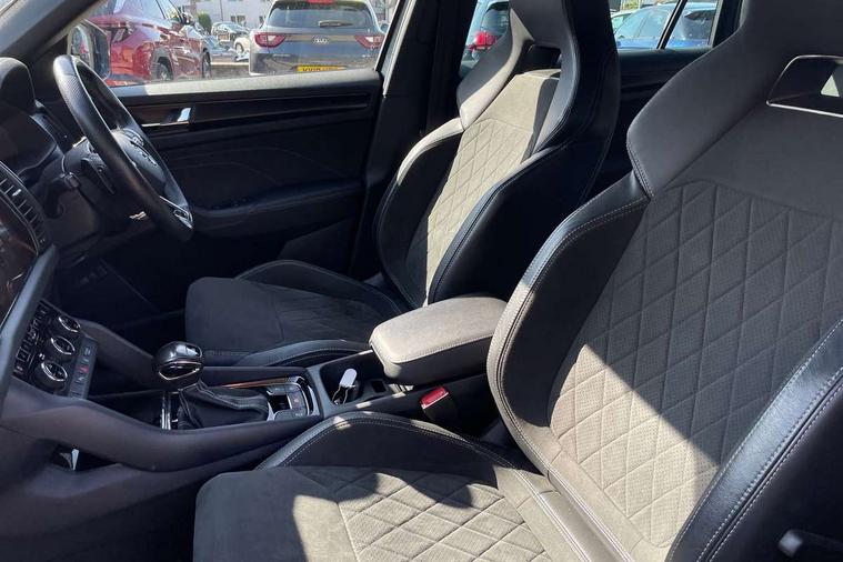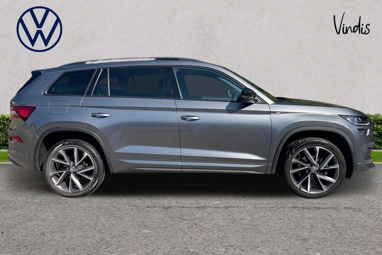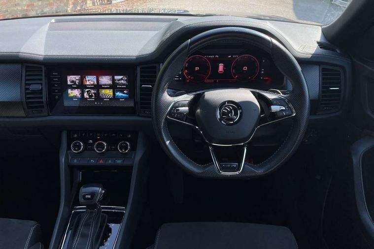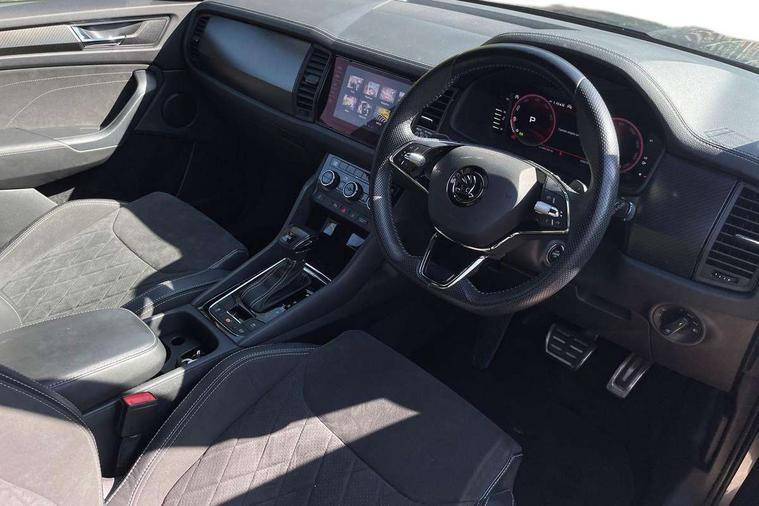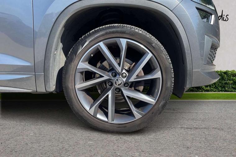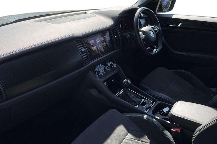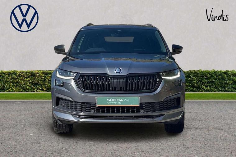 Bluetooth system, Columbus satellite navigation with 9.2" touchscreen, integrated Wi-Fi, web radio, E-call, ECO Stop/start function, Exterior temperature indicator, Progressive steering, Rear view camera, Smartlink wireless for apple carplay and wired for android auto, Speed limiter, USB C Port x 2 in front centre console, Wireless charging, 8 speakers, DAB Digital radio, Aero front windscreen wipers with intermittent function, Aero rear window wiper, Auto dimming rear view mirror, Black roof rails, Black sports styling including front grille and window surrounds, Black wheel arch surrounds, Body colour bumpers, Body colour door handles, Electric front and rear windows, Extended rear spoiler with finlets in gloss black, Front fog lights, Full LED matrix headlights with AFS (adaptive front light system), cornering function and AWL (all weather lighting system), Gloss black door mirrors, Headlight washers, Heated rear window, Invisible tailpipe, LED daytime running lights, LED rear fog light, LED third brake light in rear spoiler, Light assistant (coming/leaving home/tunnel light), Off-road style lower front bumper element, Privacy glass, Rain and light sensors, Rear diffuser, Rear LED lights (high functionality) with welcome effect and dynamic indicators, Safety reflectors on front and rear doors, Sportline badge on front fender, Sports front and rear bumpers including lower rear chrome strip, Tailgate lettering in Black, Window control switches with black trim, 12V socket in boot, 2 rails with 2 hooks, 4 foldable roof handles with rear coat hooks, 60:40 foldable rear seat with sliding adjustment and backrest angle adjustment, Aluminium pedals, Black roof headlining, Bottle holders in door panel in the 1.5 litre front and 1 litre rear, Cargo storage compartments, Chrome headlight control button, Chrome interior door handles, Coat hooks on B pillar, Covered storage compartment on driver side, Decorative door sills in the front and rear, Front centre armrest with storage compartment, cup holder and 12V socket, Front courtesy lights, Gear shift lever with chrome frame and black gloss insert, Grey stitching in front and rear armrests and door armrests + door inserts, Height adjustable front headrests, Illuminated and cooled glovebox, Illuminated luggage compartment, Isofix child seat fittings in outer rear seats with top tether, Manually adjustable steering column, Microsuede door panels, Net programme in boot (1x horizontal Net, 2x vertical Nets), Overhead glasses storage compartment, Pollen filter, Rear centre armrest with cupholders, Sliding trunk cover, Small Bags on the inner sides of the front backrests, Sports seats, Sunvisors with illuminated vanity mirrors, Three rear height adjustable headrests, Ticket holder on A Pillar, Umbrella in door panel, Variable boot floor, LED Interior light pack - Kodiaq, Auto door release and activation of warning lights, Driver and front passenger airbag with knee airbag and front passenger airbag deactivation, Electronic parking brake with hill start assist, Emergency rear braking signal, ESC (incl. ABS+MSR+ASR+EDS+HBA+DSR+RBS+MKB), Front assist with autonomous emergency braking, Front side airbags with curtain airbags, Fuel cut off safety device, Height adjustable front 3 point seatbelts + pretensioners, Hill hold control, Rear disc brakes, Safety vest holder in door, Seat belt reminder for all seats, Tailgate unlocking from outside, Three point rear seat belts, Two tone horn, Tyre pressure monitor, Alarm with interior monitoring and tilt sensor with safe function, Anti-theft wheel bolts, Immobiliser, Keyless entry and start system (KESSY), Remote central locking with 2 keys, Black air vent surround, Carbon finish dashboard and door inserts, Grey stitching in dashboard, 20" Vega Anthracite alloy wheels, Temporary spare wheel (space saver),