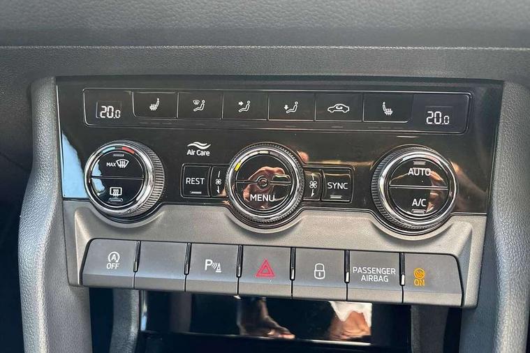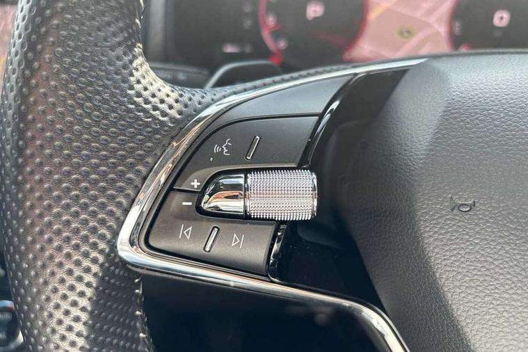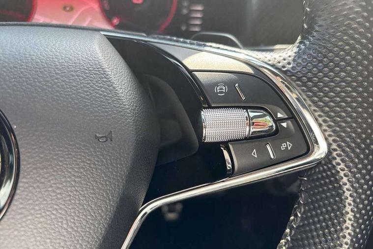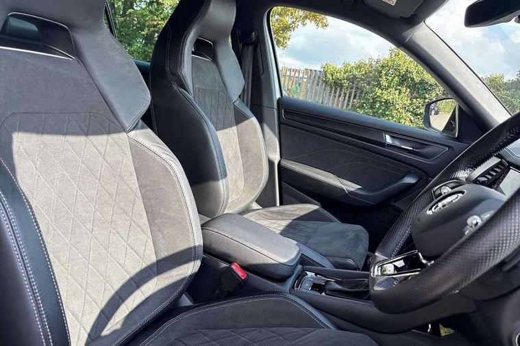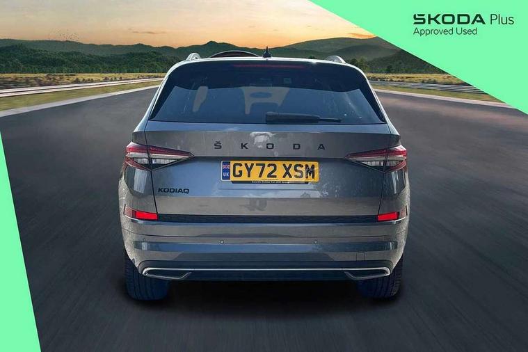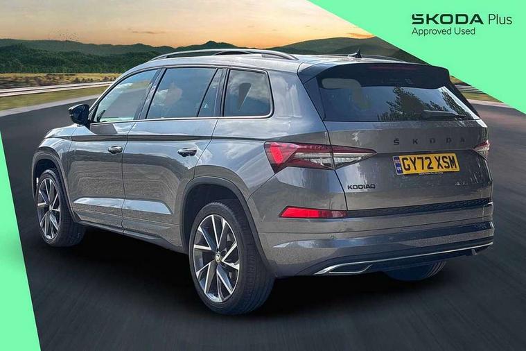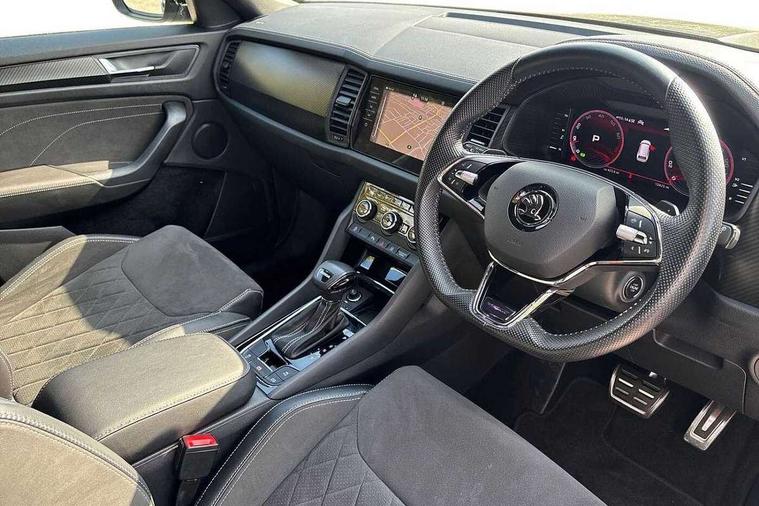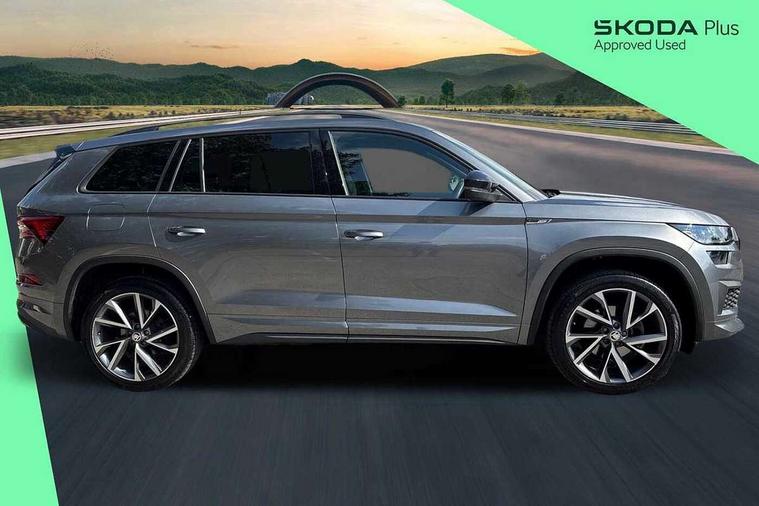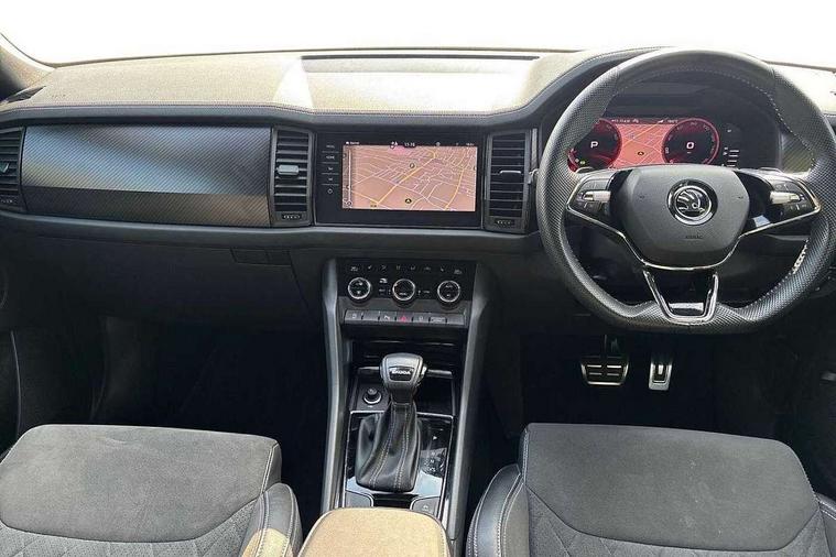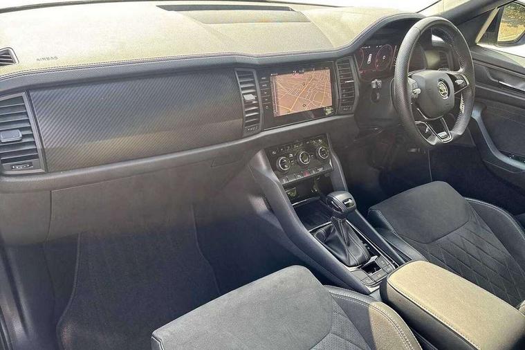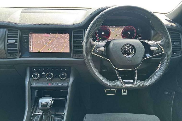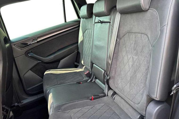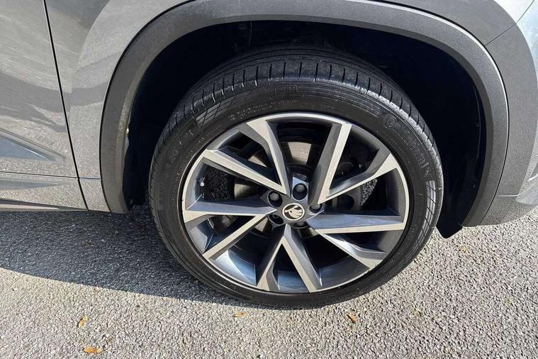 Bluetooth system, Columbus satellite navigation with 9.2" touchscreen, integrated Wi-Fi, web radio, Digital voice enhancement, E-call, ECO Stop/start function, Exterior temperature indicator, Progressive steering, Rear view camera, Smartlink wireless for apple carplay and wired for android auto, Speed limiter, Tailgate unlocking from outside, USB C Port x 2 in front centre console, Wireless charging, 8 Speakers, DAB Digital radio, Aero front windscreen wipers with intermittent function, Aero rear window wiper, Auto dimming rear view mirror, Black roof rails, Black sports styling including front grille and window surrounds, Black wheel arch surrounds, Body colour bumpers, Body colour door handles, Electric adjustable/heated/folding door mirrors, driver side auto dimming with boarding sports and memory function, Electric front and rear windows, Extended rear spoiler with finlets in gloss black, Front fog lights, Full LED matrix headlights with AFS (adaptive front light system), cornering function and AWL (all weather lighting system), Gloss black door mirrors, Headlight washers, Heated rear window, Invisible tailpipe, LED daytime running lights, LED rear fog light, LED third brake light in rear spoiler, Light assistant (coming/leaving home/tunnel light), Off-road style lower front bumper element, Privacy glass, Rain and light sensors, Rear diffuser, Rear LED lights (high functionality) with welcome effect and dynamic indicators, Rear side wing doors, Safety reflectors on front and rear doors, Sportline badge on front fender, Sports front and rear bumpers including lower rear chrome strip, Tailgate lettering in Black, Window control switches with black trim, 12V socket in boot, 2 rails with 2 hooks, 2 seat bench in 3rd row, 3 seat bench in 2nd row, 4 foldable roof handles with rear coat hooks, 60:40 foldable rear seat with sliding adjustment and backrest angle adjustment, Aluminium pedals, Black roof headlining, Bottle holders in door panel in the 1.5 litre front and 1 litre rear, Cargo storage compartments, Chrome headlight control button, Chrome interior door handles, Coat hooks on B pillar, Covered storage compartment on driver side, Front centre armrest with storage compartment, cup holder and 12V socket, Front courtesy lights, Gear shift lever with chrome frame and black gloss insert, Grey stitching in front and rear armrests and door armrests + door inserts, Height adjustable front headrests, Illuminated and cooled glovebox, Illuminated luggage compartment, Isofix child seat fittings in outer rear seats with top tether, Manually adjustable steering column, Microsuede door panels, Net programme in boot (1x horizontal Net, 2x vertical Nets), Overhead glasses storage compartment, Pollen filter, Rear centre armrest with cupholders, Single front passenger seat, Sliding trunk cover, Small Bags on the inner sides of the front backrests, Sports seats, Sunvisors with illuminated vanity mirrors, Three rear height adjustable headrests, Ticket holder on A Pillar, Umbrella in door panel, Variable boot floor, LED Interior light pack - Kodiaq, Auto door release and activation of warning lights in the event of an accident, Child locks on rear doors, Driver and front passenger airbag with knee airbag and front passenger airbag deactivation, Electronic parking brake with hill start assist, Emergency rear braking signal, ESC (incl. ABS+MSR+ASR+EDS+HBA+DSR+RBS+MKB), Front assist with autonomous emergency braking, Front side airbags with curtain airbags, Fuel cut off safety device, Height adjustable front 3 point seatbelts + pretensioners, Hill hold control, Rear disc brakes, Safety vest holder in door, Seat belt reminder for all seats, Three point rear seat belts, Two tone horn, Tyre pressure monitor, Alarm with interior monitoring and tilt sensor with safe function, Anti-theft wheel bolts, Immobiliser, Keyless entry and start system (KESSY), Remote central locking with 2 keys, Black air vent surround, Carbon finish dashboard and door inserts, Grey stitching in dashboard, 20" Vega Anthracite alloy wheels, Temporary spare wheel (space saver),