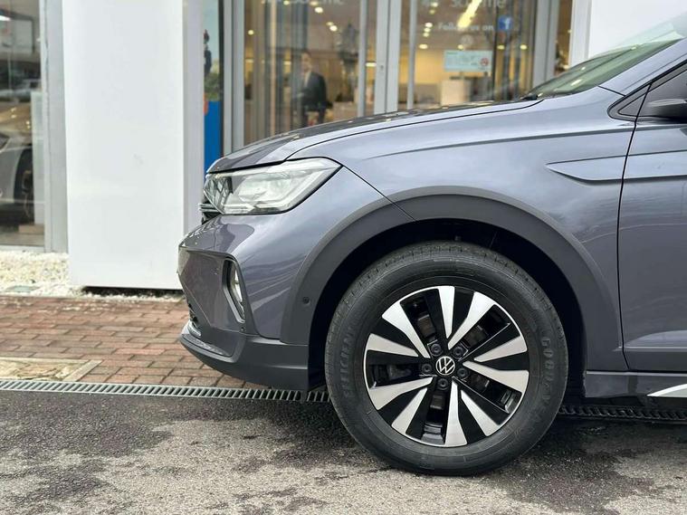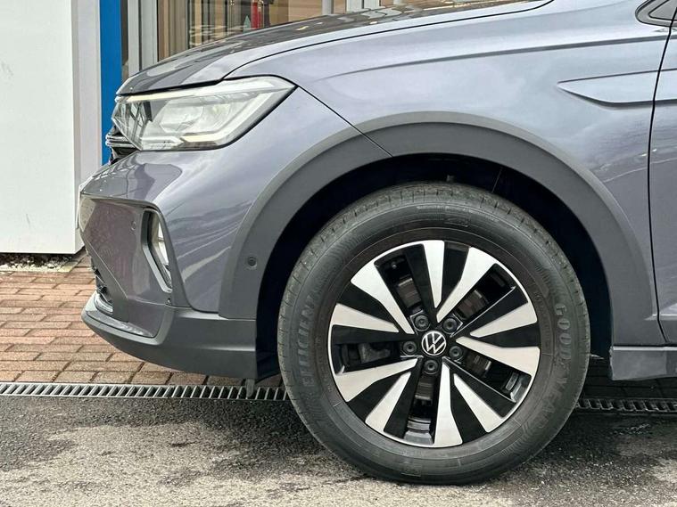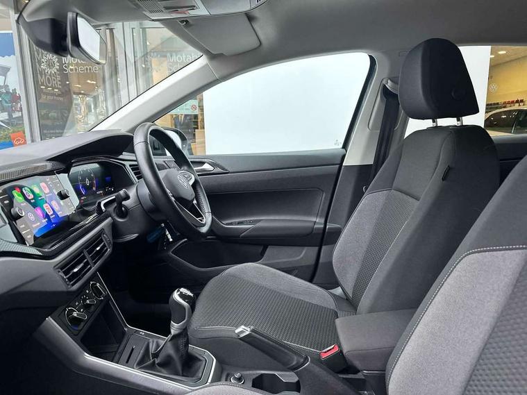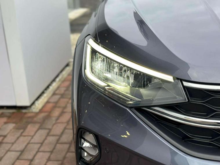 Driver alert system, e-Call (emergency call), Power Steering, Travel assist including emergency assist, Washer fluid level indicator, Wireless Charging including Bluetooth, Start-stop system with battery regeneration (recuperation - energy recovery during braking), WeConnect plus, Ambient lighting with logo projection, Aspherical driver's exterior mirror, Auto headlights, Body coloured bumpers, Body coloured exterior mirror housings and door handles, Electric windows, External USB type C socket and charging sockets, Front fog lamps with cornering function, Headlight range control, Heat insulating glass windscreen, LED headlamps, LED rear combination lamp, LED third brake light, Left convex exterior mirror, Power folding adjustable/heated exterior mirrors and front passenger exterior mirror lowering function, Rear fog light on one side, reversing light on both sides, Rear side wing doors, Rear wash/wipe with intermittent wipe setting, 'Slash/ Austin' Cloth upholstery, 12V socket in centre console, 2 front reading lights, 3 rear head restraints, 3 seat bench in 2nd row, Black carpets, Child seat anchor for child seat system i-Size, 2x top tether and child seat anchor in front on front passenger side, Door and side trim panels in titan black, Driver and front passenger seat height adjustment, Front centre armrest, Handbrake lever handle in leather, Height and reach adjustable steering wheel, Leather trimmed gear knob, Leather wrapped multifunction steering wheel, Luggage compartment floor, Luggage compartment light, Lumbar support for driver's and front passengers seat, Seat covers in titanium black, Single front passenger seat, Split folding backrest with centre armrest and unsplit rear seat bench, Storage compartment under front seats, Sun visors with illuminated vanity mirrors, Chrome Package - Taigo, Drivers assistance pack - Taigo, Light and Sight pack including High beam assist - Taigo, 2 x 3-point seatbelts/outer rear seats with ECE label, 3-point seat belts in front with pretensioner and height adjustment, 3-point seatbelt for centre rear seat, Driver and front passenger airbags with front passenger airbag de-activation, front side and curtain airbags, Driver and front passenger safety-optimised head restraints, Electronic stability control, Extended and predictive pedestrian/ cyclist protection, Front and rear disc brakes, Front curtain and side airbags with center airbag, Hill start assist, Manual rear child locks, Single tone horn, Tyre pressure loss indicator, Anti-theft alarm system with interior monitoring, backup horn, and towing protection, Anti-theft wheel bolts, Lava stone black gloss/matt decorative inserts in dash and front door panels, Low rolling resistance tyres,