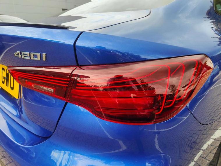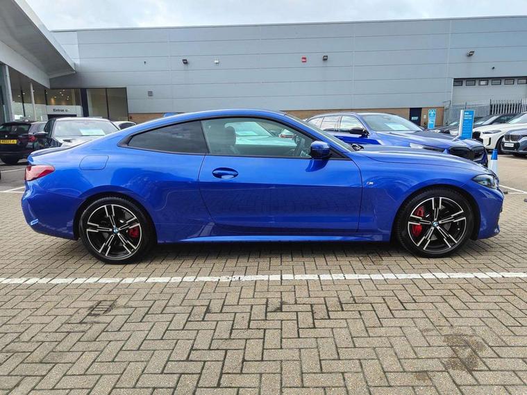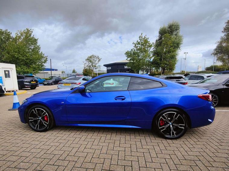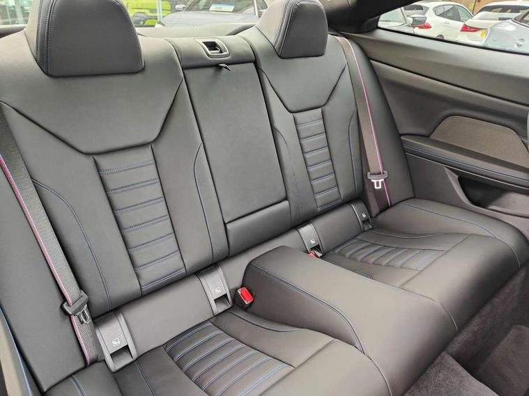 Active guard plus, Attentiveness assist, Auto start-stop, Bluetooth hands free facility with USB audio interface with audio streaming, BMW ConnectedDrive online services, BMW iDrive controller on centre console, BMW Live Cockpit Plus Nav-12.3" instrument&14.9" control Widescreen curved display/Intelligent Voice Assist/iDrive touch/Access 3rd party app/4G LTE, BMW service history, BMW Teleservices, Brake pad wear indicator in front and rear, Check Control warning system for monitoring of lights and door/luggage compartment open warning, Condition based service, Electric power steering with Servotronic steering optimised at all speed ranges, Gearshift time display in manual mode, Instrument cluster with speedometer with mph readout, tachometer, fuel gauge and oil temperature gauge, Integrated owners handbook, Language version English, Oil sensor for level and grade, warning by check control system, On board computer - average speed, fuel consumption, outside temp display with acoustic warning, clock/date, service interval, odometer/trip meter, Optimum shift indicator, Run flat indicator, Shifting point display, Variable sport steering, 8 speed automatic steptronic transmission with gearshift paddles, Balanced 50/50 weight distribution, Double joint spring strut front axle, Double VANOS, Drive performance control - ECO PRO, comfort and sport modes, High precision injection, Low centre of gravity, Petrol Particulate Filter, Stroke dependent dampers, VALVETRONIC engine management, 1x USB type A with data transfer and 1.5 Amp charging function in the centre console, 1x USB type C with 3 Amp charging function in the front centre armrest, DAB tuner, Electronic service booklet, Personal eSim, Acoustic glazing, Automatic headlight beam throw control with load dependent regulating reaction, dynamic compensation of braking dive and acceleration squat, Automatic windscreen wipers and automatic headlight, Automatically dimming electrochromatic rear view mirror, BMW emblem on engine compartment lid and tailgate, BMW kidney grille with mesh grille front side of the nuggets in matt aluminium and frame in chrome high gloss, Body colour fuel filler flap, Body colour roof fin, Brushed aluminium inserts in the front door sill finishers with BMW designation, Door sill strips, Dynamic brake lights, Electric windows - front and rear, with open/close fingertip control, anti trap facility and comfort closing function all round, Exterior mirrors - electrically folding with anti-dazzle, Fading support, Follow me home headlights, Front and rear bumper system, Front apron plastic in body colour, Green tinted heat protection glazing, High gloss shadow line exterior trim, Illuminated bow type door handles in body colour drivers side with door lock, Interior rear view electrochromatic mirror with automatic anti dazzle function, LED 3rd brake light, LED daytime running lights, LED front fog lights, LED front indicators, Licence plate panel integrated into front bumper and tailgate, Lightweight engineering, Low and high beam headlights in Bi-LED, M designation on front side panels, left and right, M rear boot spoiler, One piece front bumper cover including towing eye cover in body colour, Preparation for high beam assistant, Rear boot, Reversing light, Side frame decorative moulding black matt, Two part LED tailights in L-shape with components in smoked glass, brake light, LED turn indicator and rear fog light, Visible exhaust tailpipe finisher, Visible VIN plate, Welcome lights in interior and door handle area, Widened track and increased camber values for max transverse dynamics, agility and steering precision, Window recess finisher strip in matt black, Windscreen wipers with integrated heated washing jets, 12V power socket in front centre console, 2 front cupholder in centre console with clamping elements and matt black inlay, 2 Rear seat headrests, 2 seat bench in second row, 2 zone automatic air conditioning, 3 spoke flat bottom M sport leather multifunction steering wheel, 4 pieces lashing eyelets in luggage compartment, 40:20:40 split folding rear seat and rear centre armrest with two cupholders, Anthracite headlining, Armrest integrated in front and rear door trim + front centre console armrest, Battery in luggage compartment, BMW ID, Extended storage - Luggage compartment partition net on left side trim panel, Bag hook on both sides of the luggage compartment, Four grab handles integrated in roof lining, Front and rear door pockets, Front and rear reading lights, Front footwell lights, Heated driver and front passenger seats, Height adjustable front headrests, Height adjustable mechanically and infinitely variable steering column, Illuminated armrest storage compartment, Illuminated glove compartment with separate small compartment, Luggage compartment light, Make-up mirror lights, Single front passenger seat, Storage compartment in rear centre console, Sunvisors with illuminated vanity mirrors and ticket pocket, Through load system, Toolkit located in luggage compartment, Velour front floor mats, Ambient lighting pack - 4 Series, Connected professional package - 4 Series, M sport exterior styling pack - 4 Series, Park assist pack - 4 Series, 2 x 3-point rear seatbelts, Battery safety cut-off, BMW emergency call, Brake energy regeneration, Braking pre-tensioning, Child seat ISOFIX attachment for the two outer rear seats, Coasting in idle in ECO PRO mode, Cornering brake control (CBC), Crash sensor activating of airbags, Unlocking doors, hazard warning lights, fuel cut off, interior lighting+activation of safety battery terminal clamp, Driver and front passenger side airbags, integrated in the door side seat backrest bolsters for all seat variants, Driver/Front Passenger airbags, Dry braking, Dynamic brake control, Dynamic stability control + (DSC+) - Anti-lock Braking System (ABS) with brake assist and cornering brake control + Automatic Stability Control (ASC), Dynamic Traction Control - DTC, Electric parking b