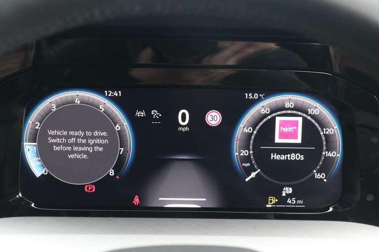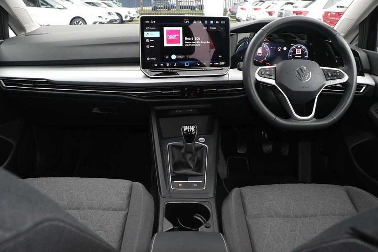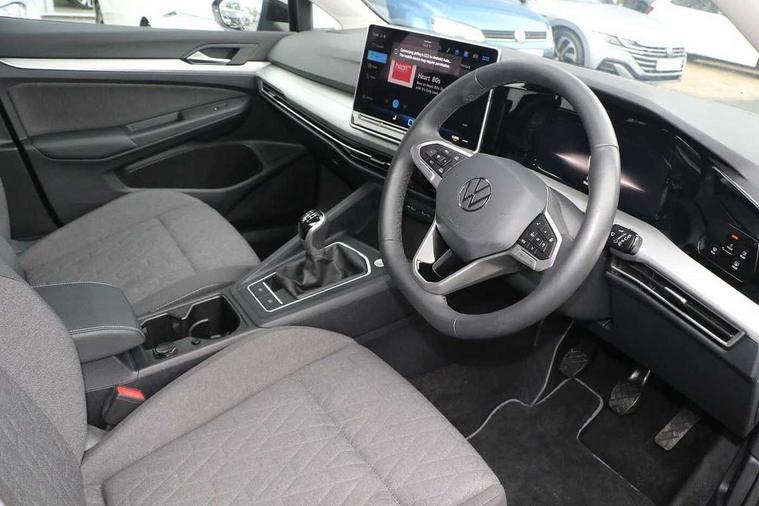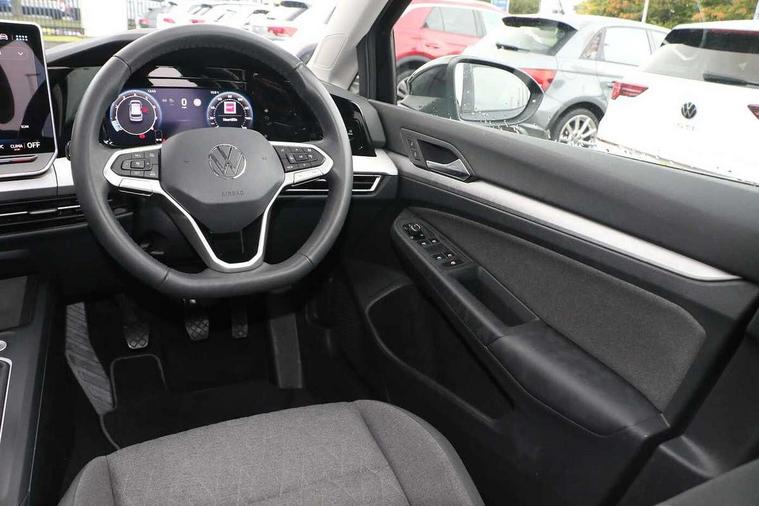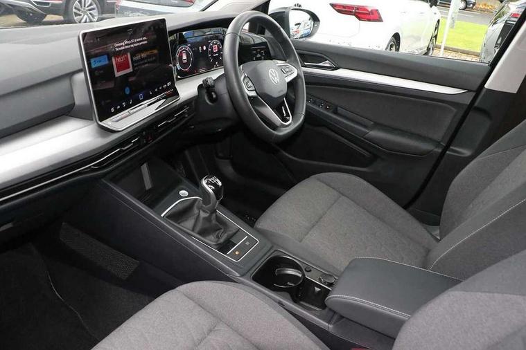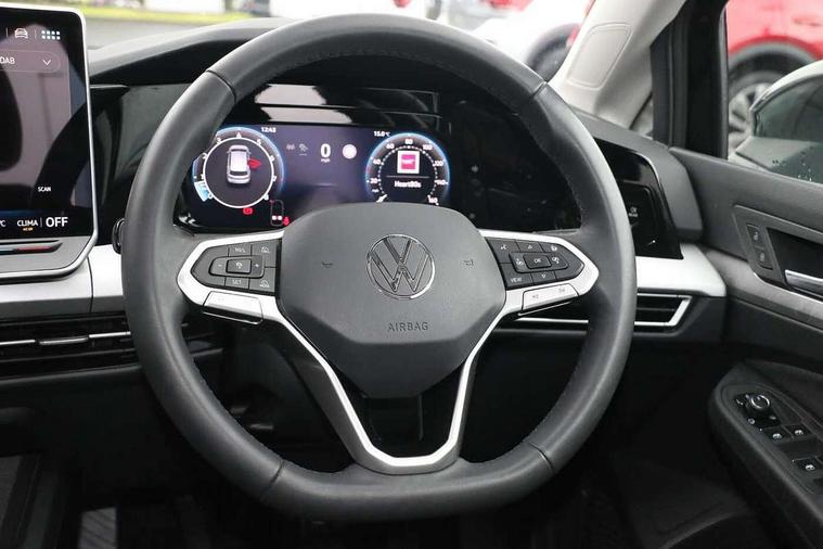 Activated carbon canister, Adaptive cruise control (ACC), Advanced driver attention and drowsiness monitor, Dynamic road sign display, E-Sim card for online connectivity, eCall emergency call system, Multi-color Digital cockpit pro, selection of different info profile possible, Multifunction front facing camera for distance control, Navigation system, Oncoming vehicle braking when turning including swerve support, Preparation for light assist system, Speed limiter, Speedo, rev counter, electronic odometer, trip, service interval display, exterior temperature and fuel gauge, Voice enhancer and voice control, Warning signal and warning light for front and rear seatbelts not fastened, We connect plus preparation, We connect preparation, Wireless app connect, Petrol Particulate Filter, Start-stop system with battery regeneration (recuperation - energy recovery during braking), XDS electronic differential lock for improved traction and handling, 2 USB C ports in front, 2 USB charging sockets on the centre console in the rear charging capacity upto 45W, Comfort telephony + wireless charging, without wireless aerial connection, Digital radio reception (DAB), Diversity antenna for FM reception, Gaming platform via car app, Infotainment system with 12.9" display, Mobile phone interface with inductive charging feature, 3rd brake light, Auto dimming rear view mirror, Auto headlights, Automatic headlamp activation with Coming home and Leaving home feature, Body colour door handles, Body colour door mirrors, Exterior ambient lighting with illuminated door handles, Exterior mirrors convex on the left and aspherical on the right, Front and rear electric windows, Heat insulating windshield made of laminated glass, LED daytime running lights, Rain sensor, Rear exhaust tailpipe, Rear fog light on one side and reversing lights on both sides, Rear side wing doors, Rear tinted glass 65% light absorbing from B pillar backwards, Rear windscreen washer and wiper with interval delay, Remote electrically foldable door mirrors, puddle lights and reverse activated passenger's door mirror, Standard bumpers, Welcome light with surround lighting, 12V socket in front centre console, 12V socket in luggage compartment, 3 rear head restraints, 3 seat bench in 2nd row, Chrome plated radiator grille inserts, air vent surrounds and light switch surrounds, Front centre armrest, Front head restraints, ISOFIX anchors for child seats on outer rear bench seats and on front passanger seat compatible for i-Size, Leather gearshift handle, Luggage compartment lighting, Rear cupholder and loadthough, Single front passenger seat, Soul black instrument panel, Split folding backrest with centre armrest and unsplit rear seat bench, Standard pedal cluster, Storm grey roof lining, Sun visors with illuminated vanity mirrors, Parking and comfort pack - Golf Estate/Hatchback, 3 point height adj front seatbelts + pretensioners, 3 rear three point seatbelts, ABS, Autonomous emergency braking front assist with pedestrian and cyclist monitoring, Child locks on rear doors, Driver and front passenger airbag with front passenger airbag deactivation, Electronic parking brake with auto hold, ESC (Electronic Stability Control), Extended pedestrian protection measures, Rear disc brakes, Two tone horn, Tyre pressure loss indicator, Volkswagen roadside assistance, Alarm with interior protection, Anti theft wheel bolts, Keyless start with SAFE lock, Preparation for alcohol interlock, Nature cross brushed decorative inserts for dashboard and front door panels,