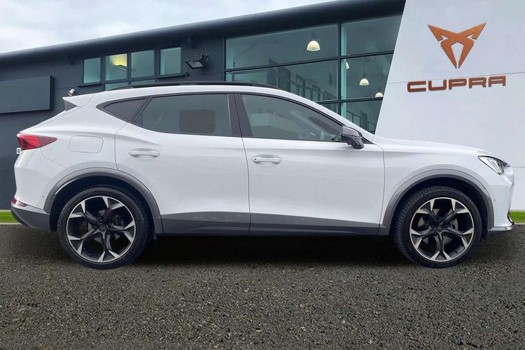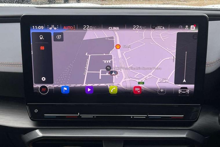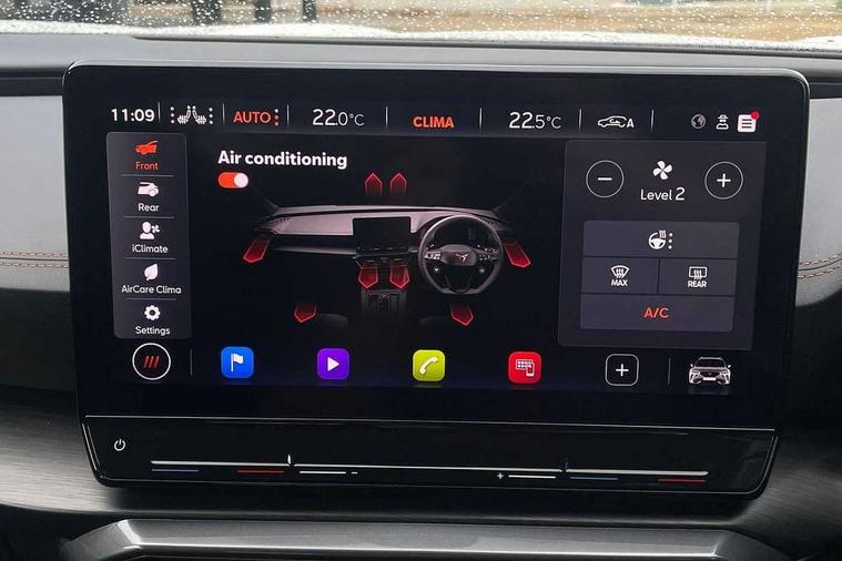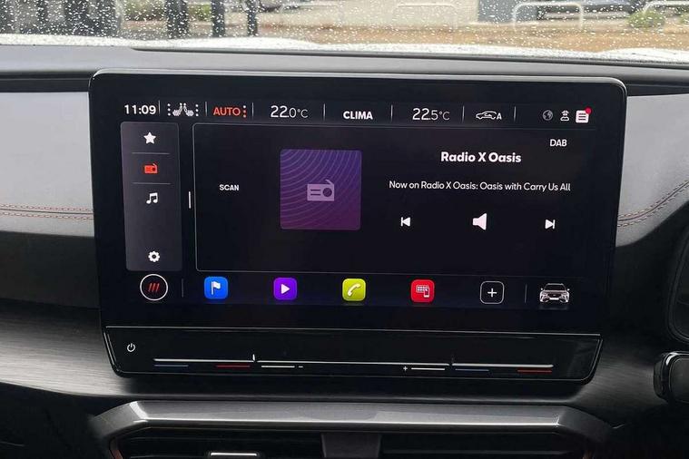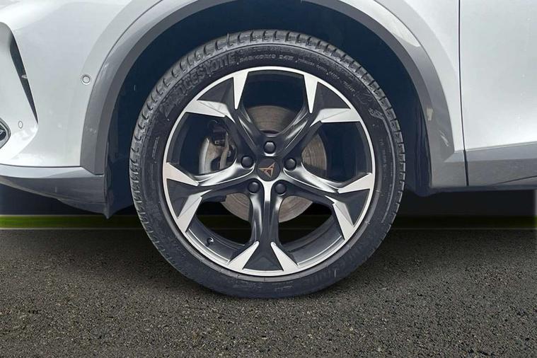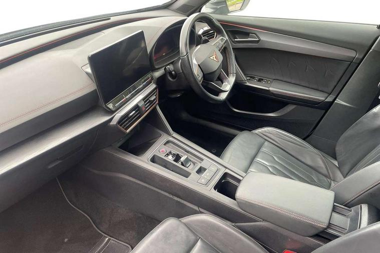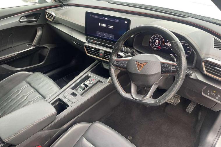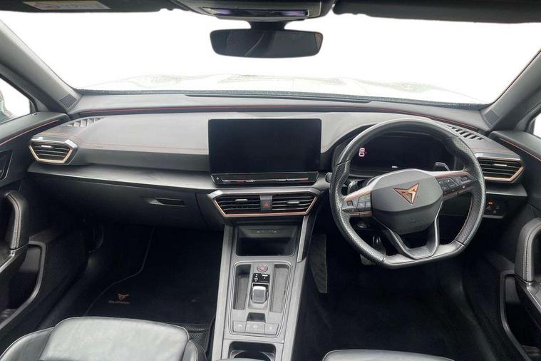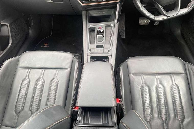 Digital cockpit and configurable dashboard, Driver alert system, Driving profile selection, Forward collision warning with automatic braking, Lane assist, Navigation system with 12'' Touchscreen Display, Park assist (inc front/rear parking sensors), PAS, Predictive adaptive cruise control with speed limiter, Rear view camera, RPM, trip computer, outside temp gauge, instrument light brightness, low fuel warning light, lights on reminder, gearshift indicator, Service interval indicator, Start/stop system with regenerative braking, Voice control system, Wireless apple carplay, Wireless phone charger, Electronic locking differential and dynamic traction support, Standard suspension, 2 front and 2 rear USB type C sockets, Auxiliary input socket, DAB radio, Auto dimming rear view mirror, Body colour door handles, Body coloured bumpers, Dark grey wing mirror, Daytime running light with automatic headlight control and coming home feature, Dynamic headlight range control, Electric front/rear windows, Electrically adjustable heated and folding door mirrors with memory function, Front fog lamps with cornering function, Gloss black roof rails and window surrounds, LED Headlights, LED Taillights with dynamic indicator, Rain sensing wipers, Rear diffuser with black simulated exhaust pipes, Rear side wing doors, Rear wash/wipe, Third brake light, Tinted rear windows, Welcome lights, 12v power supply in centre console, 12V socket, 12v socket in loadspace, 2 front and 2 rear reading lights, 230V socket, 3 seat bench in 2nd row, 60/40 split rear bench seat with armrest and mechanical seat release, Black headlining, Dust/pollen filter, Front and rear head restraints, Front centre armrest, Height/reach adjust steering wheel, Illuminated interior front door sills, Illuminated sunvisor with mirror, Isofix, Leather multi function heated steering wheel with gear shift paddles, Luggage tie-down hooks, Single front passenger seat, Three zone climate control with control panel in rear, Variable luggage/load compartment floor, Wraparound lighting, Genuine Nappa leather Pack - Cupra, 3 point seatbelts on all rear seats, ABS, Brake control system - ESC and brake booster, Child proof door locks, Driver and front passenger airbags with front passenger airbag de-activation, Electronic parking brake, Front and rear disc brakes, Front side curtain airbags, Hill hold control, Public e-call, Seat belt reminder for front and rear seats, Tyre pressure monitoring system, Anti theft alarm system, Keyless entry and start system (KESSY), Locking wheel bolts, Copper and aluminium interior detailing, 19" 'Exclusive' machined sport matte black and silver alloy wheels,