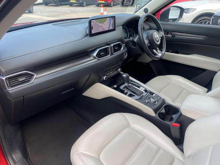 10.25" display with Mazda Connect infotainment, 7" colour TFT display, Apple car play/Android Auto, Blind spot monitoring with rear cross traffic alert, Bluetooth connectivity with voice control, Collision prevention assist, Colour head up display, Connected services, Electric power steering, Emergency stop signalling system, Engine start/stop button, Forward collision warning, Front and rear parking sensors, Integrated navigation system, Intelligent speed assist, Lane departure warning system, Lane keep assist, Power tailgate, Radar cruise control with Stop and Go, Reversing camera, Service indicator, Traffic sign recognition, Trip computer, i-stop, 2 USB sockets in rear, 2x USB sockets in front, AM/FM radio, Bluetooth audio streaming, Bose premium sound system with 10 speakers, DAB Digital radio, Multimedia Commander including separate volume dial, Steering wheel mounted audio controls, Adaptive front lighting system, Auto dimming rear view mirror, Body colour door mirrors, Body colour roof spoiler, Body coloured front bumper with black lower mouldings, Body coloured rear bumper with black lower mouldings, Coming/leaving home lighting function, Door mirror integrated indicators, Dual exhaust pipes, Dusk sensitive headlamps, Electric adjustable/heated/folding door mirrors, Electric front/rear windows/one touch facility, High beam assist, Intermittent rear wash/wipe, LED daytime running lights, LED front fog lights, LED Headlights, LED third brake light, Power tilt/slide sunroof, Privacy glass, Rain sensing front wipers, Scuff plates, Shark fin roof aerial, Signature LED rear combination lights, Windscreen wiper de-icer, 2 cupholders, 3 grab handles with rear coat hook, 40:20:40 Karakuri fold-flat seat system, 6 way electric adjustable passenger seat, 8 way electric driver seat with lumbar support + memory, Driver/passenger front seatback pockets, Driver/passenger sunvisors + illuminated vanity mirrors (drivers with ticket holder), Dual zone climate control, Front and rear door pockets, Front centre armrest, Front centre console storage box, Heated front seats, Heated steering wheel, Height adjustable head restraints, Humidity sensor, Illuminated glovebox, Interior dome light with integral spotlight, Interior incandescent lighting, ISOFIX child seat anchorage points attached on outer rear seats, Karakuri tonneau cover, Leather steering wheel/gearknob/handbrake grip, Leather upholstery, LED interior illumination, Light roof lining, Luggage compartment lighting, Rear air vents, Rear centre armrest with 2 cupholders, Rear headrests, Rear power outlet, Rear seat recline, Sunglasses holder, Tilt/height adjustable steering wheel, 3 point front seatbelts with pre-tensioners, 3 rear 3 point seatbelts, ABS, Advanced Smart City Brake Support - SCBS, DSTC-Dynamic Stability and Traction Control, Dual front airbags, Electronic brake force distribution, Electronic parking brake with auto hold, Front and rear curtain airbags, Front passenger airbag deactivation, Front side airbags, G-Vectoring control, Hill hold assist, Seatbelt reminder front and rear, Smart brake support with forward obstruction warning, Tyre pressure monitoring system, Automatic door locking when moving off, Deadlock, Immobiliser, Power door locks, Remote central locking, Smart keyless entry, Thatcham Cat.1 alarm, Upper dashboard and door trim in wood grain metal, 19" Silver alloy wheels, Tyre repair kit,