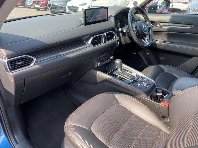 10.25" display with Mazda Connect infotainment, 7" colour TFT display, Apple car play/Android Auto, Blind spot monitoring with rear cross traffic alert, Bluetooth connectivity with voice control, Collision prevention assist, Connected services, Cruising Traffic Support, Drive mode selector, Electric power steering, Emergency stop signalling system, Engine start/stop button, Forward collision warning, Front and rear parking sensors, Integrated navigation system, Intelligent speed assist, Lane departure warning system, Lane keep assist, Power liftgate, Qi wireless phone charging, Radar cruise control with Stop and Go, Reversing camera, Service indicator, Trip computer, Windscreen projected colour active driving display (HUD) with memory, i-stop, 2 USB sockets in rear, 2x USB sockets in front, AM/FM radio, Bluetooth audio streaming, Bose premium sound system with 10 speakers, DAB Digital radio, Multimedia Commander including separate volume dial, Steering wheel mounted audio controls, Adaptive front lighting system, Auto dimming rear view mirror, Automatic headlights, Black inlay dashboard panel, Body colour door mirrors, Body colour roof spoiler, Body coloured front and rear black lower bumper mouldings, Bright finish signature wing, Coming/leaving home lighting function, Door mirror integrated indicators, Dual chrome tailpipes, Dusk sensitive headlamps, Electric front/rear windows with one touch auto up/down, Front grille in gloss black finish, Gloss black B and C pillars garnish, High beam assist, Intermittent rear wash/wipe, LED auto levelling, LED daytime running lights, LED front fog lights, LED Headlights, LED third brake light, Power folding and heated door mirrors, Power tilt/slide sunroof, Privacy glass (rear side windows only), Rain sensing front wipers, Rear side wing doors, Satin black side mouldings, Scuff plates, Shark fin antenna, Signature LED rear combination lights, Vinyl with wood grain metal inlay door trim panel, Windscreen wiper de-icer, 12v electrical power outlet, 3 seat bench in 2nd row, 3 stage heated front seats, 40:20:40 Karakuri fold-flat seat system, 6 way electric adjustable passenger seat, 8 way electric driver seat with lumbar support + memory, Cargo room flat floor board with waterproof undertray, Driver seat power slide, recline and height adjustment, Driver, Front passenger and two rear grab handles with coat hooks, Driver/passenger front seatback pockets, Driver/passenger sunvisors + illuminated vanity mirrors (drivers with ticket holder), Dual zone climate control, Folding centre armrest with 2 cup holders, Front and rear door pockets, Front centre storage with two cupholders, Front passenger seat power slide, recline and height adjustment, Heated steering wheel, Humidity sensor, Illuminated glovebox, Interior dome light with integral spotlight, ISOFIX child seat anchorage points attached on outer rear seats, Karakuri tonneau cover, Leather upholstery, Leather wrapped steering wheel and gear knob, Light roof lining, Luggage compartment LED lighting, Luggage compartment power outlet, Paddle shifts, Rear air vents, Rear headrests, Rear seat recline, Roof mounted sunglasses holder, Single front passenger seat, Three height adjustable head restraints, Tilt/height adjustable steering wheel, White interior LED illumination lighting, 3 point front seatbelts with pre-tensioners, 3 rear 3 point seatbelts, ABS, Advanced Smart City Brake Support - SCBS, Child locks on rear doors, Driver and front passenger side airbags, DSTC-Dynamic Stability and Traction Control, Dual front airbags, Electronic brake force distribution, Electronic parking brake with auto hold, ESP, Front and rear curtain airbags, Front passenger airbag deactivation, G-Vectoring control, Hill hold assist, Seatbelt reminder front and rear, Single stage passenger airbags, Smart brake support with forward obstruction warning, Tyre pressure monitoring system, Automatic door locking when moving off, Deadlock, Immobiliser, Power door locks, Remote central locking, Smart keyless entry, Thatcham Cat.1 alarm, 19" diamond cut black alloy wheels, Tyre repair kit,