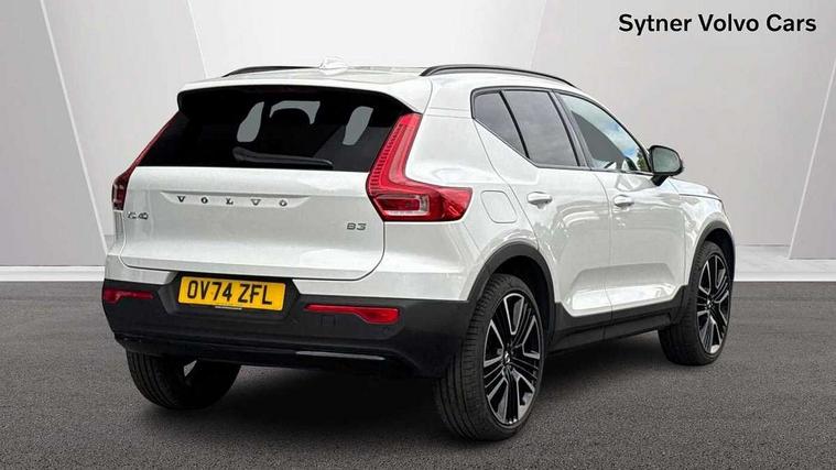 12.3" Progressive Driver Display, 360 degree surround view parking camera with side proximity sensors, 9" centre console portrait touch screen, Adjustable steering wheel force, Apple carplay (wired), Bluetooth handsfree system, Driver alert control, Driver assistance (pilot assist and adaptive cruise control), Driver awareness - Blind spot information system with steer assist, cross traffic alert with autobrake and rear collision warning and mitigation, E-call, Google automotive services - Enabled entertainment apps, navigation with google maps, voice recognition with google assistant, Hands free power tailgate, Intelligent speed assistance, Lane keeping aid, Oncoming Lane Mitigation, Speed sensitive steering, Volvo cars services with app - Driving journal, emergency and breakdown call, engine remote start, remote door locking/unlocking and vehicle dashboard, Wireless/Inductive Mobile Phone Charging, Automatic transmission with start/stop and manual change functions, Dynamic chassis, DAB Digital radio, Premium Sound by Harman Kardon, Dolby Pro Logic II Surround Sound, Dirac Unison, 12 speakers/600W and subwoofer, Steering wheel mounted remote controls, Active bending pixel LED headlights with adaptive shadow technology, Active high beam incorporating daytime running lights, Adaptive brake lights with high level LED brake lights, Auto dimming feature for exterior door mirrors, Auto dimming interior mirror, Automatic headlamp levelling, Dark tinted windows - rear side windows and rear screen, Front aluminium tread plates, Front and rear electric windows, Headlight cleaning system, High gloss black front and rear skid plate, High gloss black front bumper deco, High gloss black mesh front grille with high gloss black surround, High gloss black window trim, Home safe and approach lighting, Integrated roof rails in high gloss black, LED front fog lights with cornering function, Power glass tilt and slide panoramic sunroof with sun curtain, Puddle lights, Rain sensor with automatic windscreen wiper activation, Rear side wing doors, Rear wiper, Roof antenna, Roof spoiler, Visible VIN plate, 12V socket in front tunnel console and luggage compartment, 2-Zone electronic climate control with CleanZone air quality system and pollen filter, 3 seat bench in 2nd row, 3 Spoke tailored steering wheel with chrome trim, 60/40 versatile split folding rear seat, Centre console cupholders and storage, Flexible load floor and grocery bag holder, Floor mats, Front cabin courtesy lights, Front door pocket, front cupholder, ambient front door, rear reading, rear courtesy, instrument panel and tailgate lighting, Front footwell illumination, Front headrests, Front reading lights, Front seat cushion extensions, Front side step illumination (under door), Glovebox bag hook, Heated front seats, Height/reach adjustable steering column, High gloss centre tunnel deco, Illuminated glovebox, Illuminated luggage compartment, Illuminated vanity mirrors + ticket holder, Integrated waste bin, Isofix attachments on outer rear seats, Load cover, Load protection net, Multi directional lumbar support for driver and passenger seat, Power driver seat with memory + exterior mirrors memory, Power folding rear headrests, Power passenger seat, Rear armrest with cupholders, Single front passenger seat, Underfloor cargo storage, Climate pack without heated front seats - XC40, 3x3 point rear seatbelts, City safety with steering support with Pedestrian + cyclist + front collision warning with full auto brake and rear auto brake, Driver and passenger airbags, Drivers knee airbag, Electronic parking brake with auto hold, First aid kit, Front and outer rear seatbelt reminder and pretensioners, Front seats SIPS airbags, Hill descent control, Hill start assist, Inflatable curtain, Passenger airbag cut-off device, Power child locks on rear doors, Road sign information display, Run off Road Protection, SIPS (Side Impact Protection System), Slippery road and hazard light alert, Stability and Traction Control with Spin control, Engine Drag Control and Corner Traction Control, Tyre pressure monitoring system, Vehicle deceleration control with Anti-lock Brake System, Electronic Brake Distribution and Emergency Brake Assist, Warning triangle, WHIPS whiplash protection system - front, 2 x Key integrated remote control central locking including with deadlocking system and auto open/close windows and sunroof, Anti-theft alarm including immobiliser/volume sensor + level sensor, Keyless drive includes keyless entry and keyless start, Locking wheel nuts,