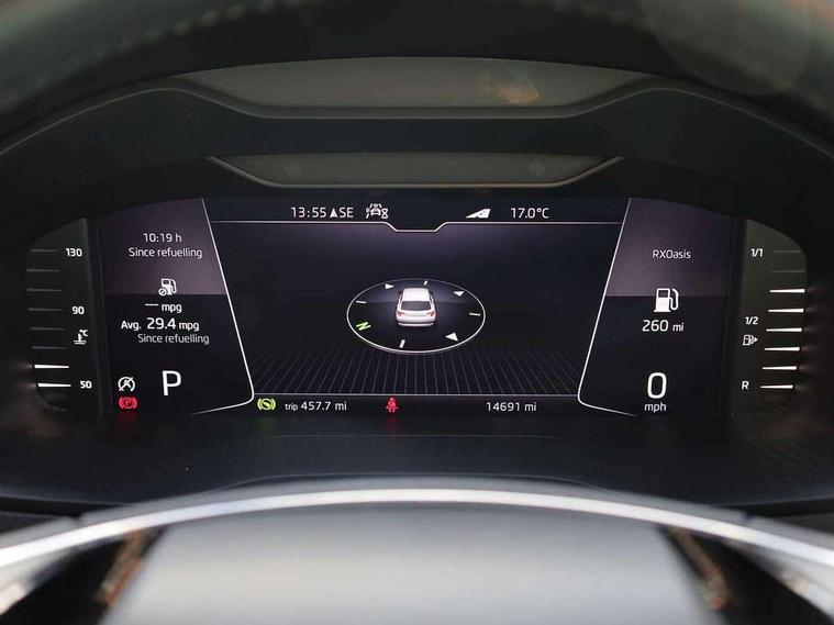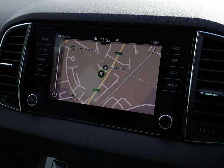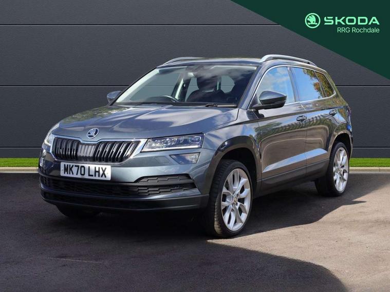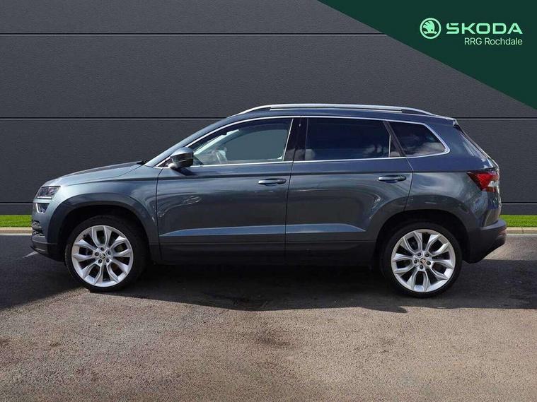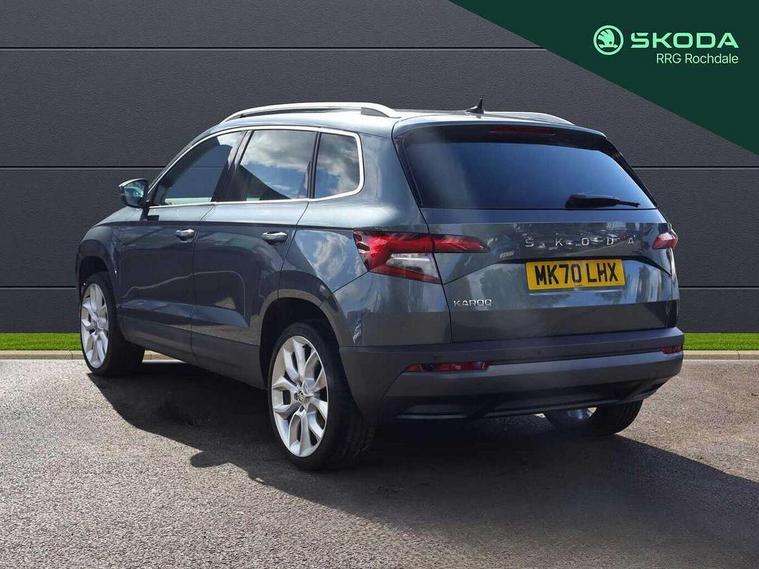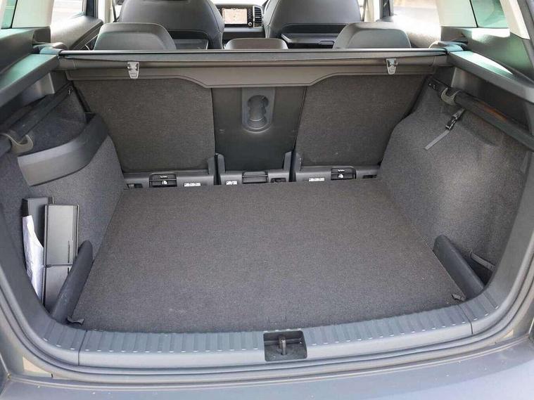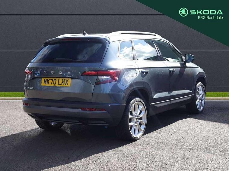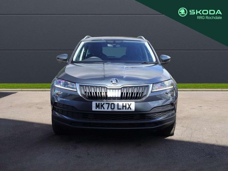 Care connect, Drive mode selector, Driver alert system, Driver fatigue sensor, Driver profile selection, Multifunction colour trip computer, Outside temperature gauge, Rear view camera, Service interval indicator, SmartLink + wireless for Apple and wired for Android, Start/stop system with regenerative braking, USB C Port x 2 in front centre console, DAB radio with Bluetooth, SD card slot, USB connection, Acoustic glass, Aero front windscreen wipers with intermittent function, Automatic headlight control system, Black electric window control buttons, Body colour door mirrors and handles, Body coloured bumpers, Electric front and rear windows with child proof lock, Full LED headlights + adaptive front light system + LED daytime running lights and front cornering fog lights, Headlight washers, Heated rear windscreen, LED rear lights with high functionality, Light assistant (coming/leaving home/tunnel light), Privacy glass, Safety reflectors on front doors, Third brake light, 1.5 litre bottle holders in driver and front passenger door panels, 12V socket in boot, 12v socket in front centre armrest with storage compartment and rear air vents, 2 Folding hooks and nets in boot, 2 Front readings lights for driver and passenger, 3 rear height adjustable headrests, 4 foldable roof handles with rear coat hooks, 4 lashing points on luggage floor, Backrest release, Cargo elements in boot, Chrome inner door handles, Folding tables on the front seat backrests, Front head restraints, Front seat and rear pockets, Height adjustable front three point seats belts with tensioners, Height adjustable passenger seat, Height/reach adjust steering wheel, Ice scraper, Illuminated and cooled glovebox, Illuminated luggage compartment, Isofix child seat preparation outer rear, Net programme in boot, Pen holder, Pollen filter, Rear boot cover, Rear reading lights, Rear seats fixed folding and divided 60:40, Retractable parcel shelf attachable to tailgate, Safety vest holder, Storage box in upper central dashboard closed, Storage compartment below the passenger seat, Sunvisors with illuminated vanity mirrors, Textile floor mats, Umbrella under passenger seat, VarioFlex seats with retractable parcel shelf, Chrome roof rails + chrome pack - Karoq, Airbags - Front side, head, knee and curtain, Automatic door unlocking in case of crash, Automatic fuel cut off in case of crash, Driver airbag, Electronic parking brake with auto hold function, Emergency rear braking signal, ESC including ABS, MSR, ASR, EDS, HBA, DSR, RBS, MKB and traction control, Front assist radar scanning of the space in front of the car with automatic braking, Hill hold control, Passenger airbag with switch-off function, Pedestrian monitor, Seatbelt reminder signalisation and pretensioner for all seats, Three point seatbelts rear, Two tone horn, Tyre pressure display, Tyre pressure monitor, Alarm with interior monitoring, back up horn and tilt sensor with safe function, Electronic engine immobiliser, Keyless entry and keyless start with safe system, Remote central locking with 2 remote folding keys, Chrome framed air vents, 19" Crater alloy wheels with anti theft wheel bolts, Storage on wheel cover,