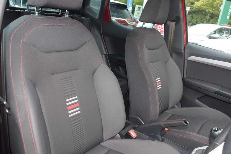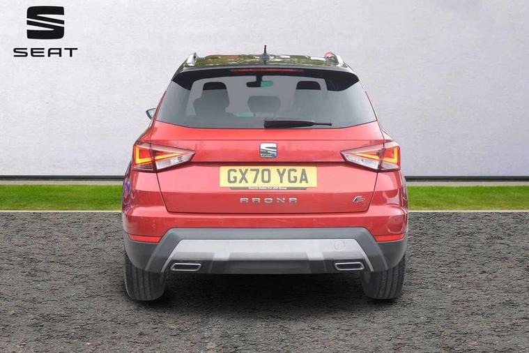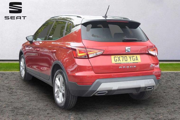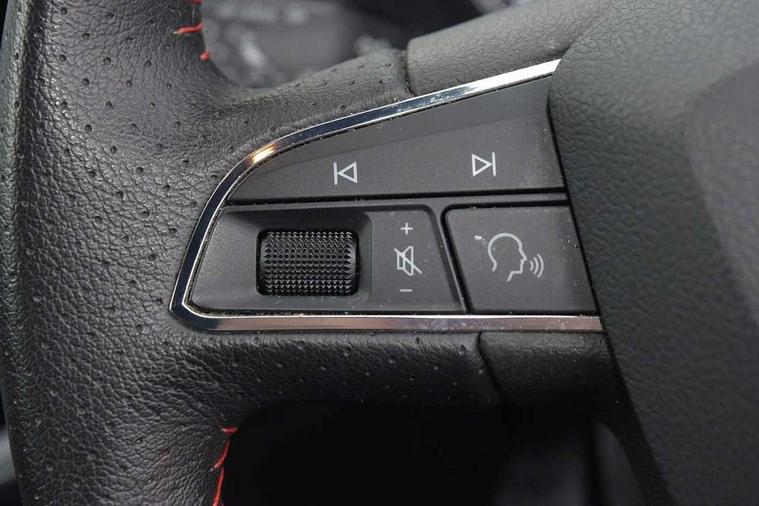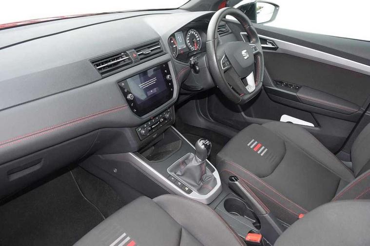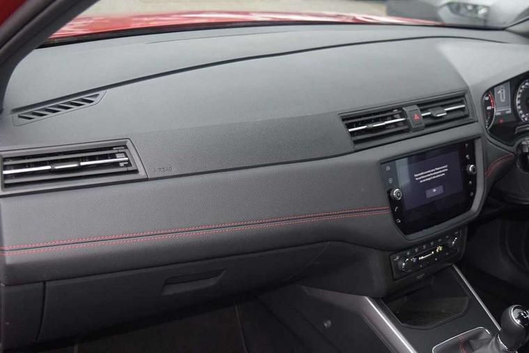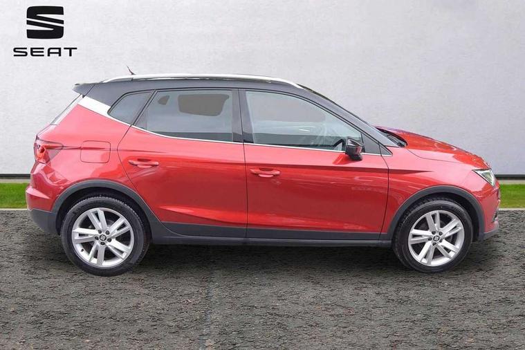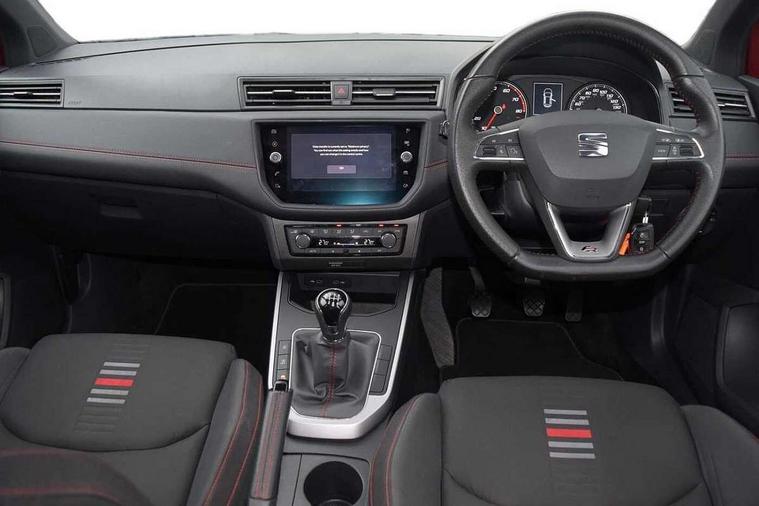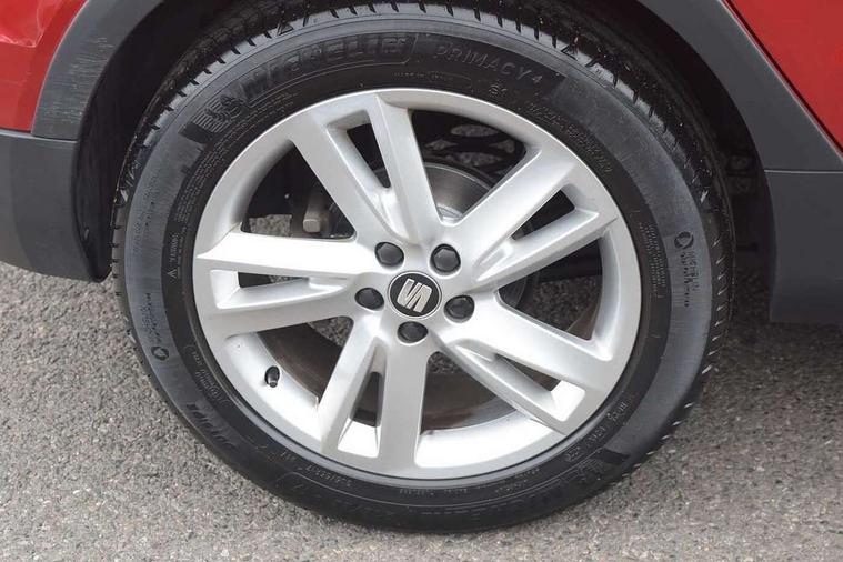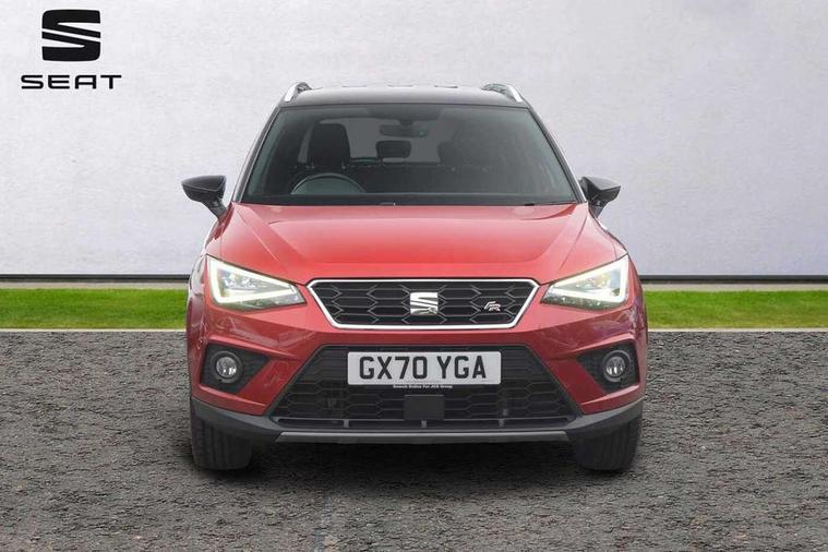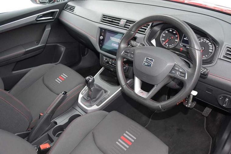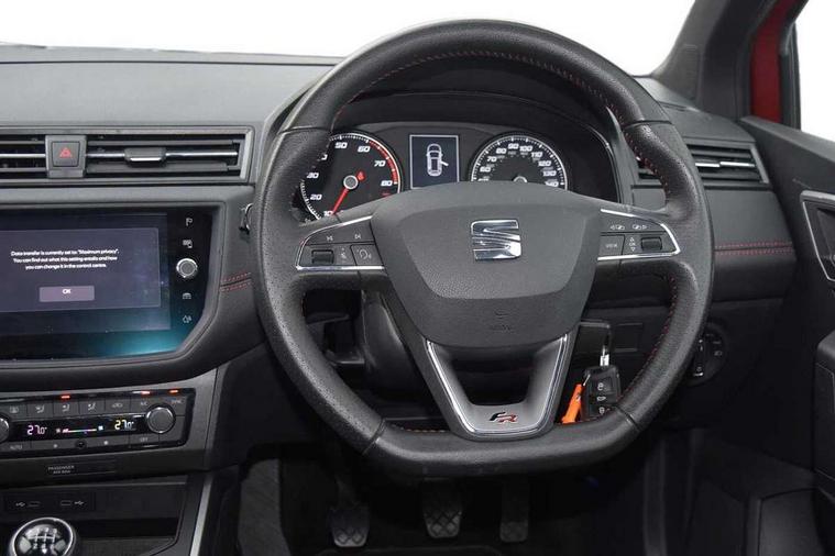 'Lights On' Reminder warning buzzer, Cruise control and speed limiter, Digital clock, Electric speed sensitive power steering, Full Link Smartphone Integration with Mirror Link, Apple Car Play, Google Android Auto with USB Type C cable for Apple and Android compatibility, Low fuel warning light, Outside temperature display, Rear parking sensor, RPM counter, Seat connect with safety, service, remote and online, SEAT Drive profile - Four different models normal-sport-eco-individual, steering response, throttle response, Trip computer, Sports suspension, 6 speakers, Bluetooth interface for hands free and audio streaming, DAB digital radio and AM/FM radio, Steering wheel mounted audio controls, Anti theft roof antenna, Auto dimming interior rear view mirror, Automatic activation of hazard warning lights, Automatic headlights, Body coloured bumpers, Body coloured door handle inserts, Chrome front grille frame, Chrome roof rails, Chrome window trim, Coming/leaving home lighting function, Dark tinted rear windows, Electric front/rear windows with one touch/auto up/down, Electrically adjustable, heated and folding door mirrors, Full LED headlights dipped and mainbeam + front and rear fog lights, LED daytime running lights, LED rear tail lights and licence plate lights, Protective side mouldings, Rain sensing wipers, Rear window wash/wipe, Roof colour door mirrors, Twin exhaust pipe styling hidden exhaust pipe, Visible VIN plate, Windshield wiper with intermittent control and potentiometer, 2 cupholders, 60/40 split folding rear seat, Aircare filter, Black interior roof, Double boot floor, Driver sunvisor with covered mirror + card holder, Dual zone climate control, Front courtesy light with front reading lights, Front sport seats, Gear shift indicator, Height adjustable front seats, Height/reach adjustable steering column, Illuminated boot, Instrument lighting with brightness control, Interior light in footwell, central console and door panel, ISOFIX points in outer rear seats with top tether anchorage points, Multi-colour ambient interior lighting, Nora cloth upholstery, Passenger sunvisor with vanity mirror, Perforated flat bottomed leather steering wheel/gear knob/handbrake with red stitching and FR logo, Two front and three rear height adjustable headrests, Connectivity pack plus - Arona, Interior chrome pack - Arona, 3 point seatbelts on all rear seats, ABS, Active front headrests, Child locks on rear doors, Driver and front passenger airbags with front passenger airbag de activation, front side and curtain airbags, Electronic stability control, Emergency Brake Assist (EBA) and front assist, Front and rear seatbelt reminder, Hill hold control, Multi-Collision braking, Tiredness recognition system, Traction control, Tyre pressure monitoring system, 2 folding remote keys with window open/close function, Alarm with back-up horn, Electronic engine immobiliser, Locking wheel bolts, Remote central locking + deadlocks, Tow away protection, Interior chrome line trim, Leatherette dashboard, 17" Dynamic alloy wheels,