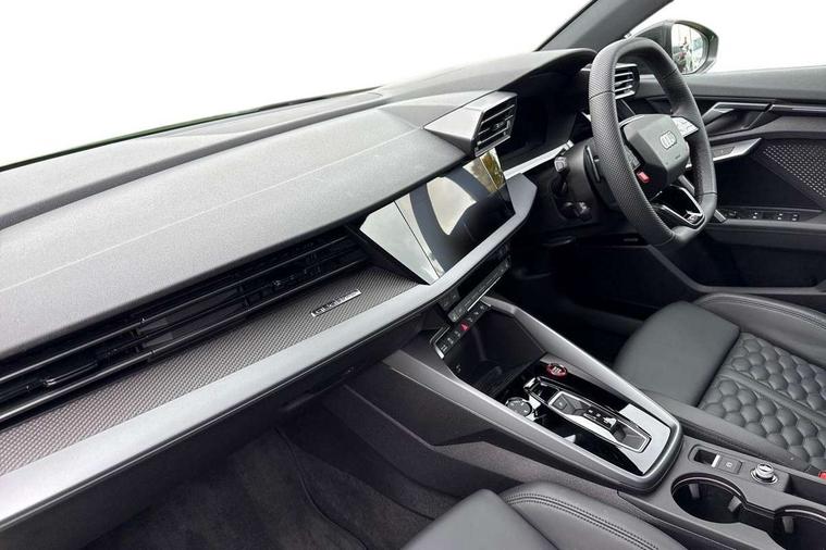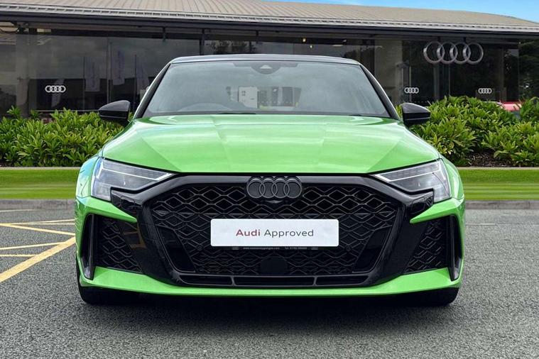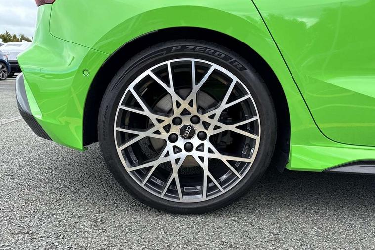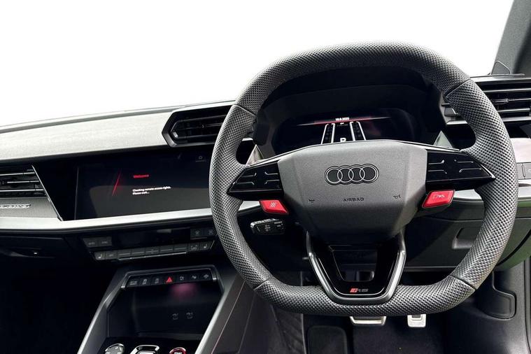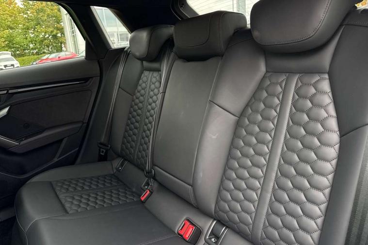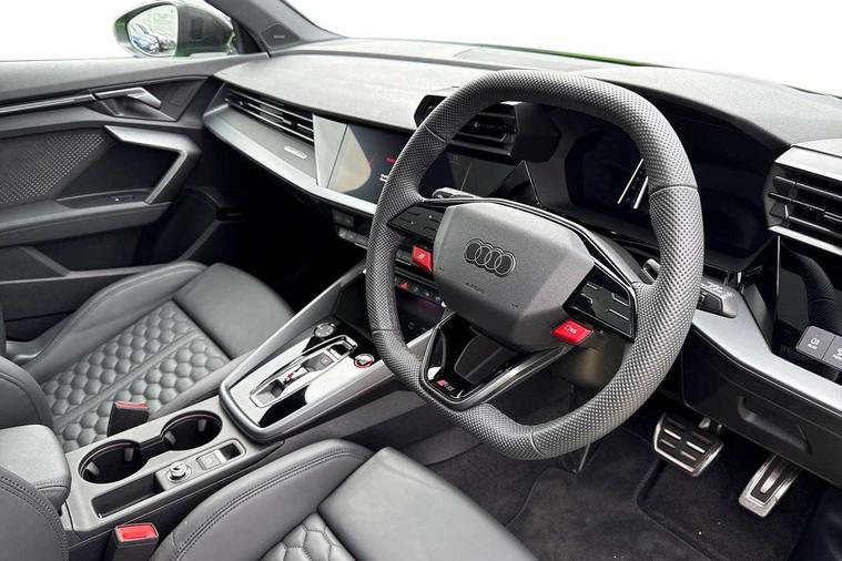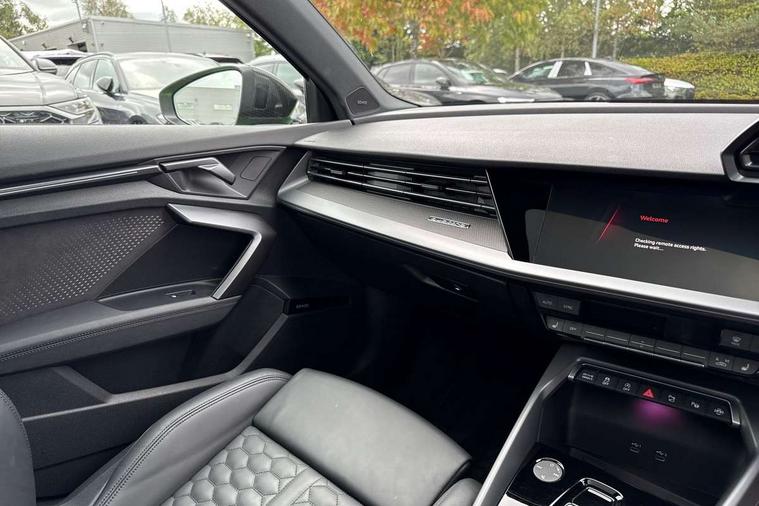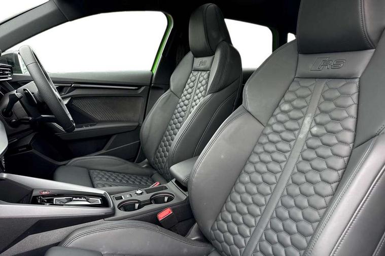 Adjustable speed limiter, Audi drive select comfort, auto, dynamic and efficiency, Audi smartphone interface with app store includes wireless Apple carplay, Android auto and Amazon alexa integration, Audi virtual cockpit plus with RS specific design and 12.3" display with additional graphic display options, Automatic start/stop system with recuperation, Bluetooth interface, Camera based traffic sign recognition, Collision avoidance assistant, Distraction and Fatigue warning, e-Call (emergency call), Lane departure warning system, MMI Navigation Plus with high resolution 10.1" colour touch screen display, Park Assist with parking system Plus, Progressive steering, RS specific driving modes - RS Individual, RS Performance and RS Torque rear, Voice control system with natural language interaction, Adaptive suspension with audi drive select, Increase of top speed to 174 mph, Quattro permanent four wheel drive, Audi Phonebox light with wireless charging, DAB Digital radio, USB ports with charging function in the rear, Audi beam LED projection of RS logo on ground as you exit, Auto dimming frameless rear view mirror, Automatic dynamic range control, Carbon door mirror housings, Carbon fibre engine cover, Dipped beam, main beam, position light and turning light, Electrically adjustable/heated/folding/auto dimming door mirrors with integrated LED indications + kerb view function for passenger side, Exterior model badging, Front electric windows, Heat insulating glass windscreen, LED 3rd brake light, LED brake lights, LED daytime running x3, LED rear number plate lights, LED reverse light, LED tail lights, Light and rain sensors, Privacy glass - dark tinted rear window, rear door and side windows, Rear electric windows, Rear side wing doors, Rear wiper, Roof edge spoiler in carbon, RS dual branch exhaust system with two chrome plated oval tailpipe trims, 12V socket and storage compartment in front centre console, 3 seat bench in 2nd row, 3 Spoke flat top and bottomed black leather multi function steering and gear shift paddles, 3-zone deluxe automatic air conditioning, 40/20/40 split folding rear seat bench, Black cloth headlining, Front and rear headrests, Front centre armrest, Front door sill trims with RS 3 logo, Front sports seats RS embossed logo, Front/rear floor mats, Heated front seats, Height and reach adjustable steering wheel, Manual boot compartment lid, Rear centre armrest with cupholder, Seat side bolsters, Single front passenger seat, Stainless steel pedals and front footrest in black, Vanadium look - Interior door handles, Door trim, power latching, Air vents, window controls, mirror adjust, rear door lock, Selector lever in centre console, Black Styling plus package - RS3, Extended ambient lighting package Pro with Multi-coloured contour lighting of instrument panel - RS3, RS exterior features pack in carbon and gloss black - RS3, RS sport suspension pack - RS3, Storage package - RS3 Sportback, 3x3 point rear seat belts, Driver and front passenger airbag with passenger airbag deactivation, Electronic Stabilisation Control (ESC) including ABS, ASR and EDL, First aid kit with warning triangle and 2 safety vests, Hill hold assist, Pre-sense front with pedestrian and cyclist detection, RS steel brakes, Seatbelt monitoring, Tyre pressure loss indicator, Anti theft alarm, Anti-theft wheel bolts, Electronically operated child locks, Inlays in carbon atlas structure, Tyre repair kit,