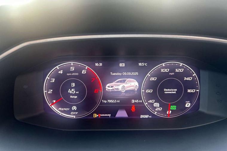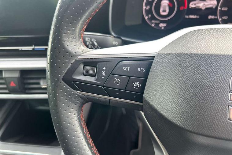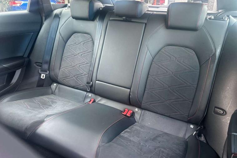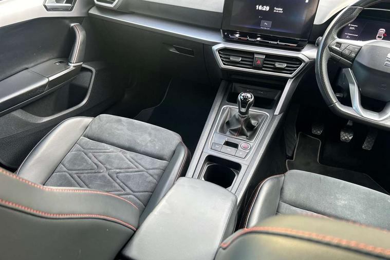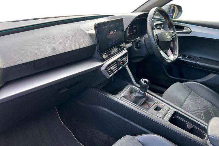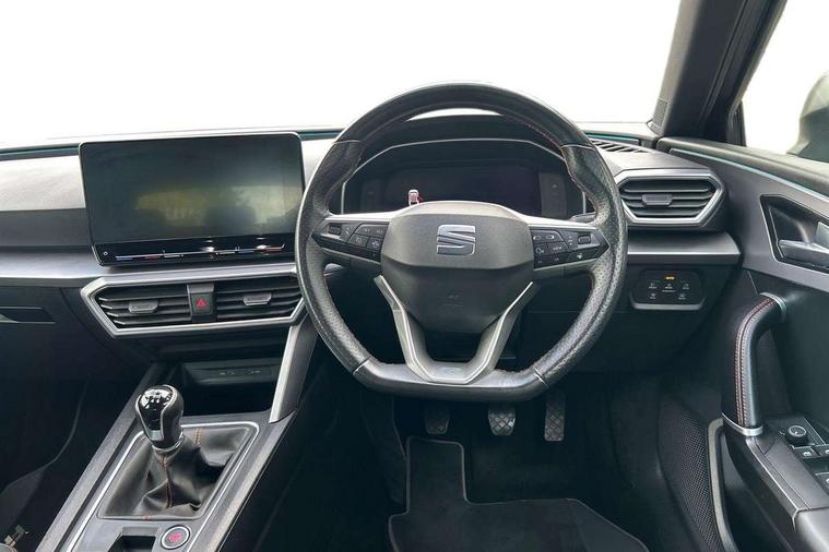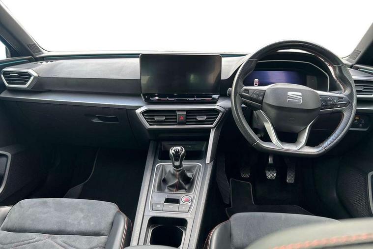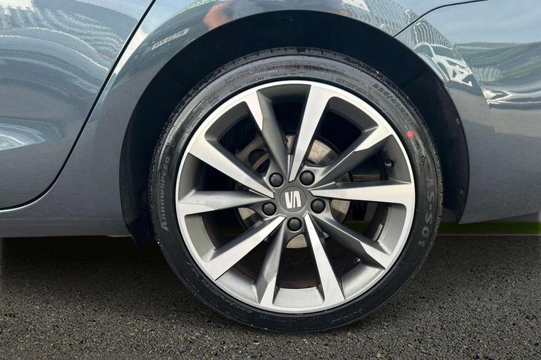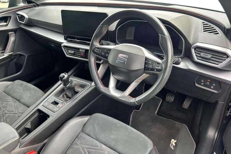 Digital cockpit, Four x USB Type C ports, Front assist with forward collision warning braking reaction to vehicles, pedestrians and cyclists, Full link smartphone integration with Mirror Link, wireless Apple CarPlay and wired Google Android Auto, Lane assist, Park assist (inc front/rear parking sensors), Power assisted speed sensitive electro-mechanical steering, RPM, trip computer, outside temp gauge, instrument light brightness, low fuel warning light, lights on reminder, gearshift indicator, SEAT drive profile with 4 modes (Eco/Normal/Sport/Individual), throttle response, Service interval indicator, Start/stop system with regenerative braking, Sports suspension, XDS electronic differential lock and dynamic traction support, 7 speakers, Auxiliary input socket, Auto dimming rear view mirror, Body colour door handles, Body coloured bumpers, Dark tinted rear windows, Door mirror LED indicator lights, Electric adjustable/heated/folding door mirrors with memory, Electric front/rear windows, FR sports bumper, Illuminated front door sill, LED front fog lamps with cornering function, LED headlights and tail lights with dynamic turn signals, welcome light silhouette from exterior mirrors and dynamic headlight range control, LED rear fog lamp, Matt black roof rails, Rain sensing wipers, Rear wash/wipe, Separate daytime running light with automatic headlight control and coming home feature, 12V Accessory socket in the load area, 12v power point in centre console, 60/40 split rear bench seat with armrest, Ambient lighting with glovebox, footwell and single monocolour, Black headlining, Dust/pollen filter, Electric driver lumbar support + passenger manual lumbar support, Front and rear height adjustable headrests, Front and rear reading lights X 4, Front centre armrest, Front seatback storage pockets, Heated front seats, Heated leather steering wheel with leather gearstick, Height/reach adjust steering wheel, ISOFIX points in outer rear seats with top tether anchorage points, Luggage tie-down hooks, Microsuede cloth upholstery, Power driver seat with memory and manual height adjustable passenger seat, Sliding boot cover, Sunvisors with covered illuminated mirror, Three zone climate control, Tool kit, Wraparound lighting, Media system plus with navigation - Leon, 3 point seatbelts on all rear seats, ABS, Brake control system - ESC and brake booster, Child proof door locks, Driver and front passenger airbags with front passenger airbag de-activation, front side and curtain airbags, Electronic parking brake, Extended safety system - seat belt tensioner, window closure and hazard lights, Hill hold control, Rear disc brakes, Seat belt reminder for front and rear seats, Tiredness recognition system (Driver alert system), Tyre pressure monitoring system, Anti theft alarm system with interior monitoring in cab, backup horn and towing protection, KESSY Go (Keyless start), Lockable tailgate, Locking wheel bolts, Wireless phone charging, Chrome interior detailing, 18" Performance machined alloy wheels with 92Y tyres,