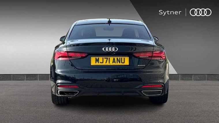 Audi connect safety and service (e-call), Audi connect with Amazon Alexa Integration, Audi drive select (Auto, Comfort, Dynamic, Efficiency and Individual), Audi smartphone interface, Audi virtual cockpit - 12.3" full colour digital instrument cluster, vehicle/engine speed, Radio/media information+Driver assistance systems, Automatic start-stop system with coasting functionality and efficiency programme, Bluetooth interface, Electric boot lid release, Electro-mechanical power steering, Email, calendar and text messages displayed via MMI, Head up Display, MMI nav+ with MMI touch - 10.1" high resolution MMI display, touch sensitive, 3D map, route/country info, dynamic route guide, personal route assist, Park assist system, Service interval indicator, Voice control system, Adaptive sport suspension with damping control, Diesel particulate filter, CD player, DAB digital radio reception, Two additional USB ports for rear passenger in rear centre console, Two SDXC card slots, Audi Beam uses LEDs to project Vorsprung logo, Auto dimming rear view mirror, Black audi rings decal above rear sills, Black door mirror housings, Body colour door handles, Body colour front spoiler lip, Body colour side sill trim, Door mirrors folding with auto-dimming and memory function, Electric adjustable heated door mirrors, Electric front windows, Front fog lights, Honeycomb structure radiator grille in grained matt black, LED daytime running lights, Matrix LED headlights with Audi laser light, dynamic light sequencing and dynamic indicator, Matt aluminium silver tailpipe trim, Panoramic glass sunroof, Privacy glass, Rain and light sensors, Rear diffuser in matt titanium black with trim strip in matt aluminium silver, S model rear spoiler in black, Side air inlets in grained matt black with matt aluminium silver inlay, Sport front and rear bumpers with side skirts, Windscreen with acoustic glazing, 3 spoke high multifunction leather sport steering wheel with paddle shfit and S badging perforated leather grips, 40/20/40 split folding 2 seater rear seat bench with rear centre armrest, Adjustable steering column, Black cloth headlining, Black perforated leather gearknob, Contrast stitching on seats, steering wheel and gear lever gaiter, Deluxe 3 zone electronic climate control, Electrically adjustable front seats with memory function for driver's side, Fine Nappa leather upholstery with front sports seats S embossed logo, Front centre armrest, Front head restraints, Front/rear floor mats, Heated front and outer rear seats, Illuminated door sill trim with S logo, ISOFIX child seat mounting and top tether, Luggage compartment mat, Pneumatically adjustable lumbar support with massage function, Rear headrests, Stainless steel pedals, Sunvisors with vanity mirrors, Black styling pack - A5 Coupe/Sportback, Comfort and sound pack - A5/RS5, Driver assistance pack - Tour - A5, Extended leather pack - A5, 2 x 3-point rear seatbelts, 6 airbags - Driver, front passenger, curtain and side airbags, Electromechanical parking brake, Electronic Stabilisation Control (ESC) including ABS, ASR and EDL, Front passenger airbag deactivation, Height adjustable front seatbelts, Hill hold assist, Multi collision brake assist, Pop-up bonnet for pedestrian protection, Pre sense city, Seatbelt monitoring, Tyre pressure warning, Variable restraint system, Warning triangle and first aid kit, Anti theft alarm system, Anti theft wheel bolts, Immobiliser, Remote central locking, 20" 5 V spoke star design alloy wheels in matt titanium look gloss turned finish, Tool kit, Tyre repair kit,