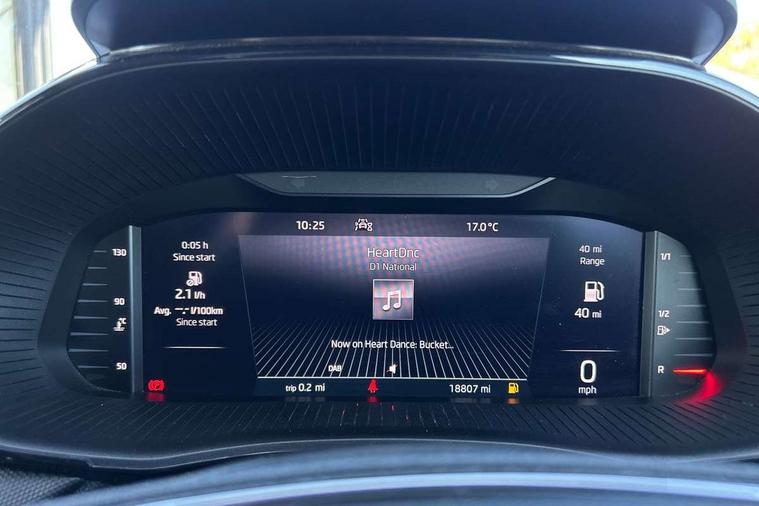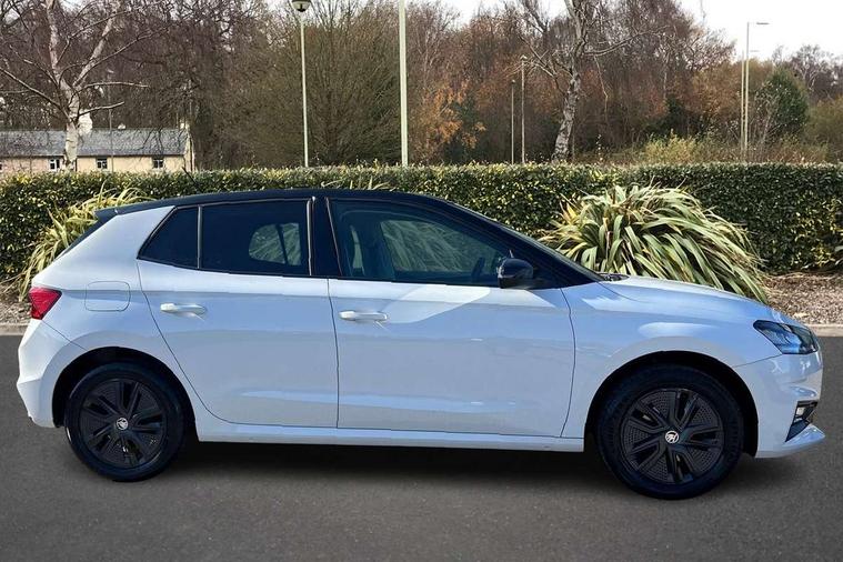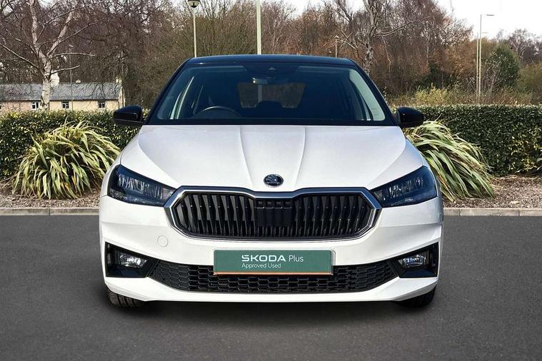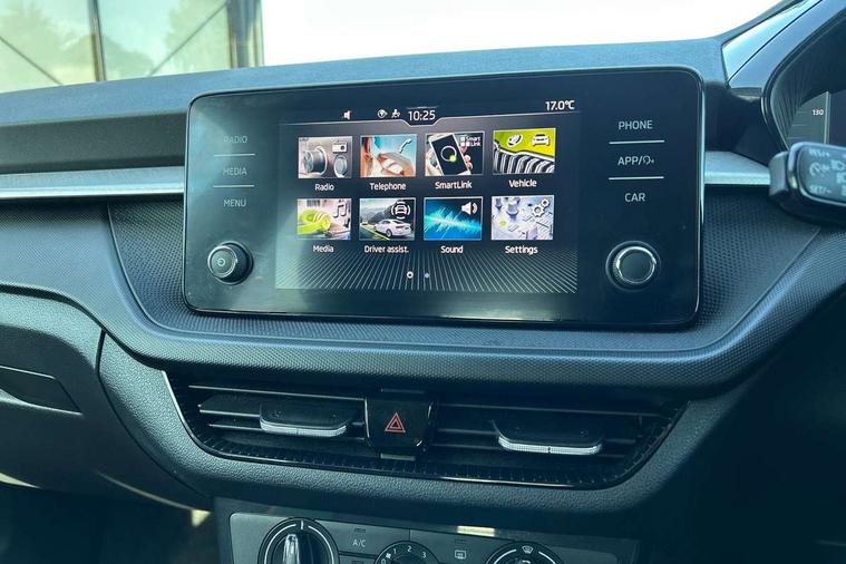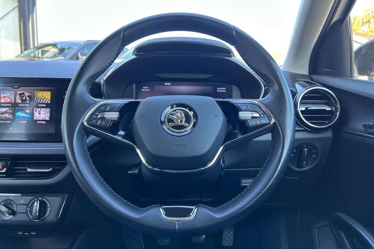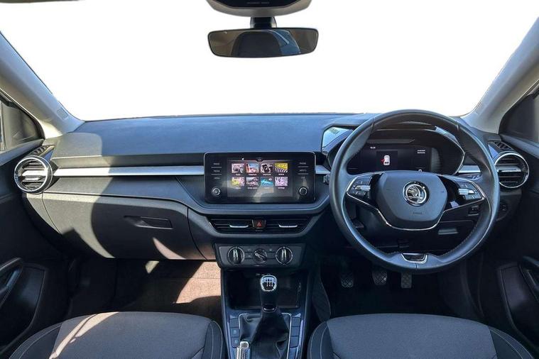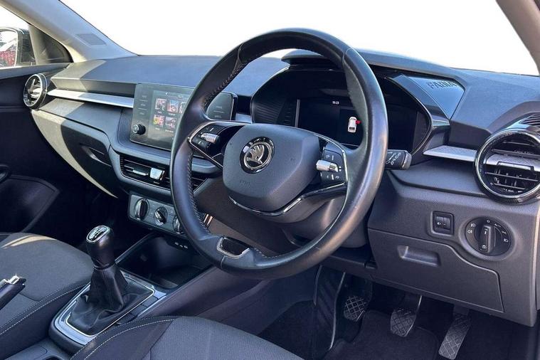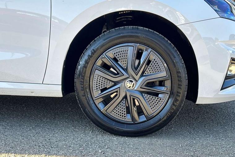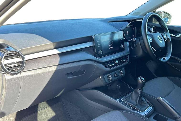 Bluetooth connection, Driver alert system - DAS, Electromechanical power steering, Exterior temperature gauge, Lane assist including road edge detection, Service interval indicator, Virtual cockpit with 10.25" colour display, 2x USB-C in the front (for data transmission and charging), 6 Speakers (4 in front and 2 in rear), Auxiliary socket for external MP3 player, Bolero radio with 8" colour display, DAB digital radio reception, Basic rear lights, Body coloured bumpers, Dimming rear view mirror with black frame, Door mirror integrated indicators, Electrically adjustable and heated door mirrors, Electrically adjustable front windows with function auto up/down, Front window wiper intermittent control, Headlight range control - Automatic, Ice scraper in fuel cap, LED daytime running lights with coming and leaving home feature, Mechanical adjustable rear windows, Privacy glass, Rear LED fog light, Rear side wing doors, Rear window wiper with washing nozzles, Roof mounted spoiler, SKODA tailgate lettering in chrome, Third brake light, 3 rear headrests, Backrest split and folding, Central console with fixed cup holder and storage box, Chrome handbrake release button, Fabric upholstery, Gearshift knob/handle in leather, Grain satin black interior door handles, Hand brake lever handle in leather, Height adjustable front headrests, Height adjustable steering wheel, ISOFIX and TopTether anchorage points to the outer rear seats, ISOFIX and TopTether on the front passenger seat, Luggage compartment lighting, Pollen filter, Rear seat bench unsplit, Single front passenger seat, Storm grey headlining, Sun visors with mirror and airbag label on passenger side, Ticket holder, Umbrella in drivers door, 3-point height adjustable front seats belts with pretensioner and force limiter, Automatic warning lights in case of crash, Driver and passengers airbag with switch off function, e-Call+, ESC including ABS, MSR, ASR, EDS, HBA and XDS, Front and rear seat belt warning, FRONT ASSIST (AEB City and AEB Inter Urban), Front side airbags, Head airbags, One tone horn, Pedestrian protection, Three rear 3-points safety seat belts with pretensioner and force limiter including stop function for outer rear seat belts, Tyre pressure monitoring system, Anti-theft alarm system including immobiliser, interior monitoring, backup horn, and towing protection, Anodized cross line upper decorative trim, Colour Edition air vents, Grain satin black central console cover, Grain satin black lower decorative trim, Satin black door and side trim panel in front, Anti-theft wheel bolts protection, Super-low rolling resistance tyres,