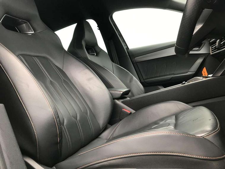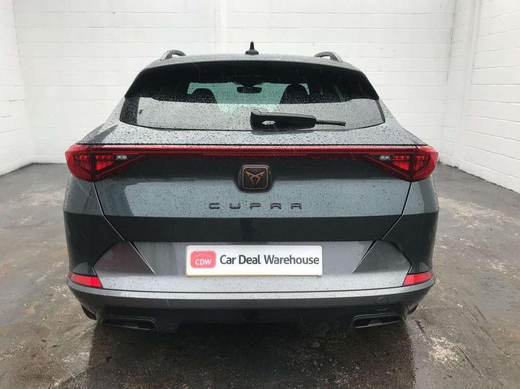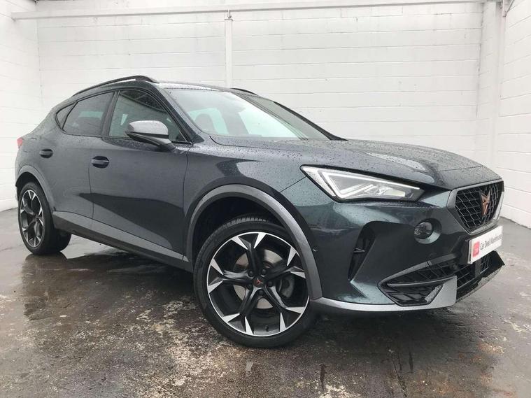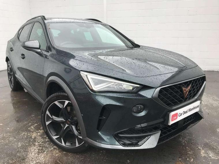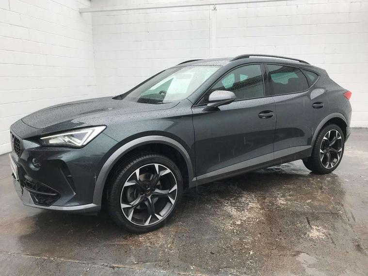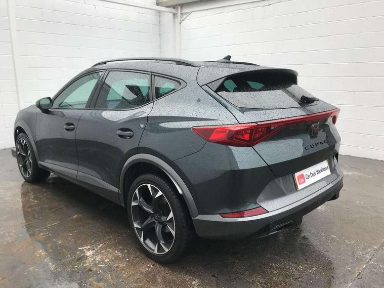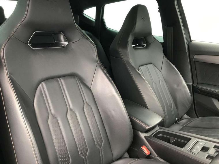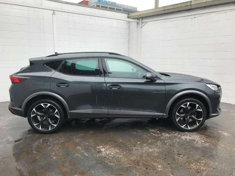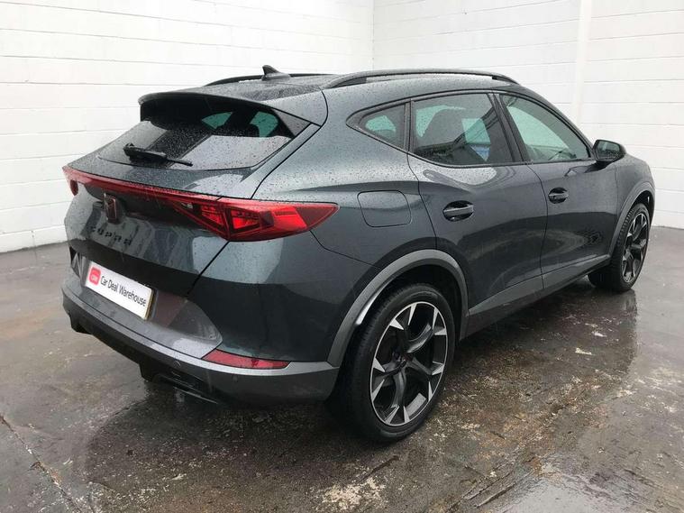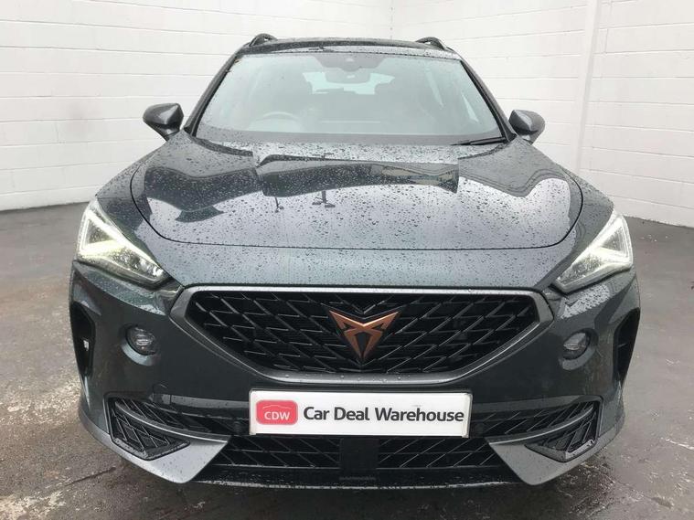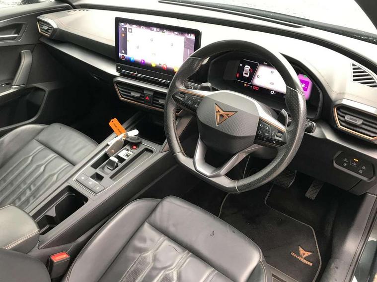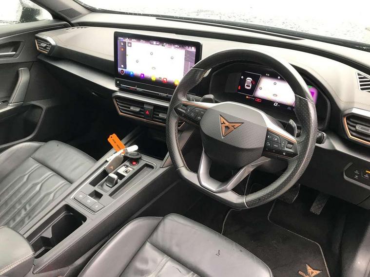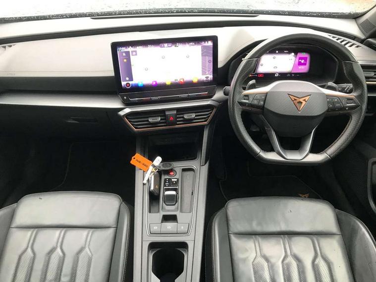 Digital cockpit and configurable dashboard, Driver alert system, Driving profile selection, Forward collision warning with automatic braking, Park assist (inc front/rear parking sensors), PAS, Predictive adaptive cruise control with speed limiter, Rear view camera, RPM, trip computer, outside temp gauge, instrument light brightness, low fuel warning light, lights on reminder, gearshift indicator, Service interval indicator, Start/stop system with regenerative braking, Wireless apple carplay, Wireless phone charger, Electronic locking differential and dynamic traction support, Standard suspension, 2 front and 2 rear USB type C sockets, Auxiliary input socket, DAB radio, Auto dimming rear view mirror, Body colour door handles, Body coloured bumpers, Dark grey wing mirror, Daytime running light with automatic headlight control and coming home feature, Dynamic headlight range control, Electric front/rear windows, Electrically adjustable, heated and folding door mirrors, Front fog lamps with cornering function, Gloss black roof rails and window surrounds, LED Headlights, LED Taillights with dynamic indicator, Rain sensing wipers, Rear diffuser with black simulated exhaust pipes, Rear wash/wipe, Tinted rear windows, Welcome lights, 12v power supply in centre console, 12v socket in loadspace, 2 front and 2 rear reading lights, 230V socket, 60/40 split rear bench seat with armrest and mechanical seat release, Black headlining, Dust/pollen filter, Front and rear head restraints, Front centre armrest, Heated steering wheel, Height/reach adjust steering wheel, Illuminated interior front door sills, Illuminated sunvisor with mirror, Interior ambient lighting, Isofix, Leather multi function steering wheel with gear shift paddles, Luggage tie-down hooks, Three zone climate control, Three zone climate control with control panel in rear, Variable luggage/load compartment floor, Wraparound lighting, Genuine Nappa leather Pack - Cupra, Navigation system pack - Formentor, 3 point seatbelts on all rear seats, ABS, Brake control system - ESC and brake booster, Child proof door locks, Driver and front passenger airbags with front passenger airbag de-activation, Electronic parking brake, Front and rear disc brakes, Front side curtain airbags, Hill hold control, Seat belt reminder for front and rear seats, Tyre pressure monitoring system, Anti theft alarm system, Keyless entry and start system (KESSY), Locking wheel bolts, Copper and aluminium interior detailing, 19" Exclusive machined sport matt black and silver alloy wheels with 94W tyres,